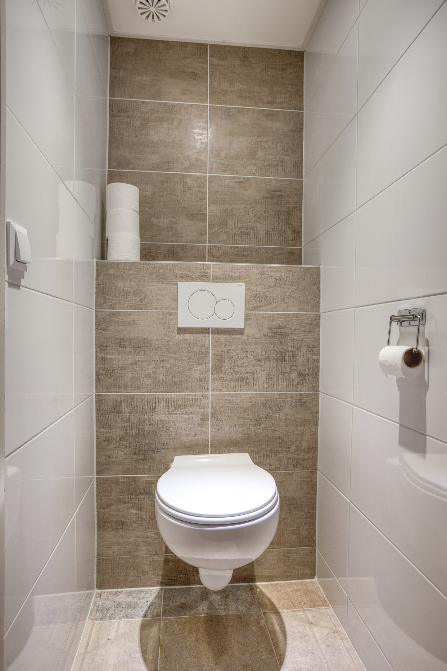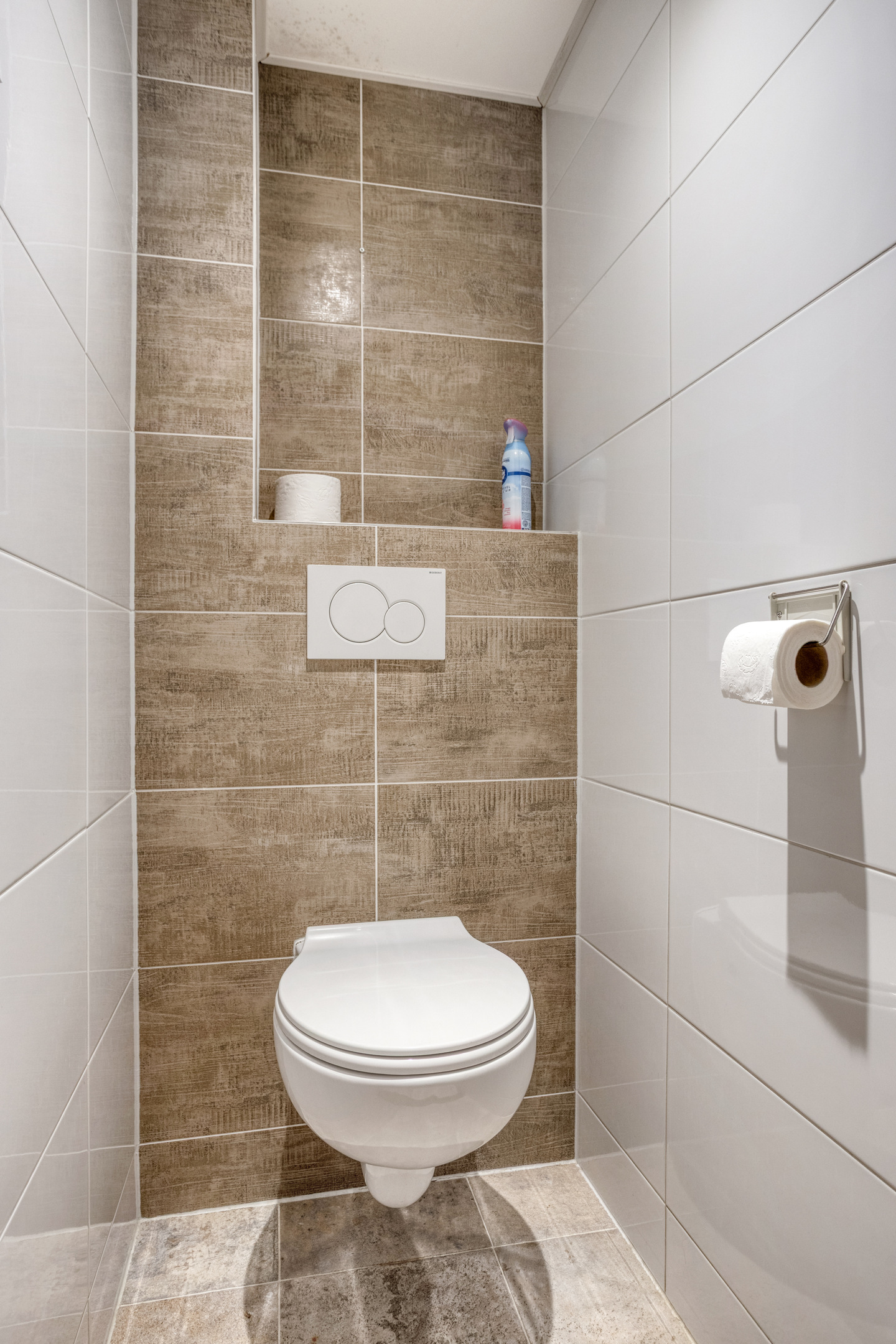 Het toilet is voorzien van een hangcloset en volledig betegeld.