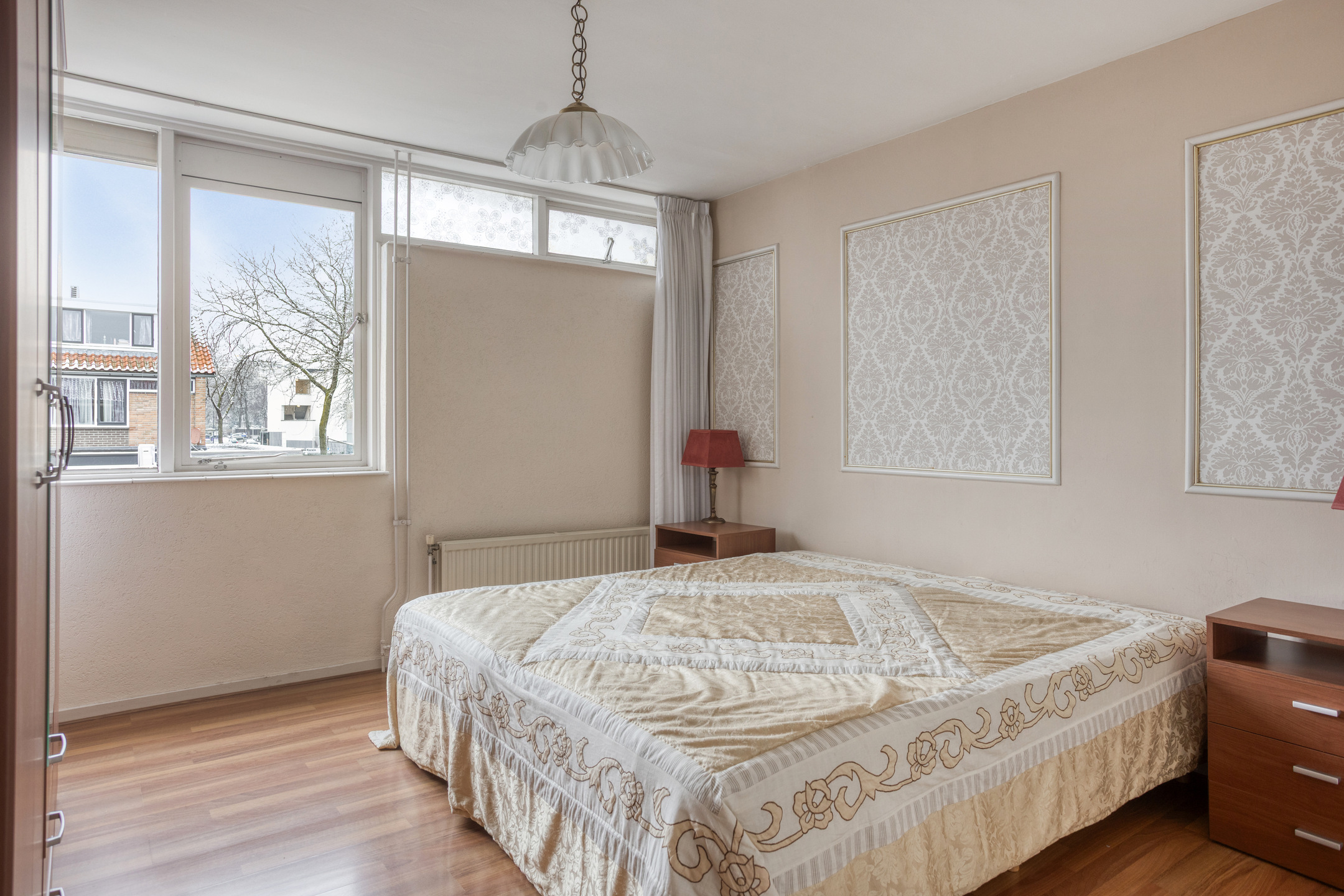 Grote slaapkamer met breed raam en inbouwkast. De achterzijde is voorzien van rolluiken.