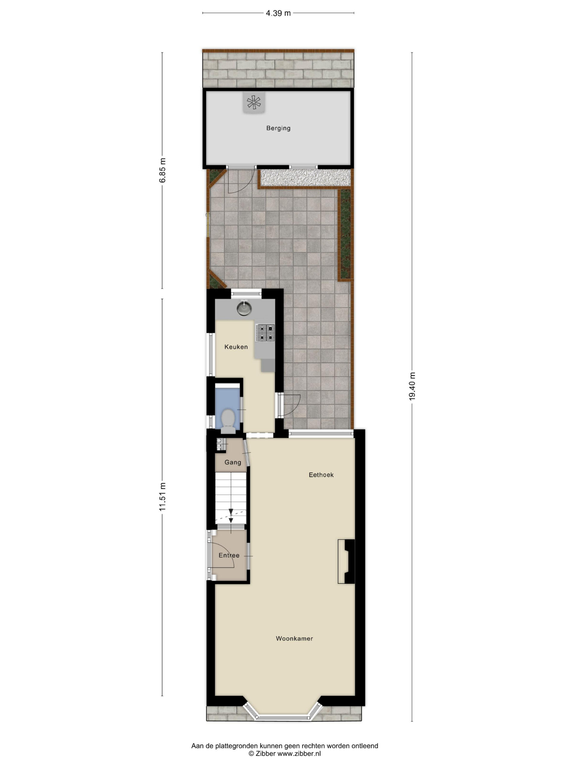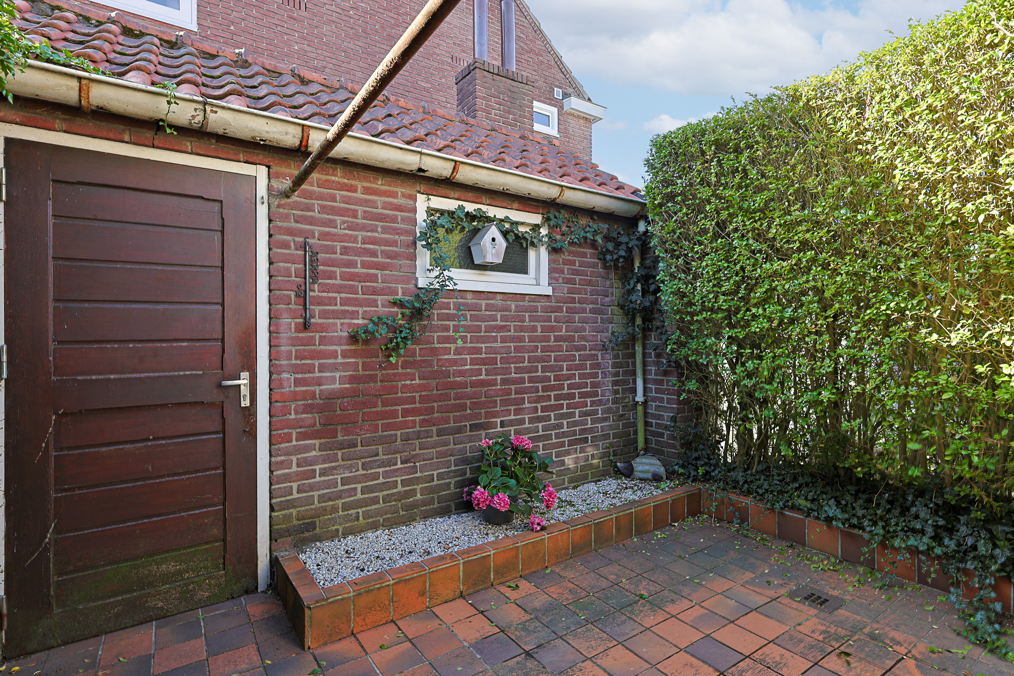 De tuin is gelegen op het zuiden en is grotendeels betegeld, maar beschikt over volwassen beplanting, waardoor er toch een groen en levendig gevoel ontstaat. Aan de zijkant is een achterom aanwezig, en de berging bevindt zich achterin de tuin. De berging is van steen en voorzien van elektra.