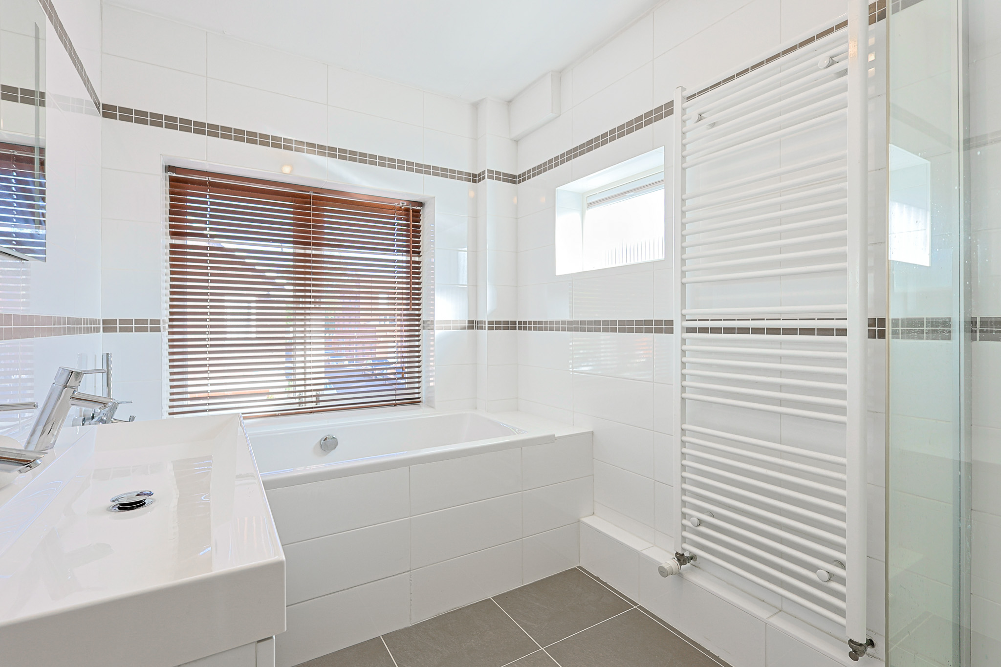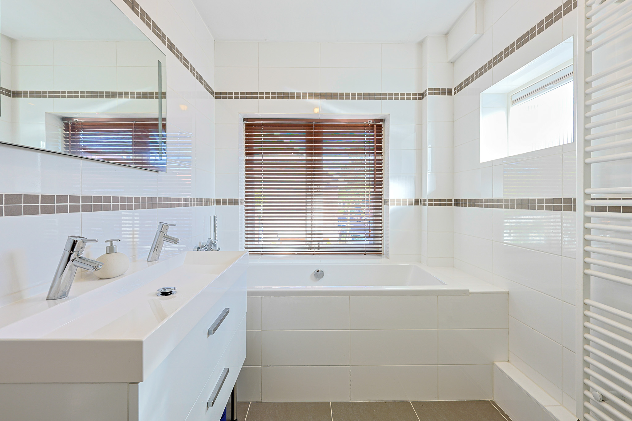De badkamer heeft een tegelvloer en volledig betegelde wanden in een lichte kleur. Deze is uitgerust met een ligbad, een dubbele wastafel met meubel en een douche. Een raam zorgt voor natuurlijk licht.