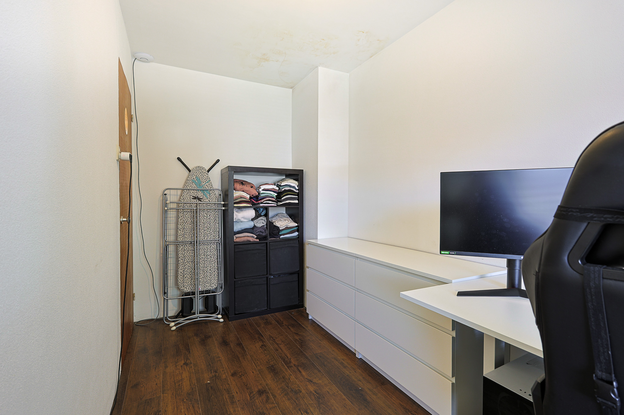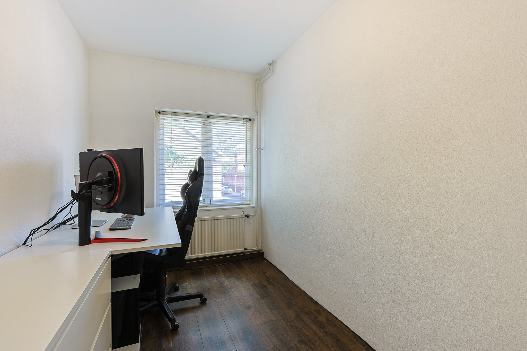 Deze slaapkamer ligt aan de voorzijde van de woning en wordt momenteel als werkkamer gebruikt.