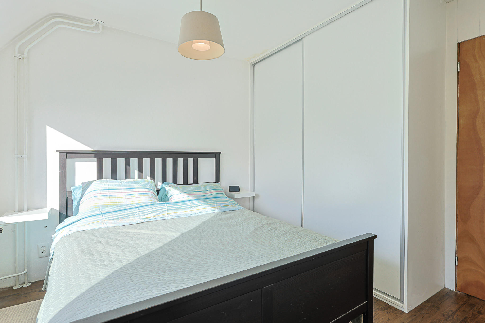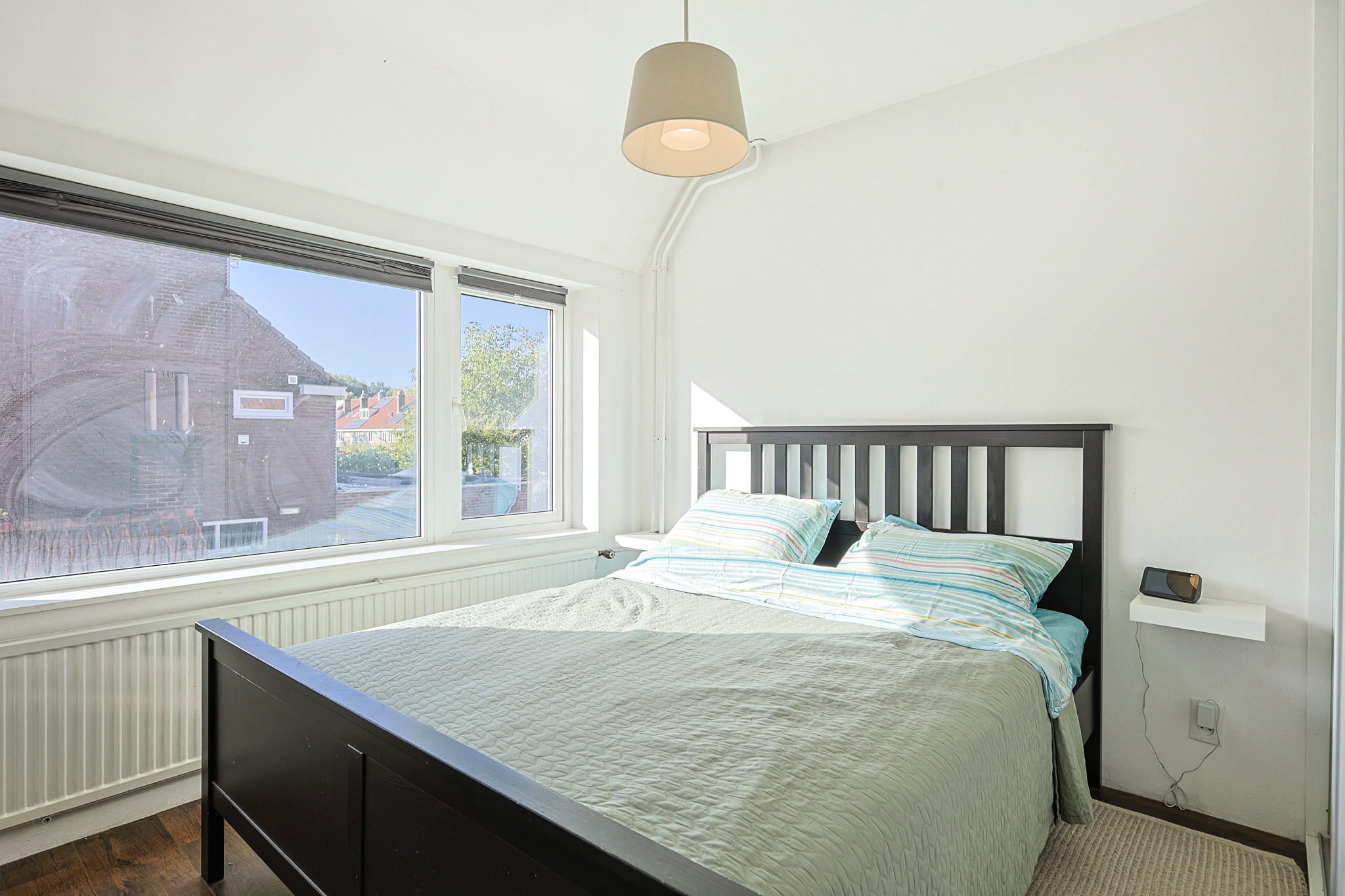 De master bedroom ligt aan de achterzijde van de woning en is voorzien van een inbouwkast. Een groot raam met een los draairaam zorgt voor licht en ventilatie. De originele deur biedt toegang tot de zolder.
