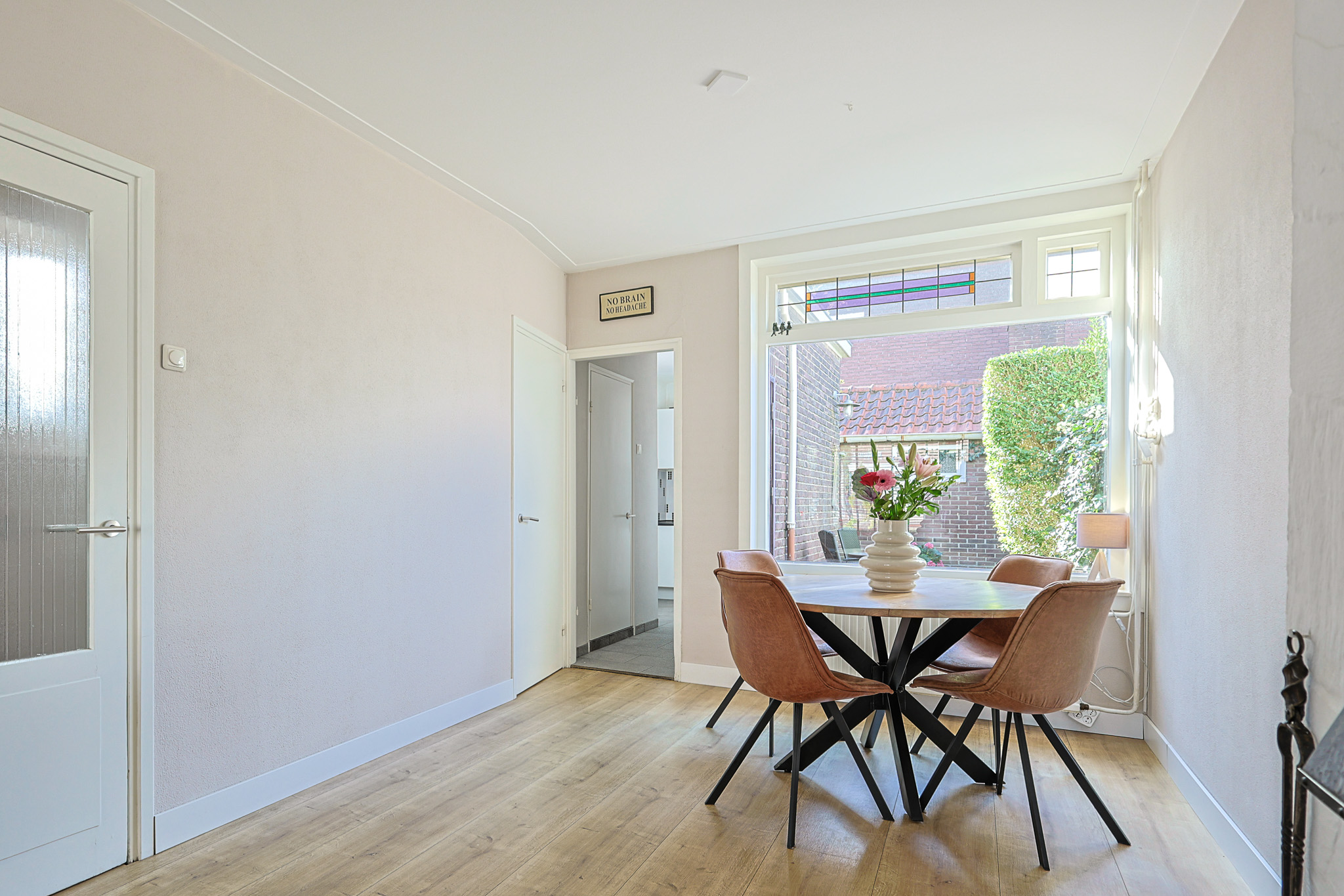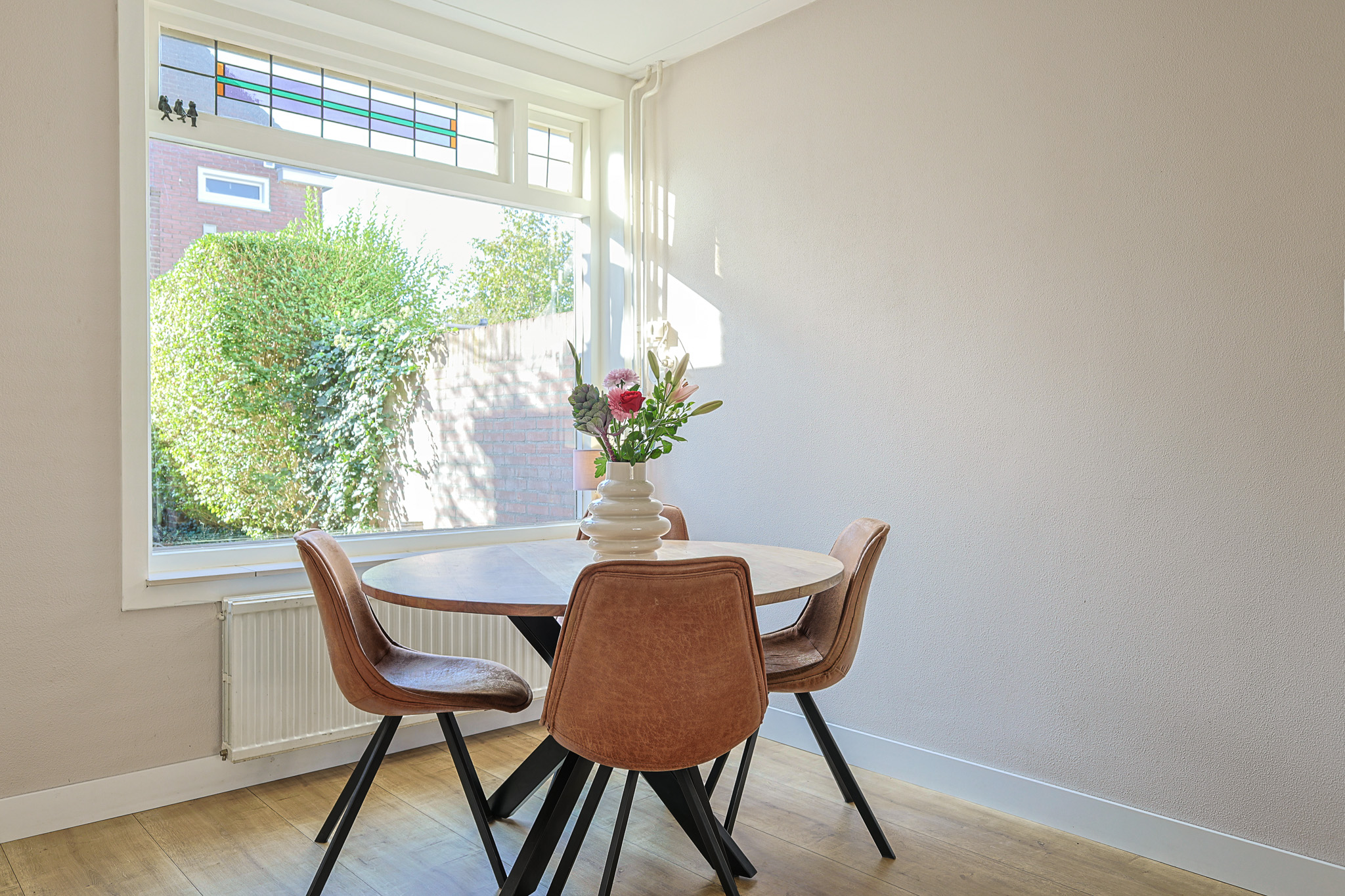 Achter in de woonkamer bevindt zich de eethoek, met zicht op de tuin. Het raam is aan de bovenzijde voorzien van glas-in-lood en een apart kiepraam. Aan de achtergevel zijn zowel een rolluik als een zonnescherm bevestigd. Vanuit de woonkamer heeft u toegang tot de eerste verdieping en de keuken.