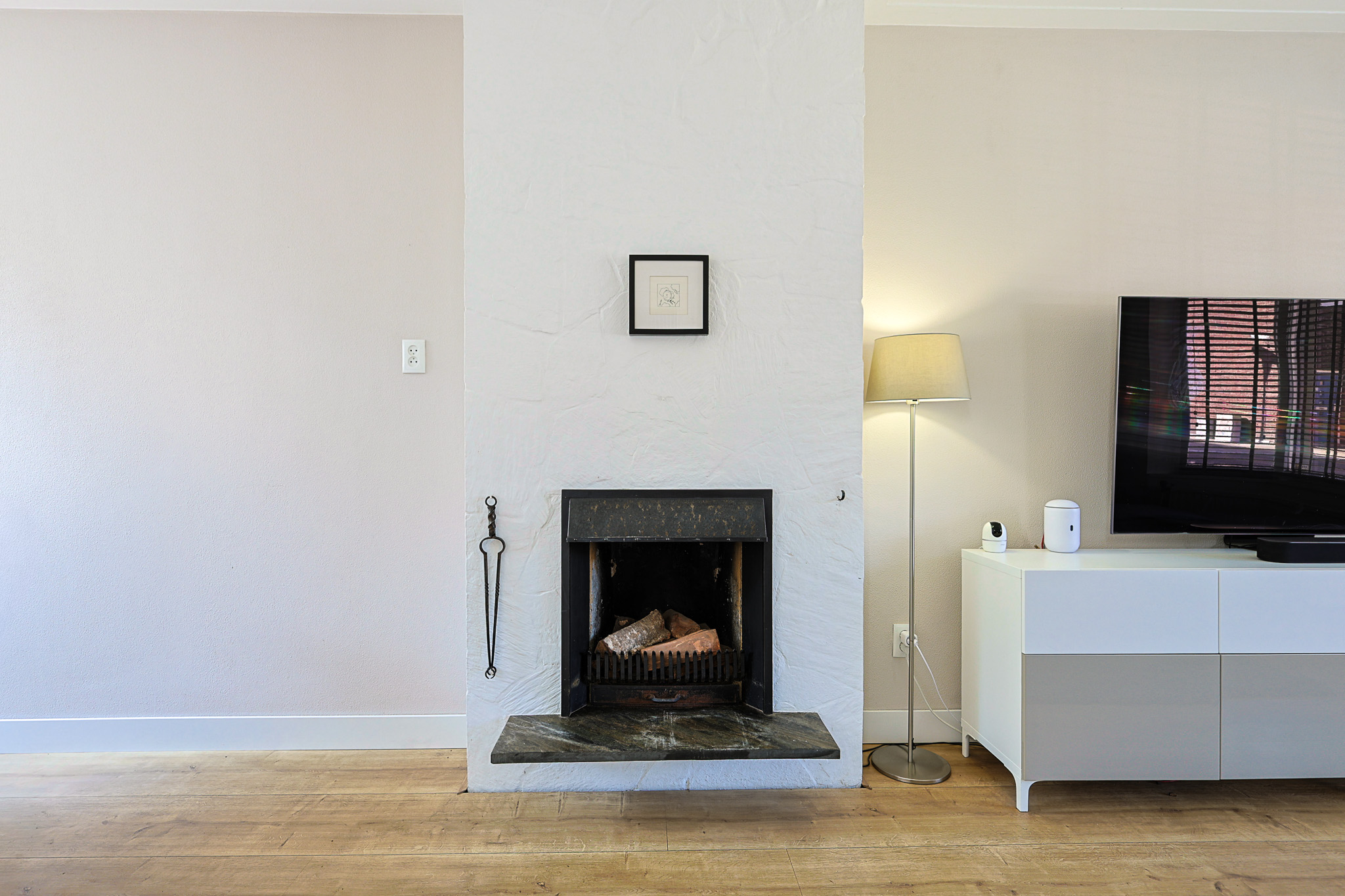 Centraal in de woonkamer staat een houtkachel, die al geruime tijd niet meer in gebruik is.