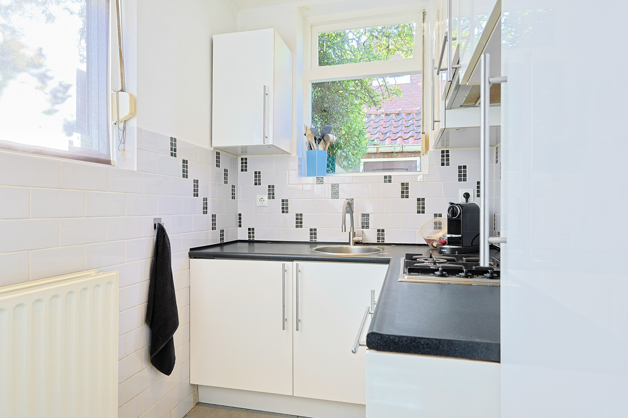 De gesloten keuken ligt aan de achterzijde van de woning en is voorzien van een tegelvloer. Twee ramen met rolluiken en inbouwspots in het plafond zorgen samen voor natuurlijke lichtinval en verlichting. De L-vormige opstelling biedt zowel boven- als onderkasten, waardoor er voldoende bergruimte is. Daarnaast zijn een 4-pits gaskookplaat, vaatwasser en koelkast ingebouwd. Vanuit de keuken is er toegang tot zowel het separate toilet als de tuin.