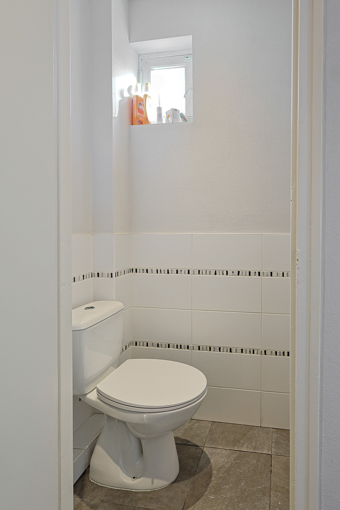 De wanden van het toilet zijn deels betegeld en de vloer is afgewerkt met dezelfde tegels als in de keuken. Er is een staand closet geplaatst en een draairaam aanwezig.