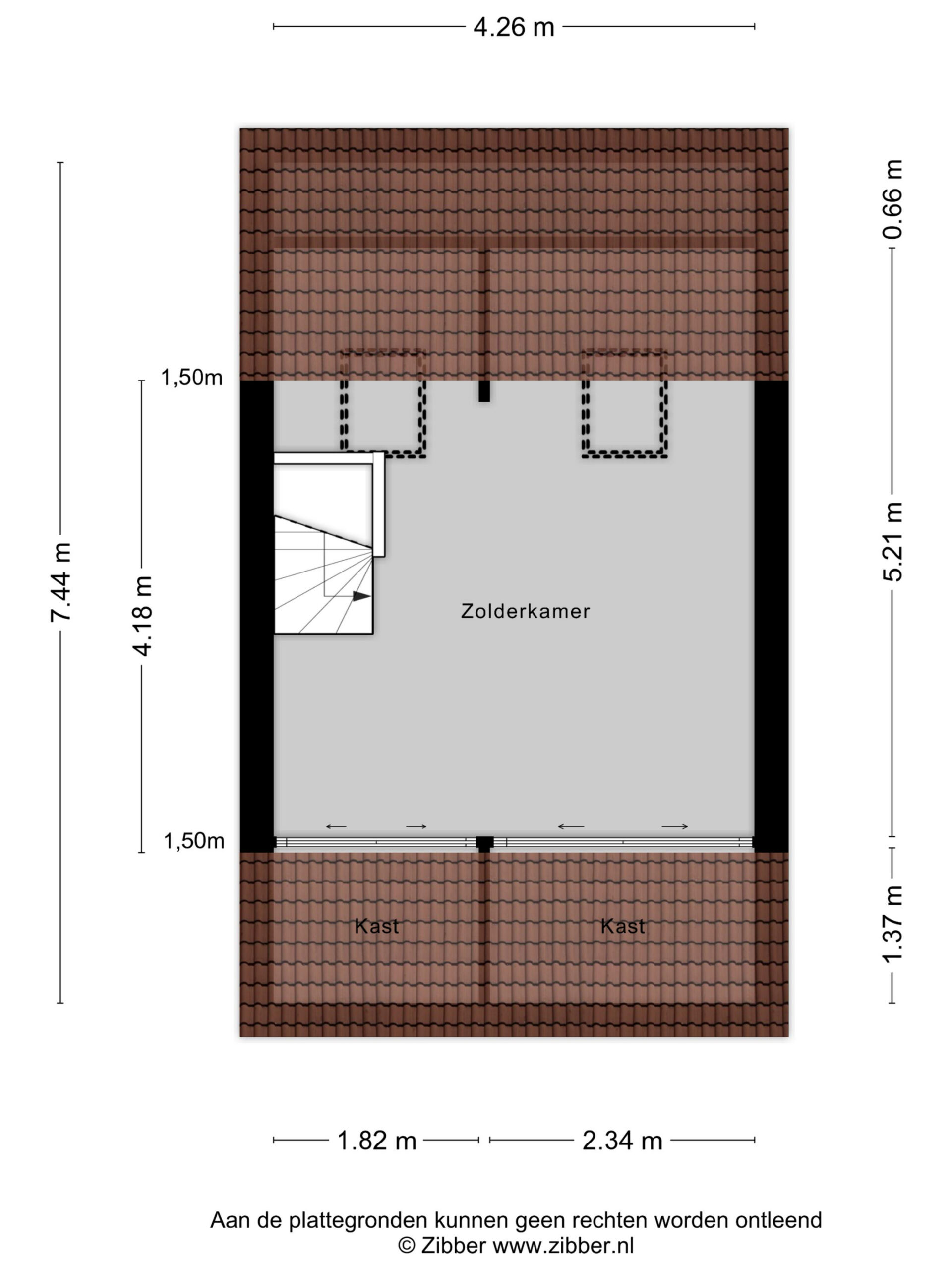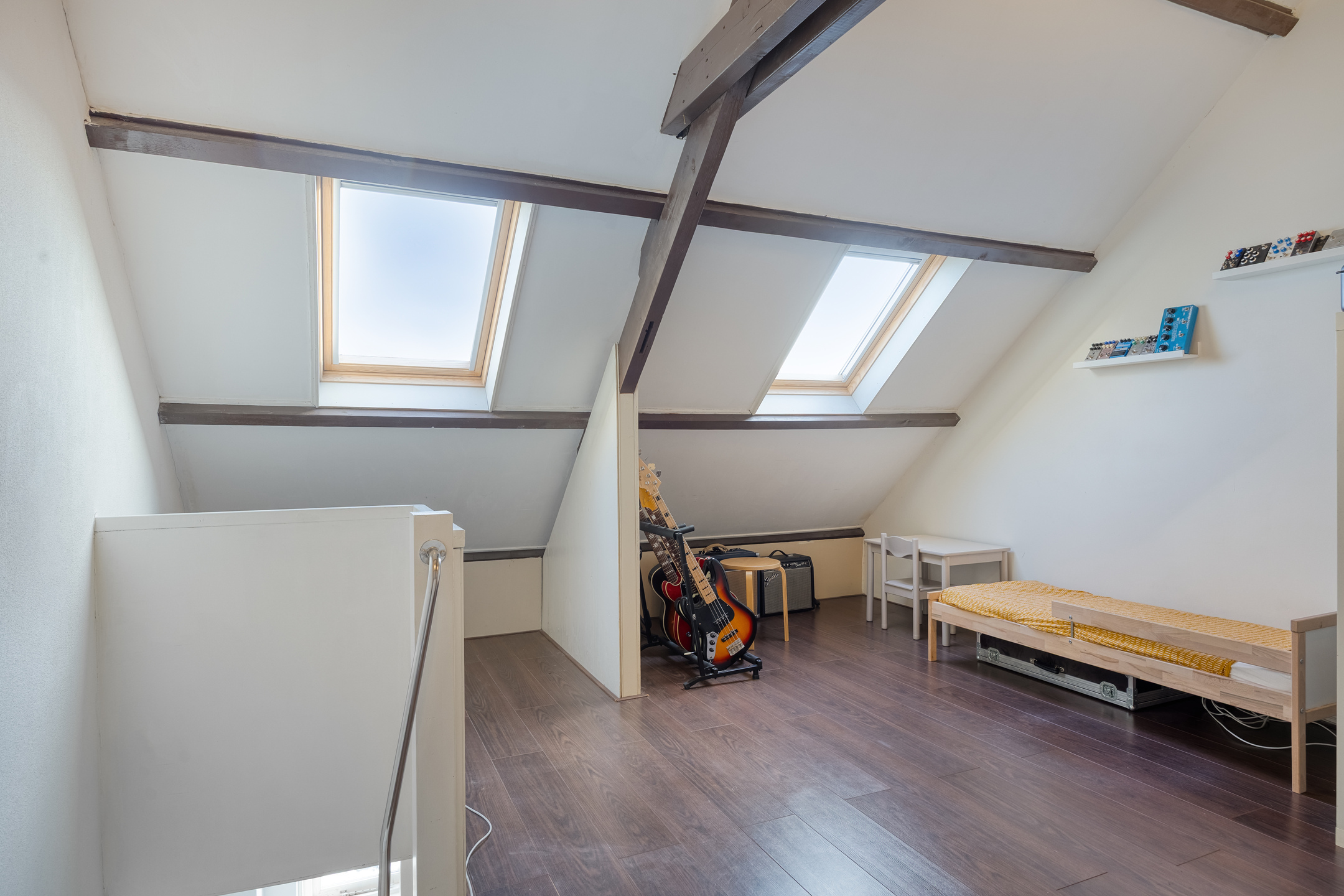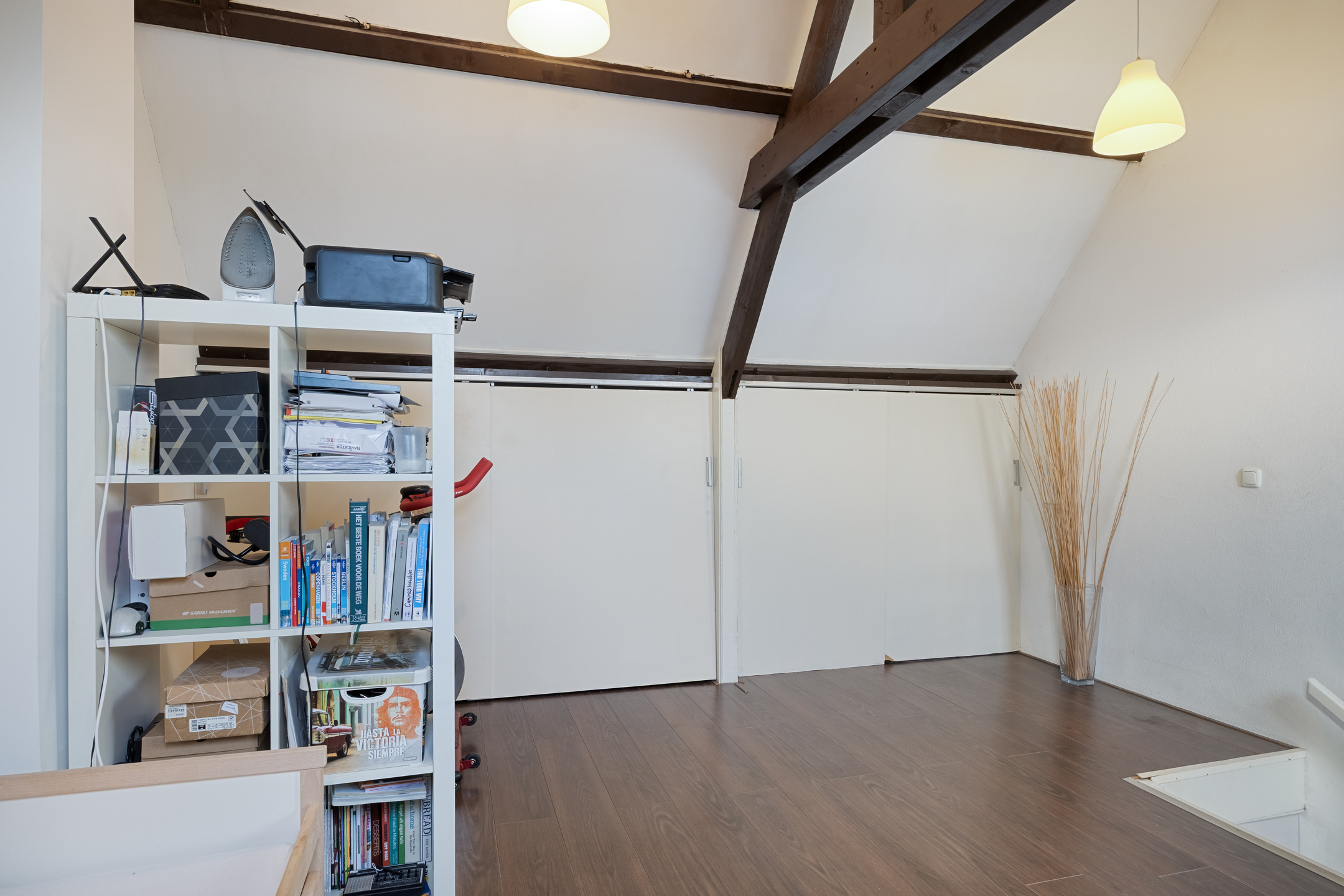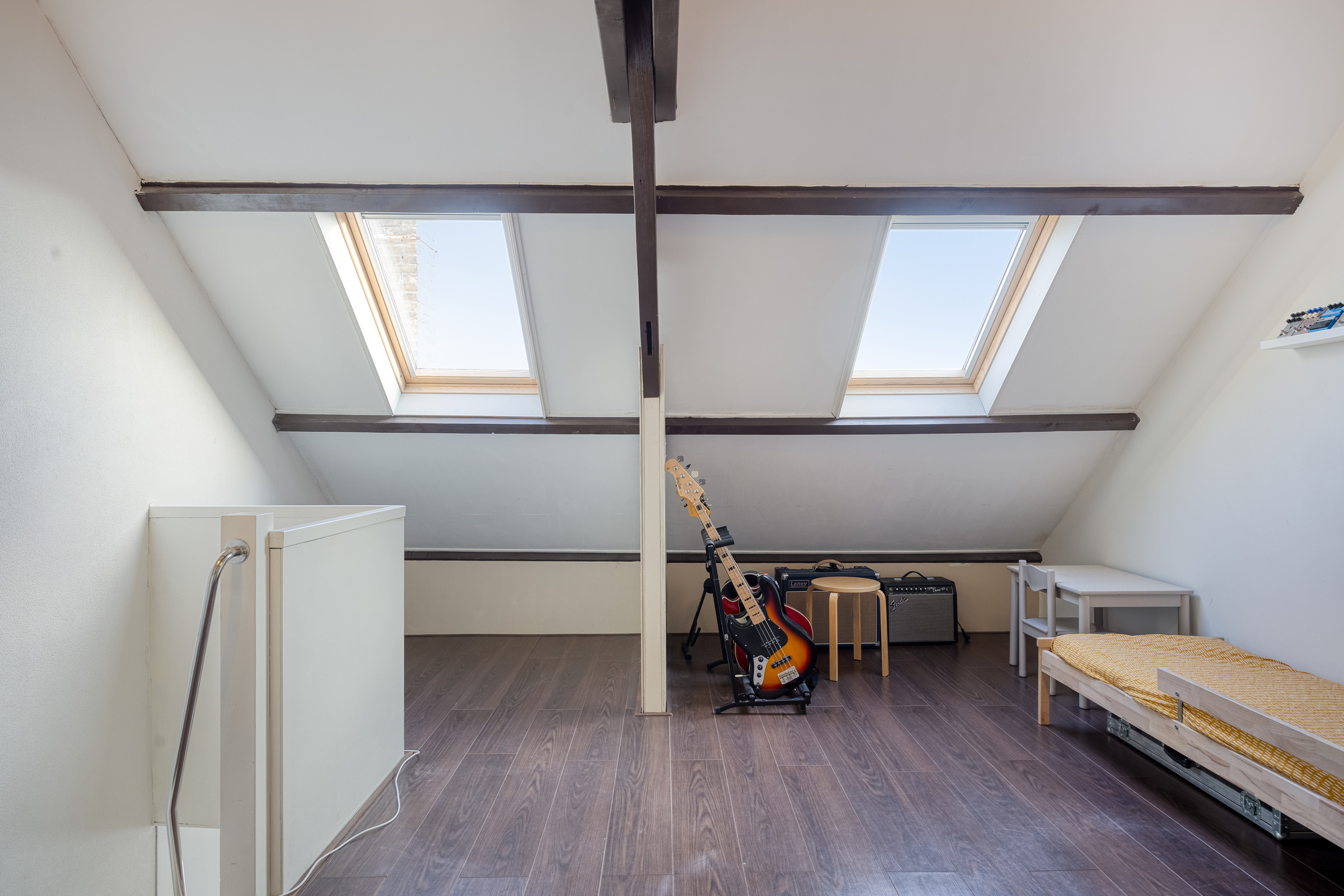 De zolderverdieping is bereikbaar via een vaste trap en is netjes afgewerkt. Twee dakramen zorgen voor daglicht en de schuine kanten bieden veel bergruimte, die is afgewerkt met schuifdeuren. De zichtbare houten balkenconstructie draagt bij aan de karaktervolle uitstraling van deze verdieping.