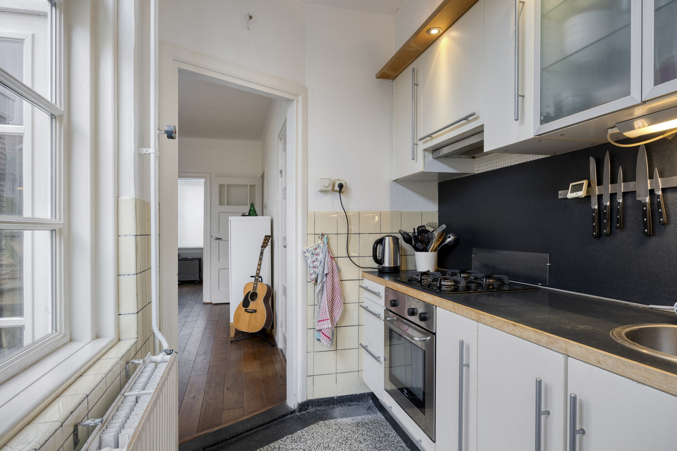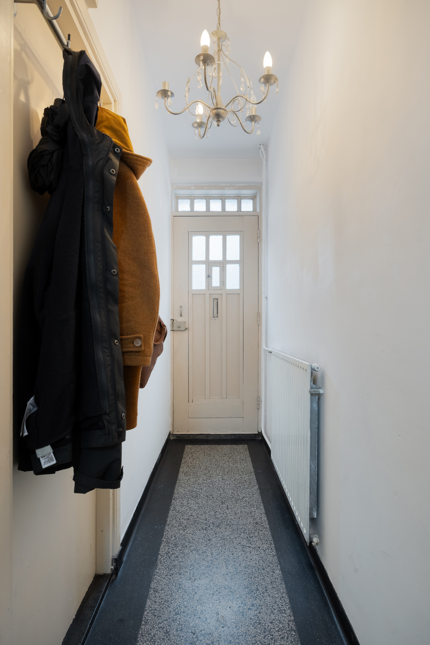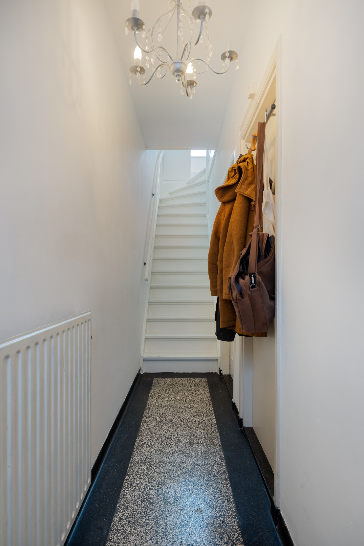 Via de voordeur kom je binnen in de hal, die is afgewerkt met een karakteristieke terrazzovloer. Vanuit hier is er toegang tot de trap naar de eerste verdieping, de woonkamer en het eetgedeelte. De hal biedt ruimte voor een kapstok en vormt een sfeervolle binnenkomst die direct past bij het bouwjaar van de woning.