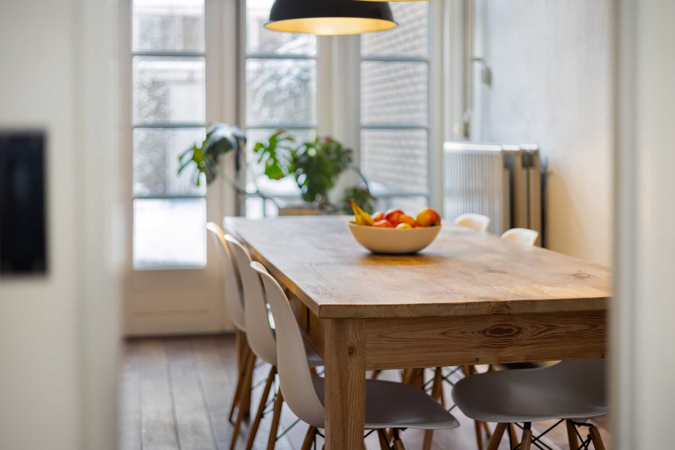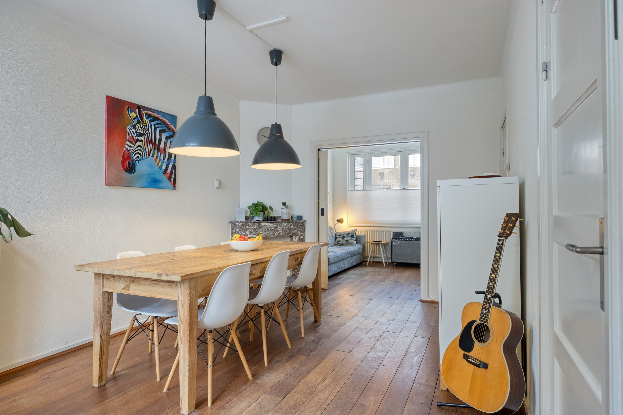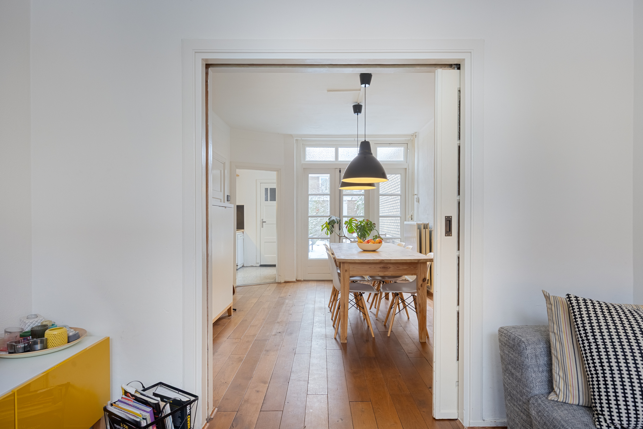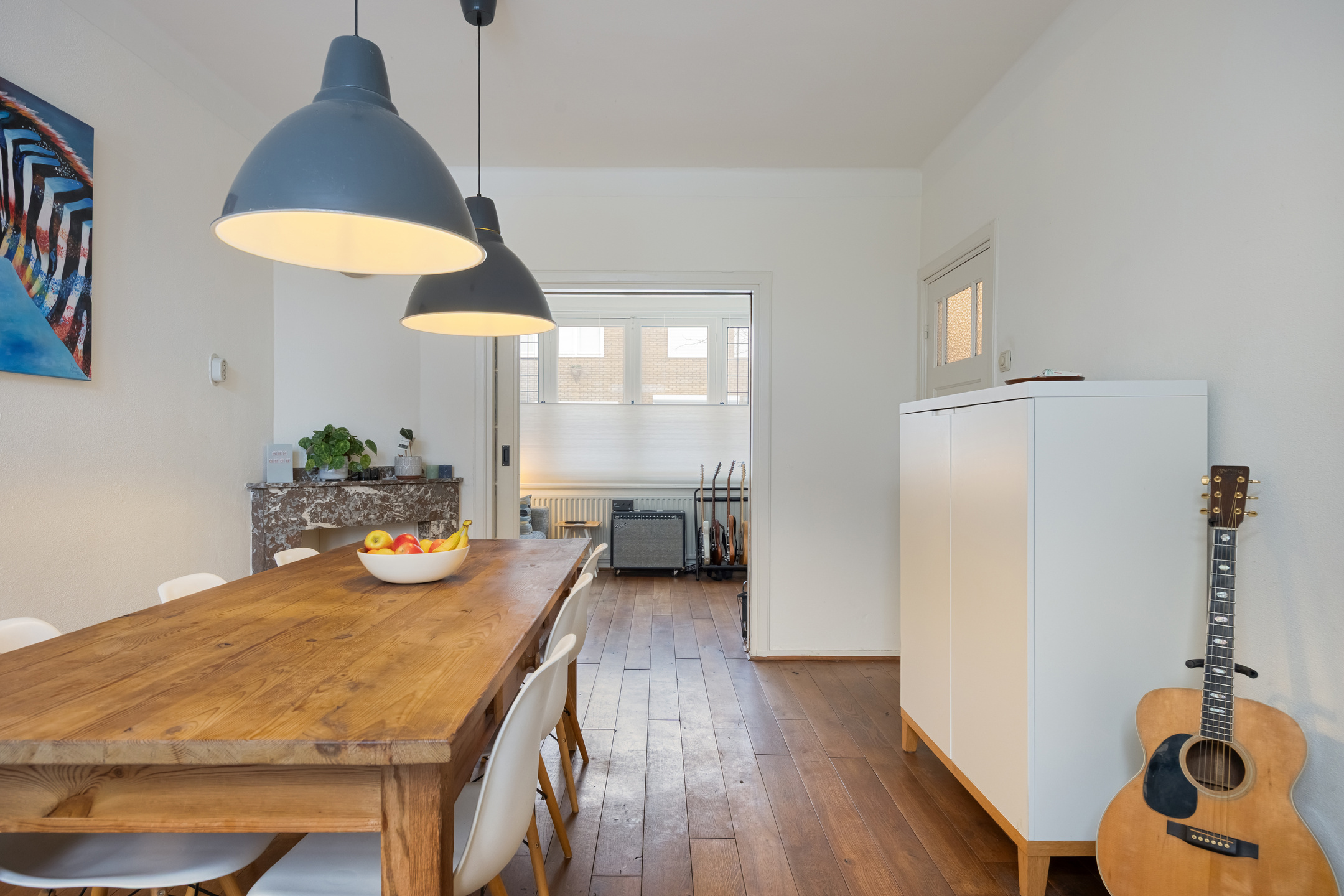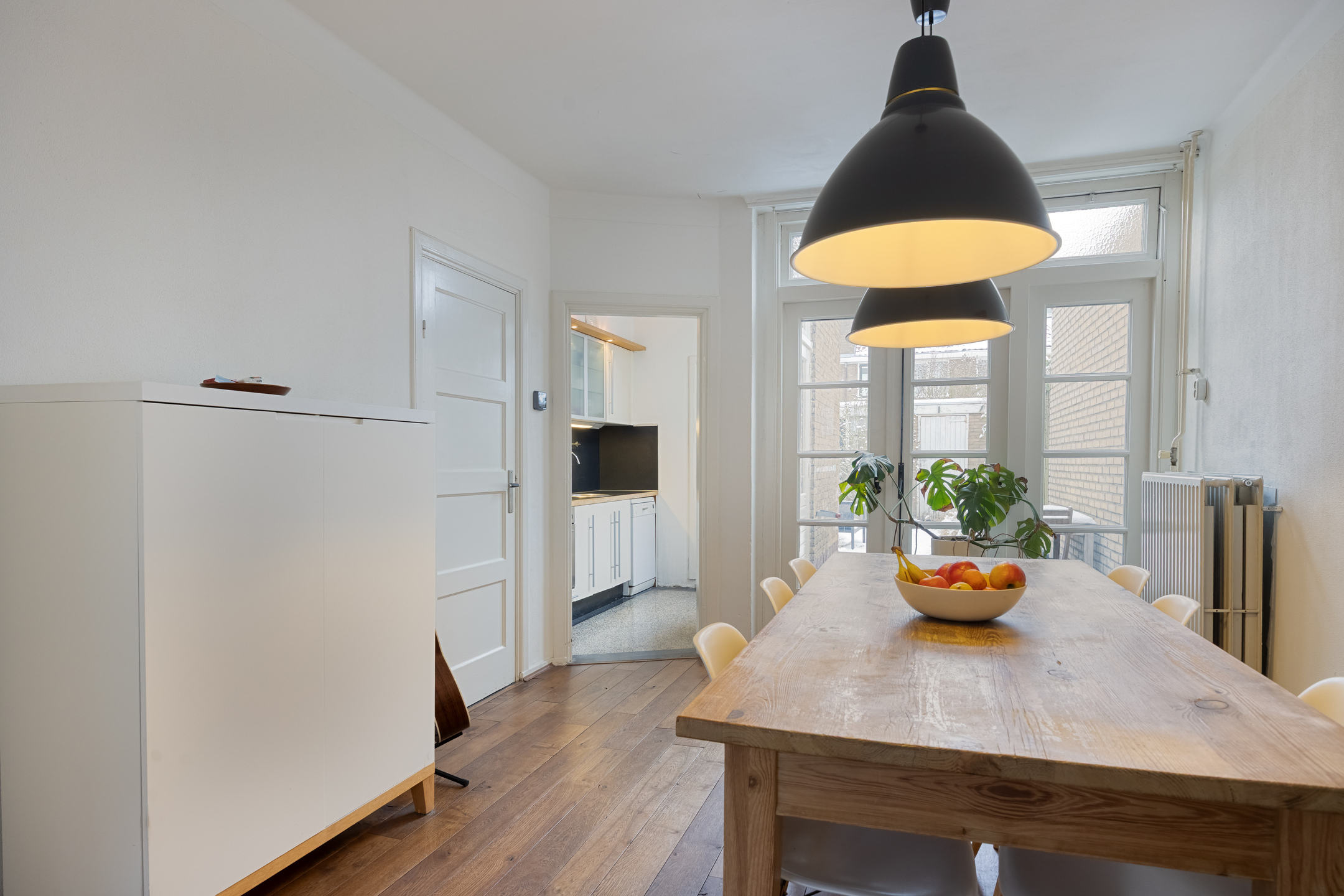 Het eetgedeelte ligt aan de achterzijde van de woning en kijkt uit op de tuin. De originele open haard is niet meer in gebruik en momenteel afgedekt. Via openslaande deuren is er direct contact met de tuin, wat zorgt voor een prettige verbinding tussen binnen en buiten.
