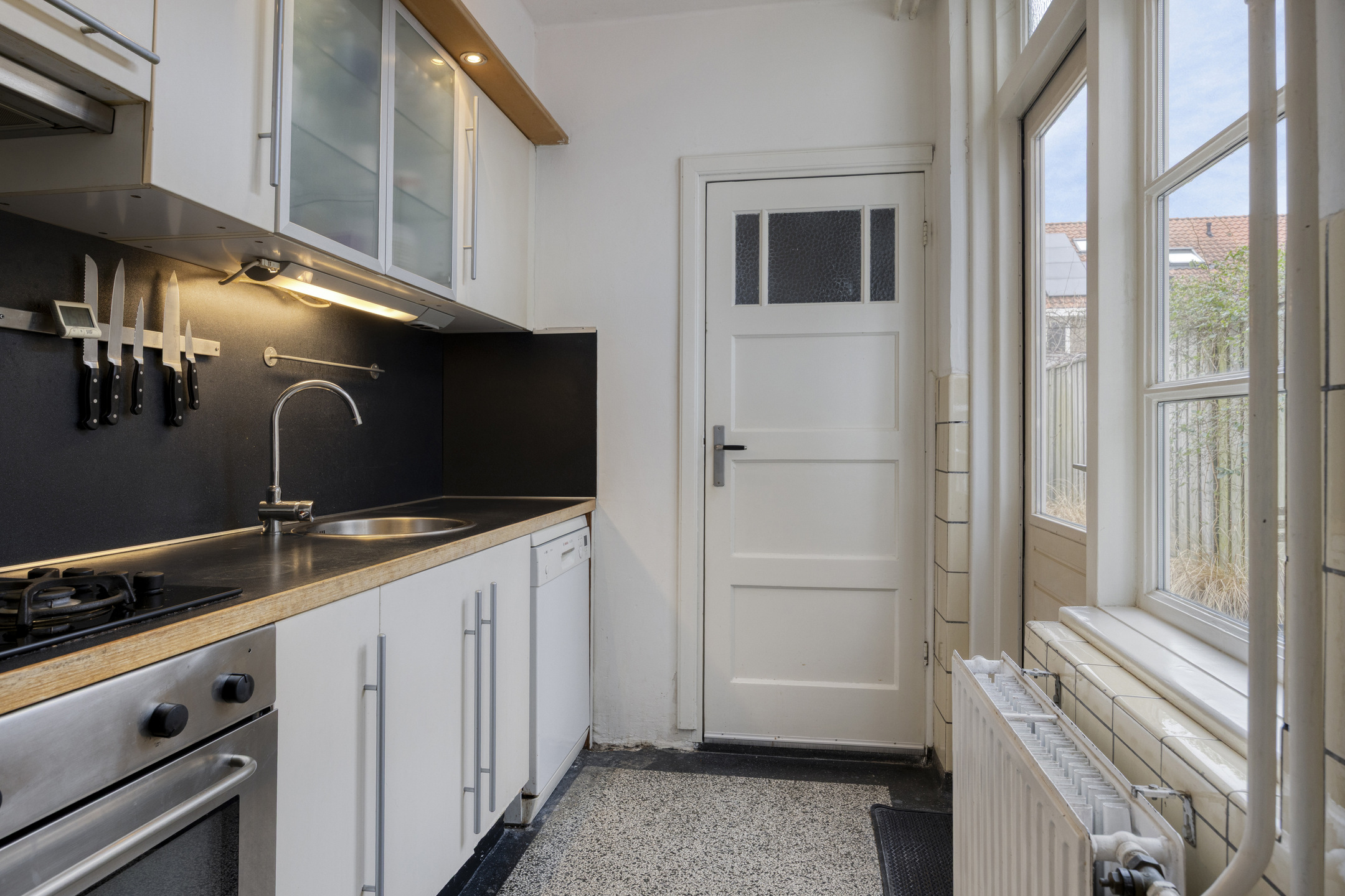 De keuken is bereikbaar vanuit het eetgedeelte en voorzien van een terrazzovloer. De keuken beschikt over een 4-pits gasfornuis, een oven en een deur naar de tuin. Vanuit de keuken is er toegang tot het volledig betegelde toilet en de wasruimte met aansluitingen voor wasmachine en droger.