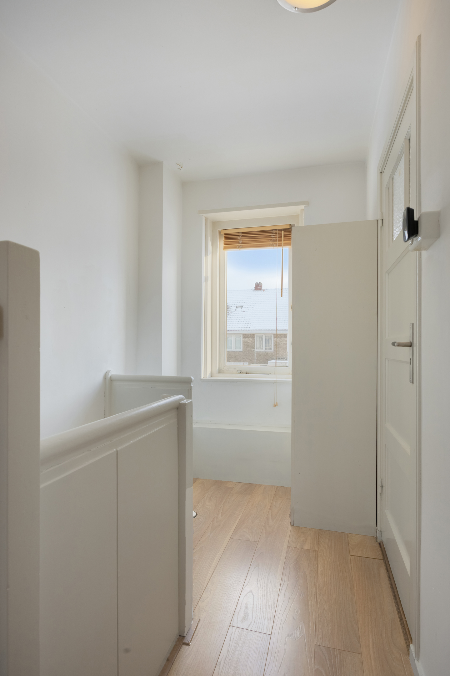 De overloop is afgewerkt met laminaat en geeft toegang tot twee slaapkamers, de badkamer en de trap naar de tweede verdieping.