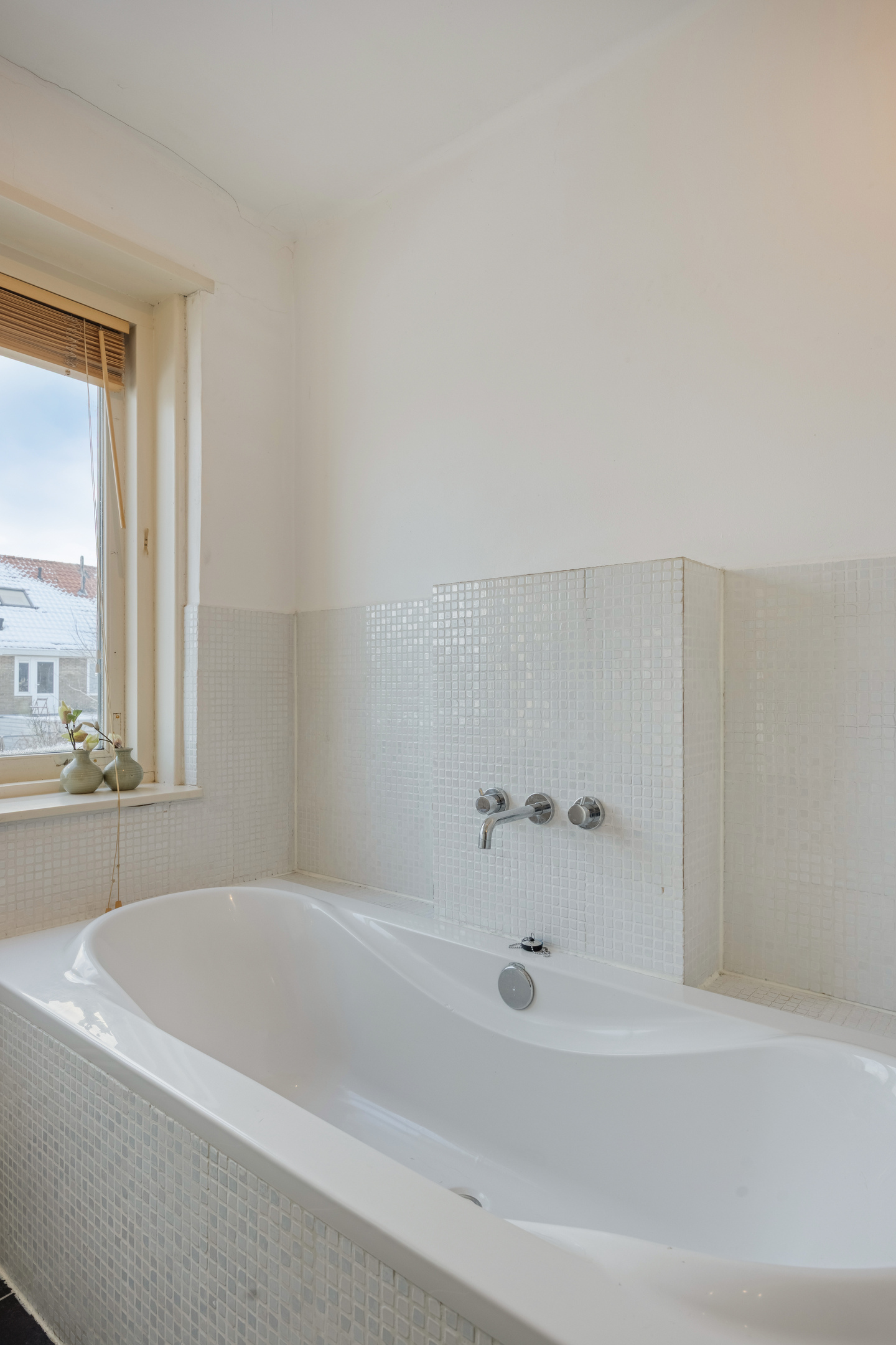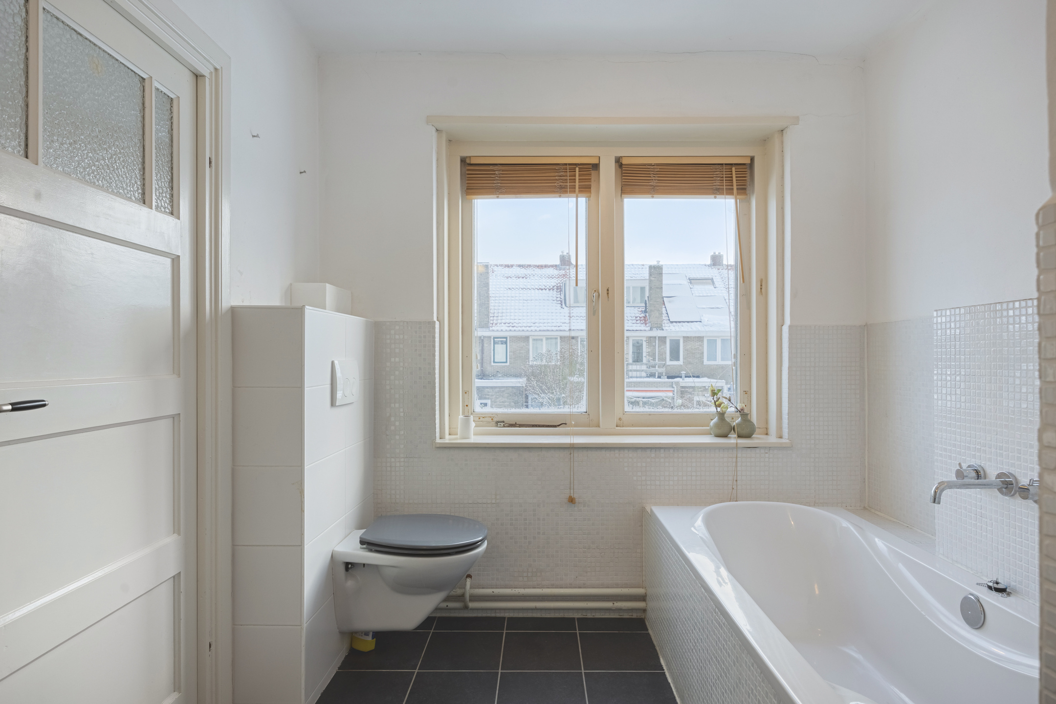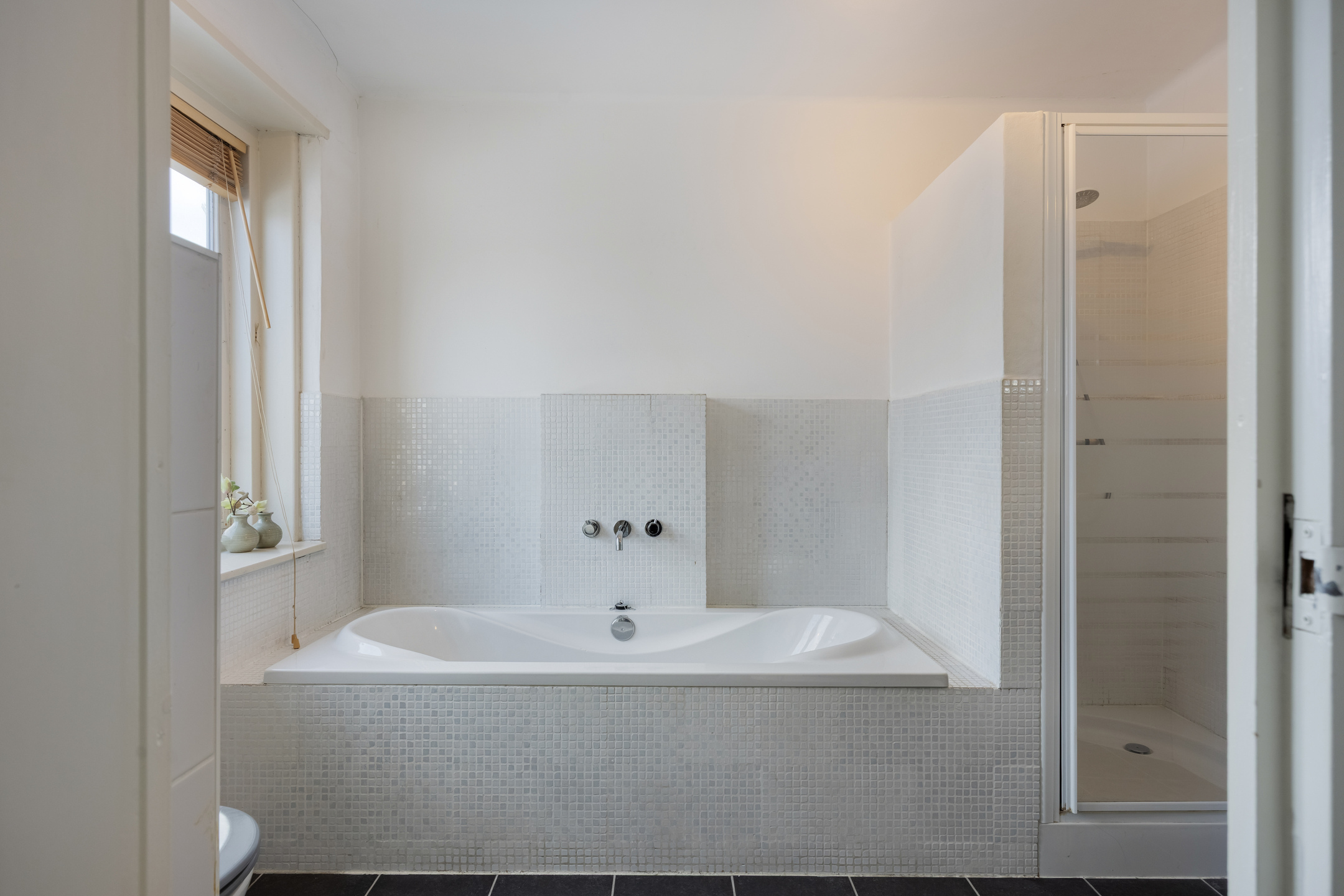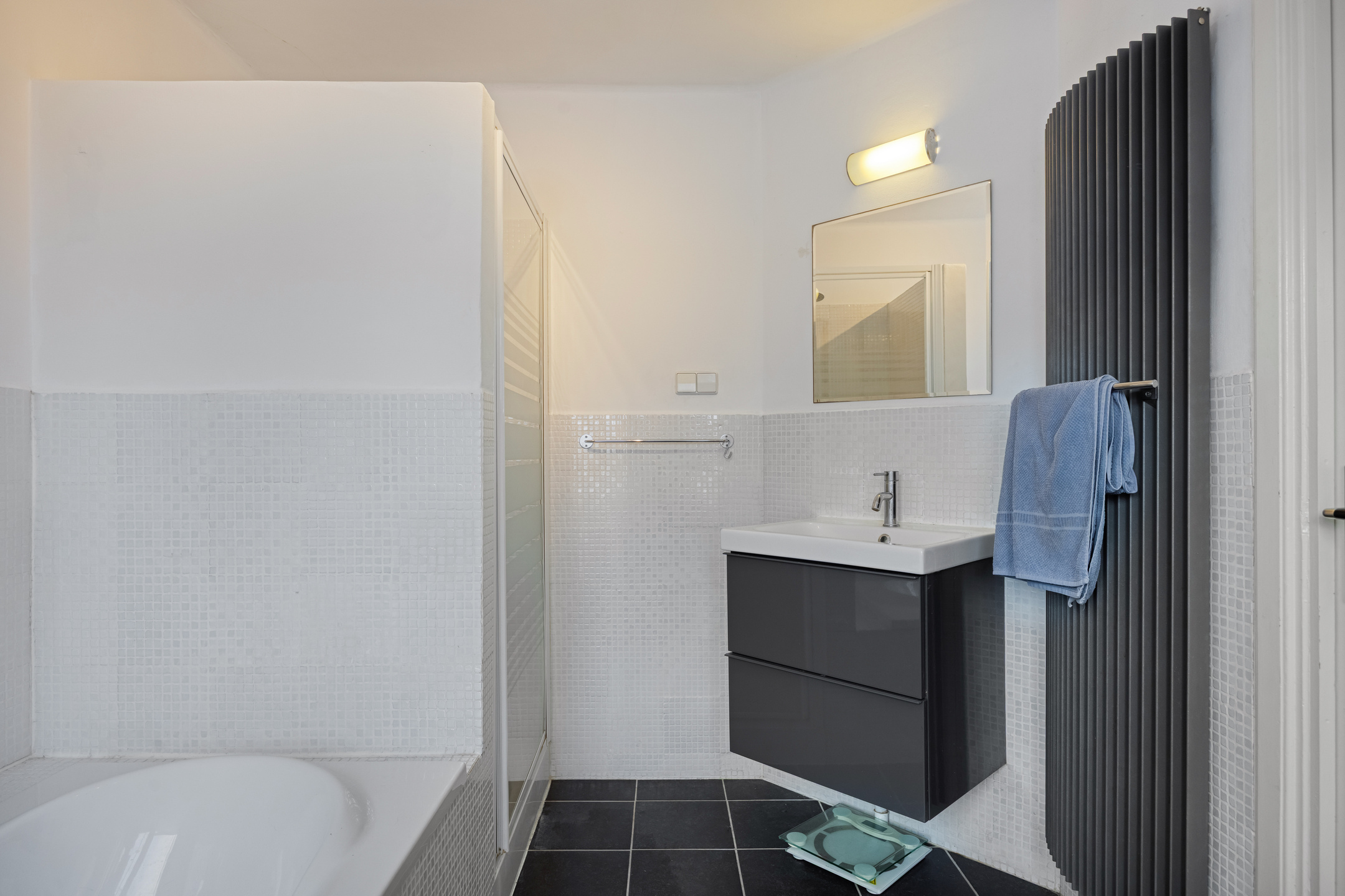 De badkamer bevindt zich aan de achterzijde en is deels betegeld. De ruimte is voorzien van een ligbad, douche, wastafelmeubel, hangcloset en een designradiator.