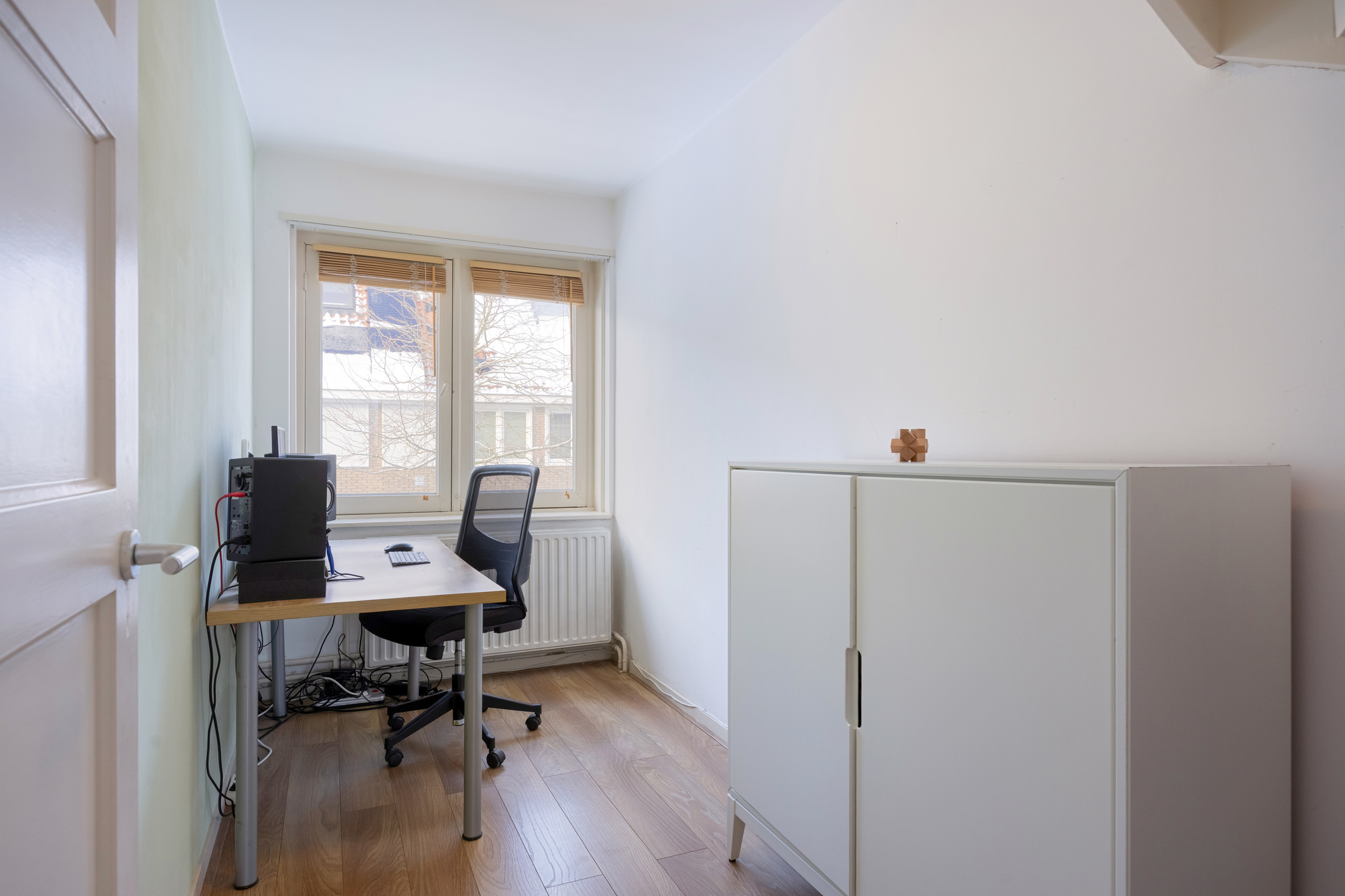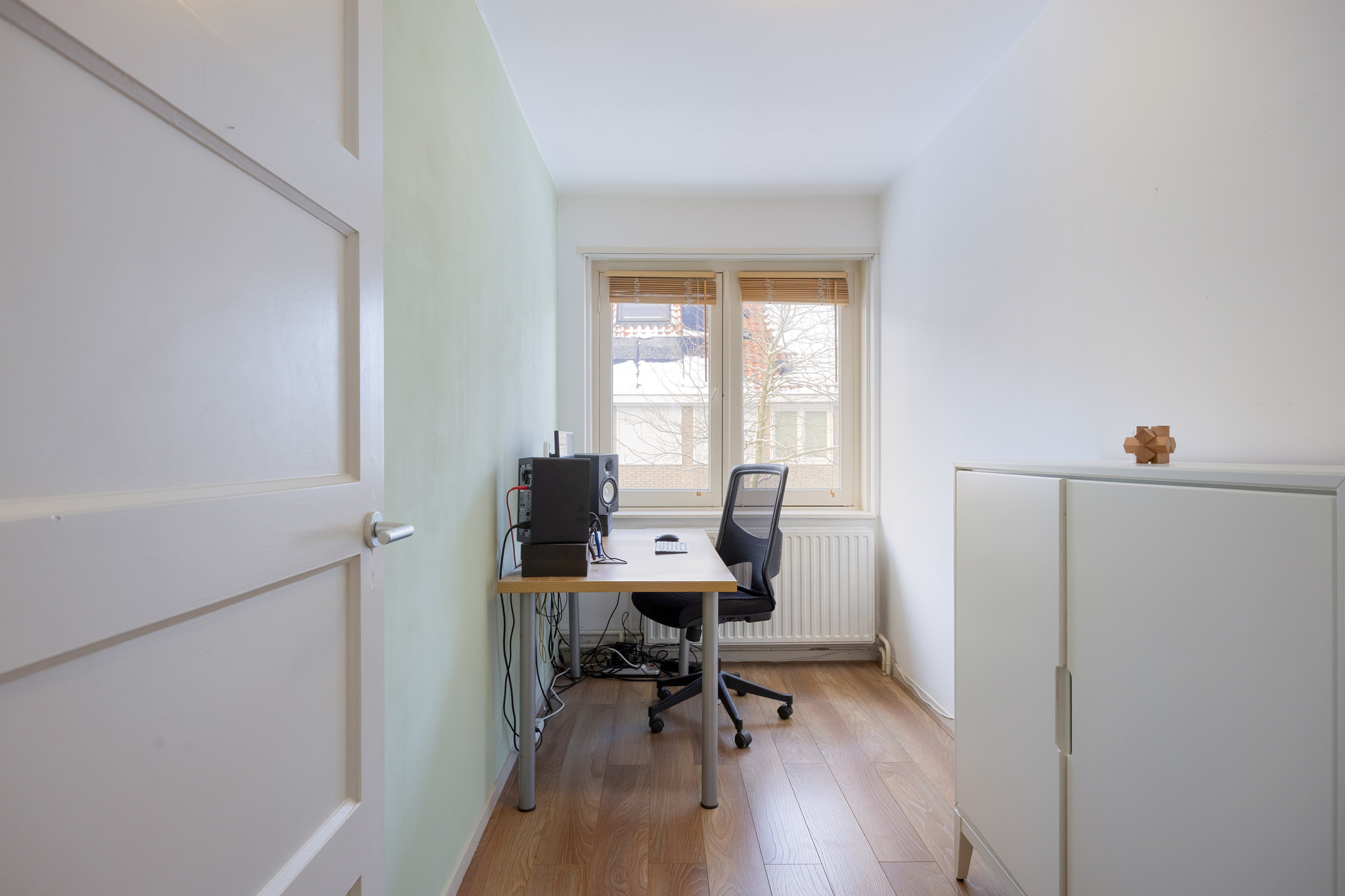 Kleinere slaapkamer, momenteel in gebruik als werkkamer. Ook deze kamer beschikt over een breed raam en is multifunctioneel inzetbaar.