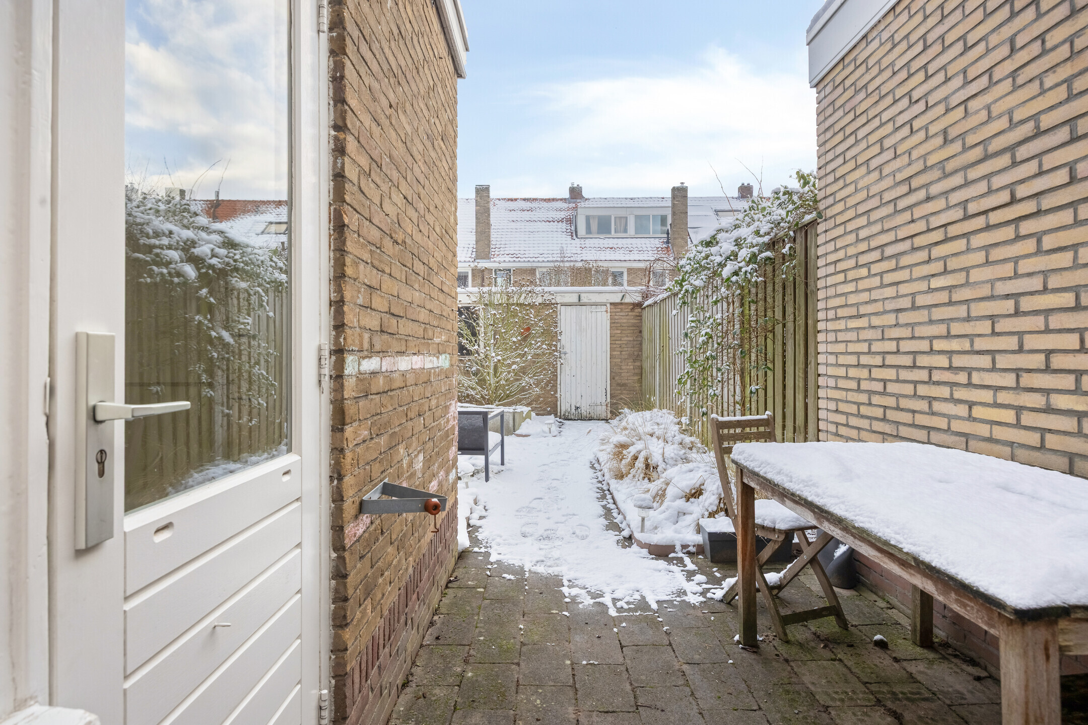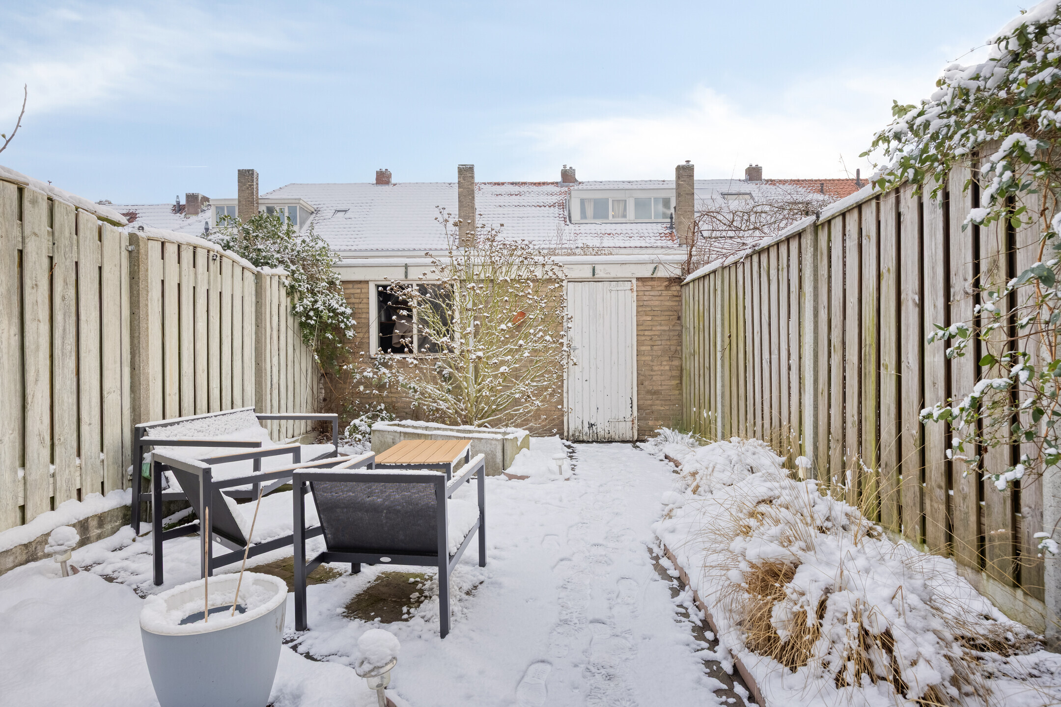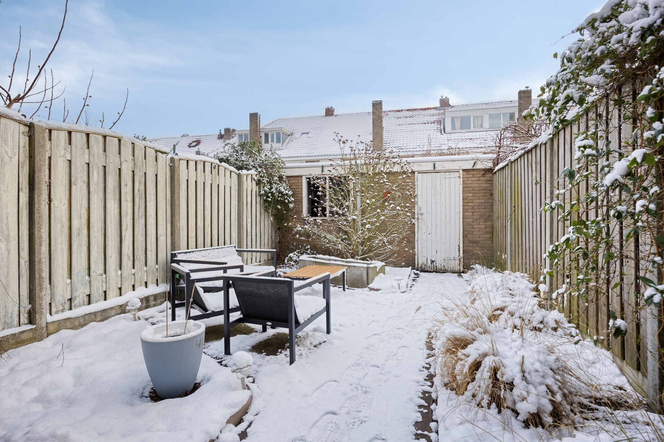 De achtertuin is gelegen op het oosten en ingericht met een zitgedeelte, vaste beplanting en terras. Achterin de tuin bevindt zich een schuurtje met elektra en de tuin is bereikbaar via een achterom.