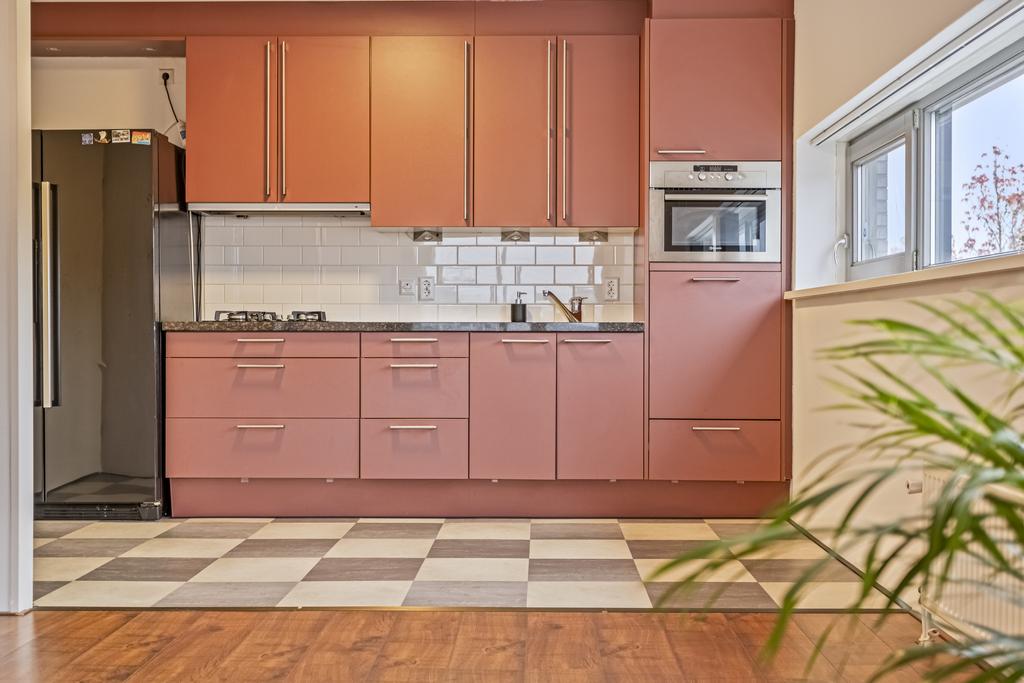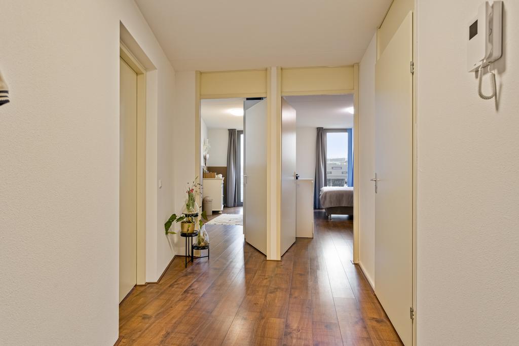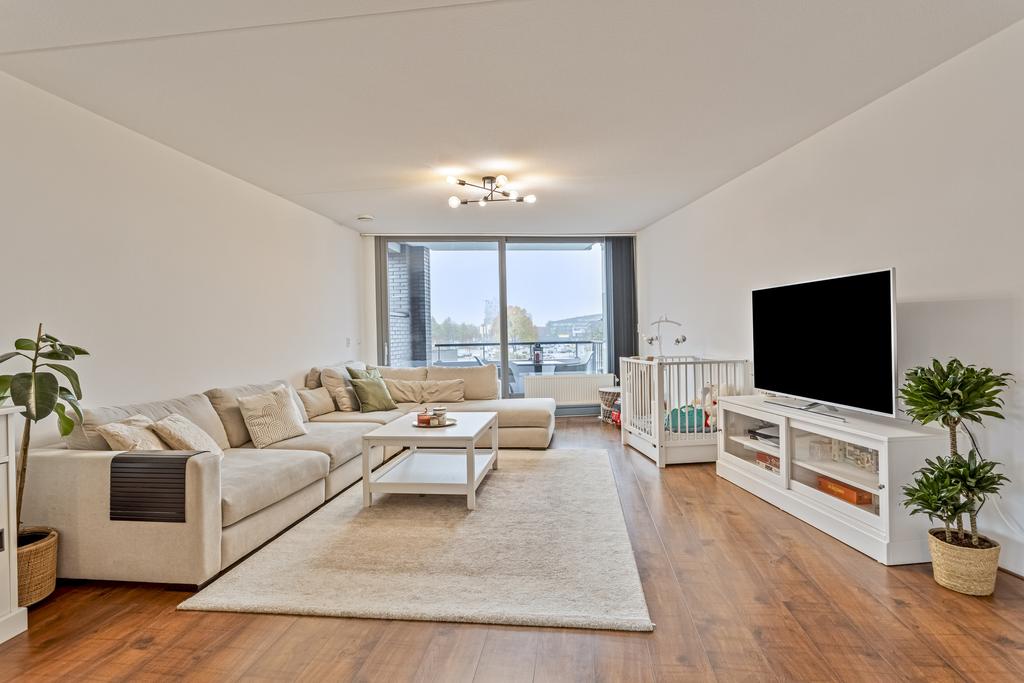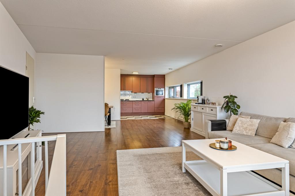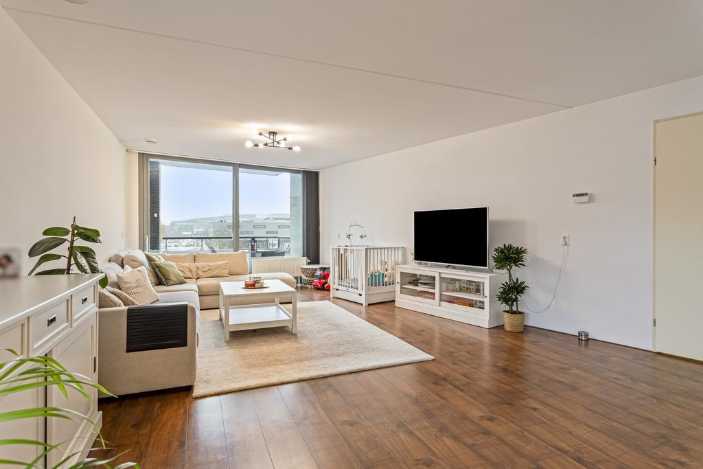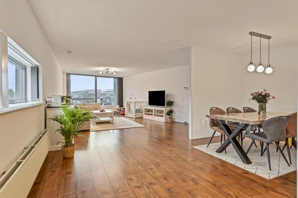 Zeer ruime woonkamer met een laminaat vloer. De woonkamer voelt extra open door de vele ramen aan twee zijden – een voordeel van het hoekappartement! Het licht stroomt hier binnen en biedt een fijne plek om te ontspannen. Via een schuifpui loop je zo het zonnige balkon op.