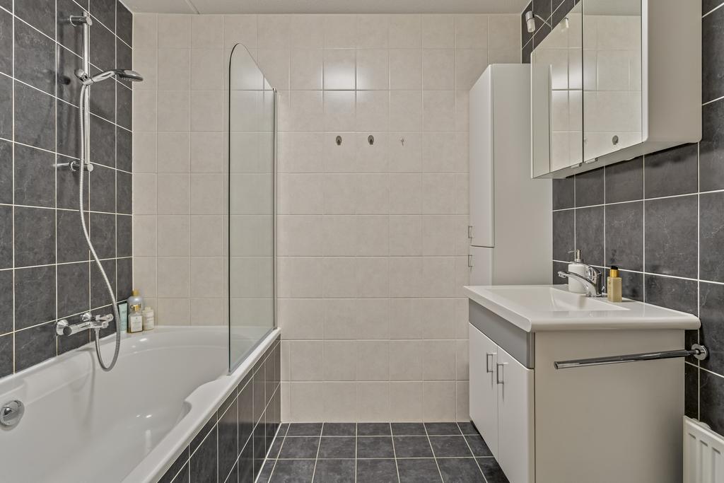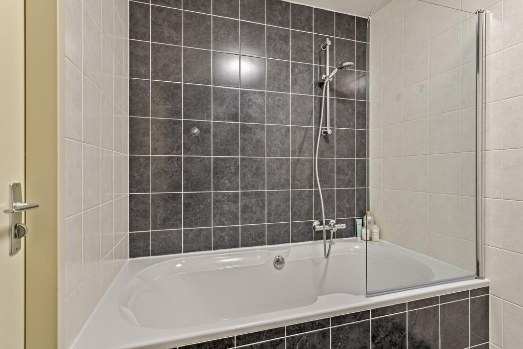 De volledig betegelde badkamer is een heerlijke plek om te ontspannen. Geniet van een royaal ligbad waarin u volledig tot rust kunt komen. De badkamer is daarnaast voorzien van een wastafel met wastafelmeubel die zorgt voor extra opbergruimte!