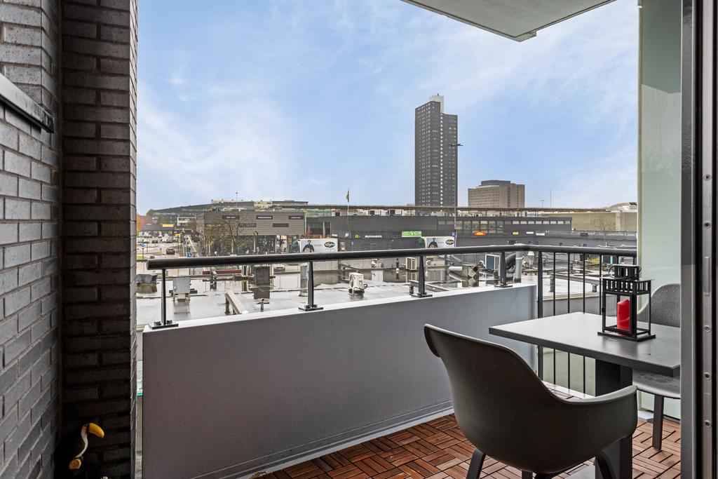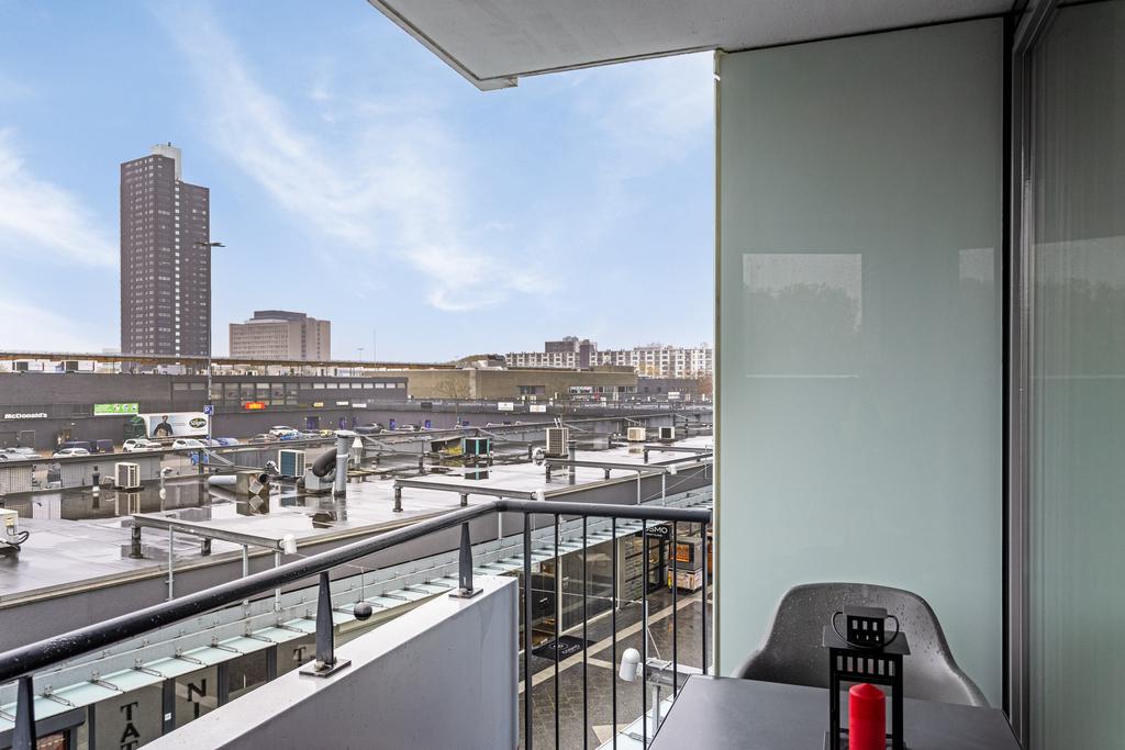 Geniet op het ruime balkon, gelegen op het zuiden, van het uitzicht op Winkelcentrum Woensel XL. De vloer van vlondertegels geeft het balkon een knusse uitstraling.