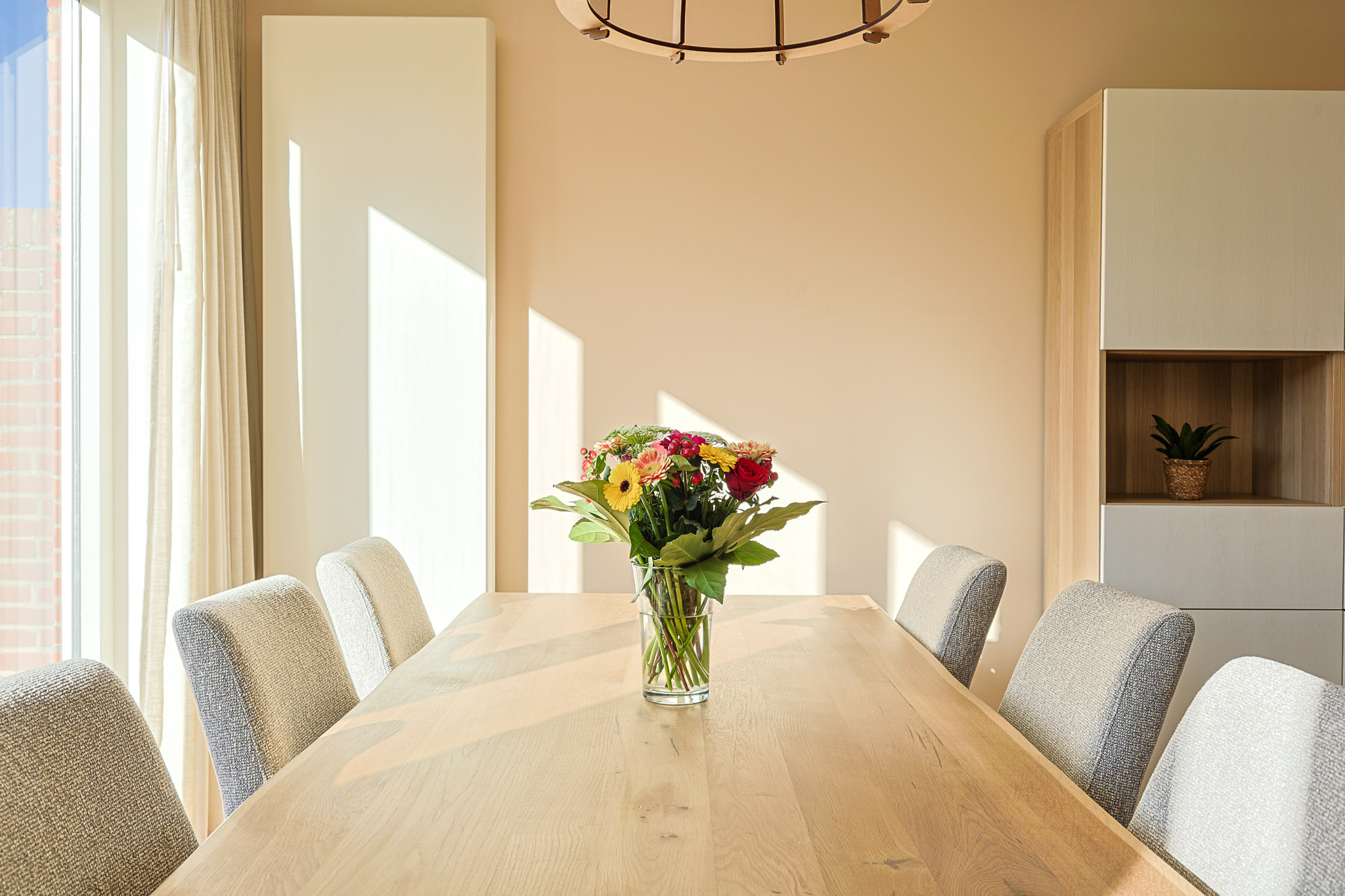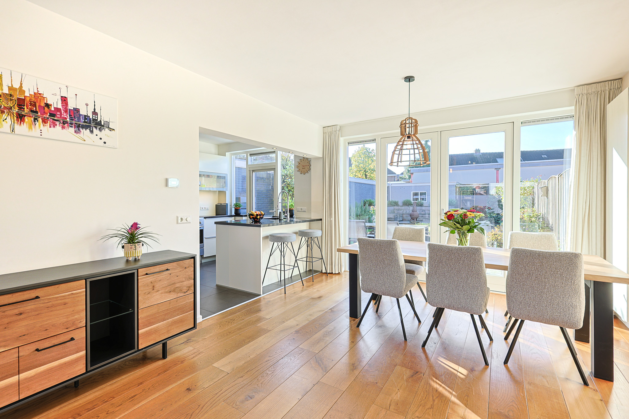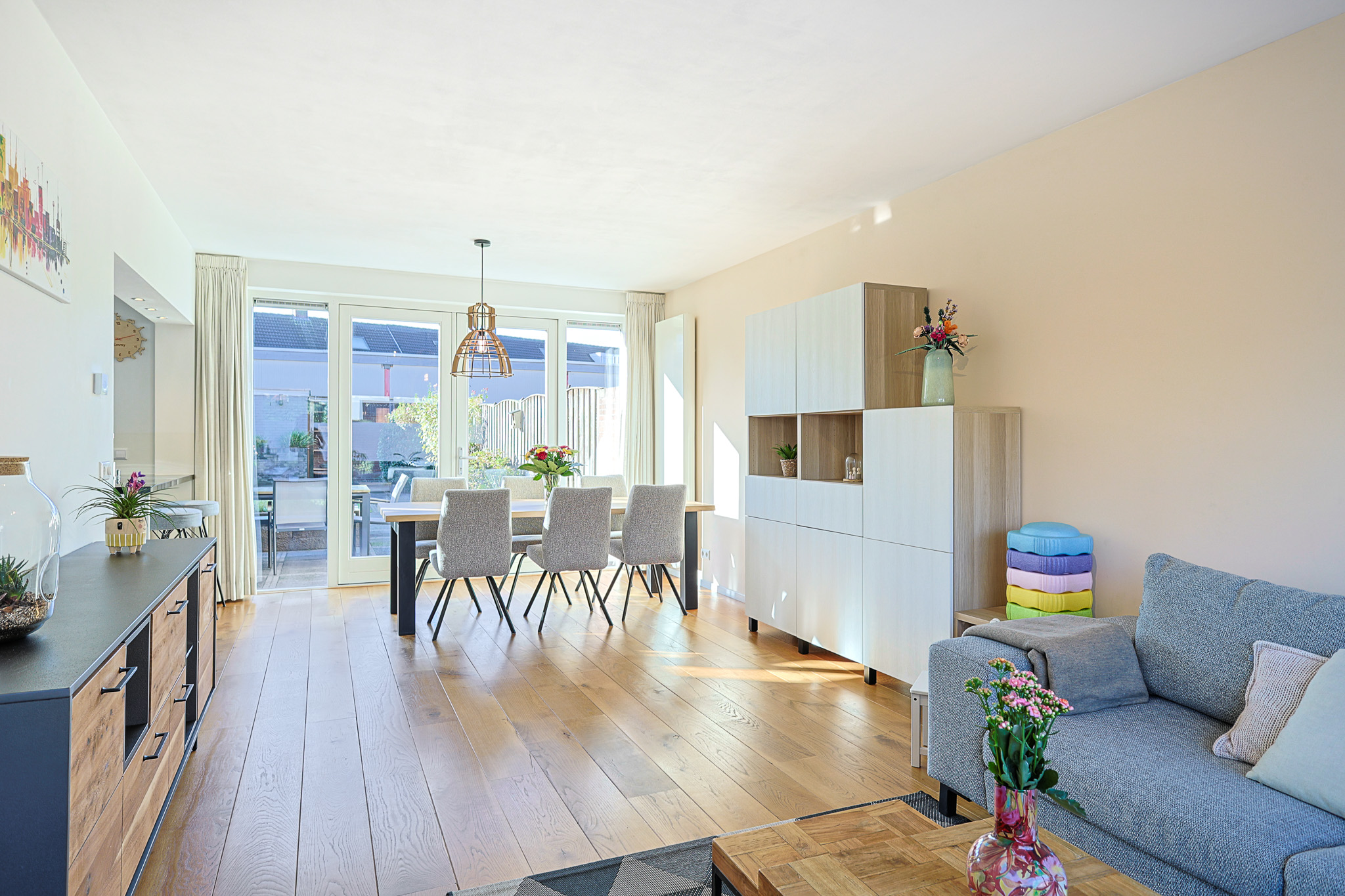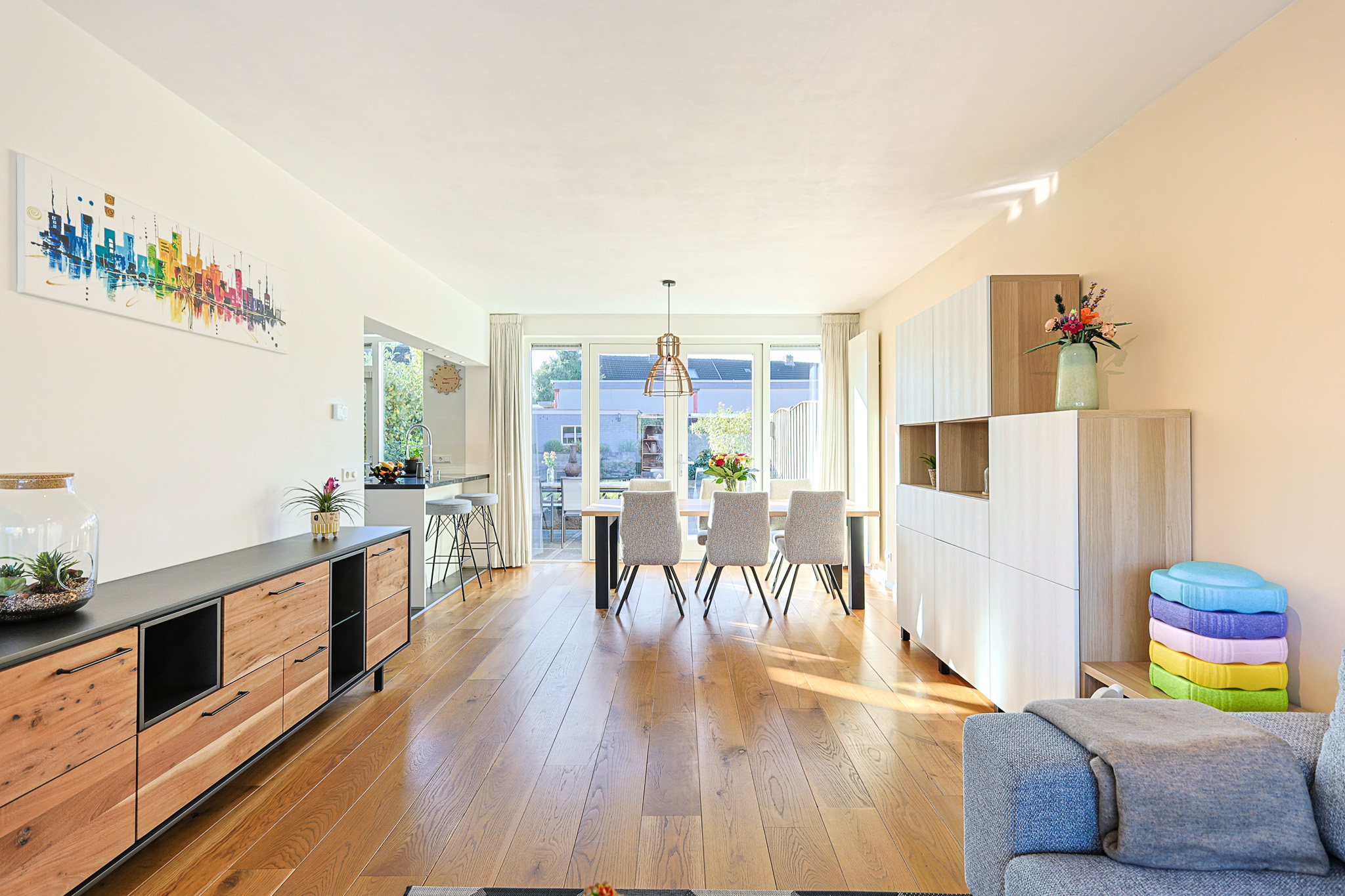 De woonkamer kenmerkt zich door de brede opzet en de grote raampartijen die zorgen voor veel lichtinval. Er is ruimte genoeg voor zowel een comfortabel zitgedeelte als een ruime eethoek.