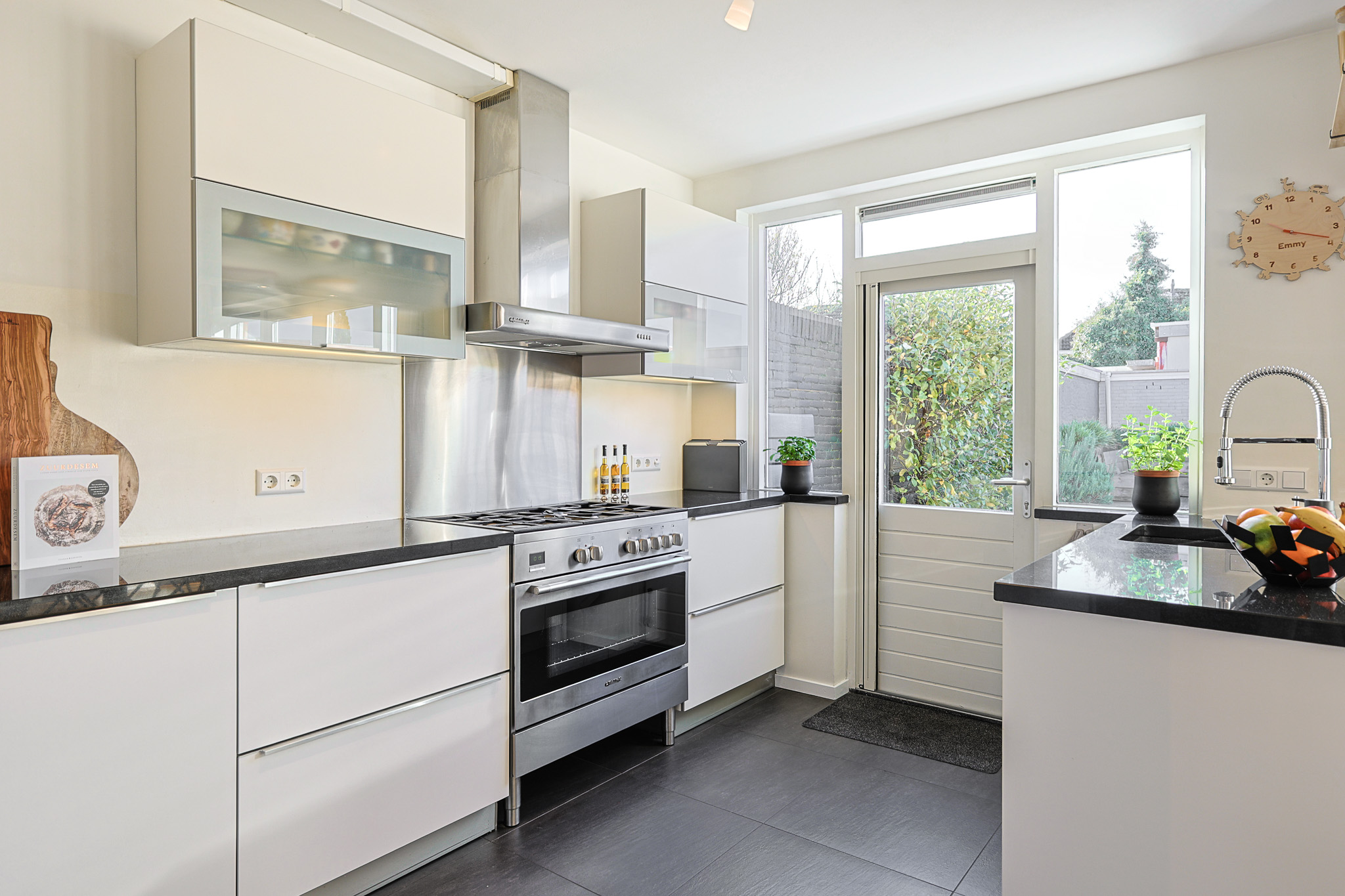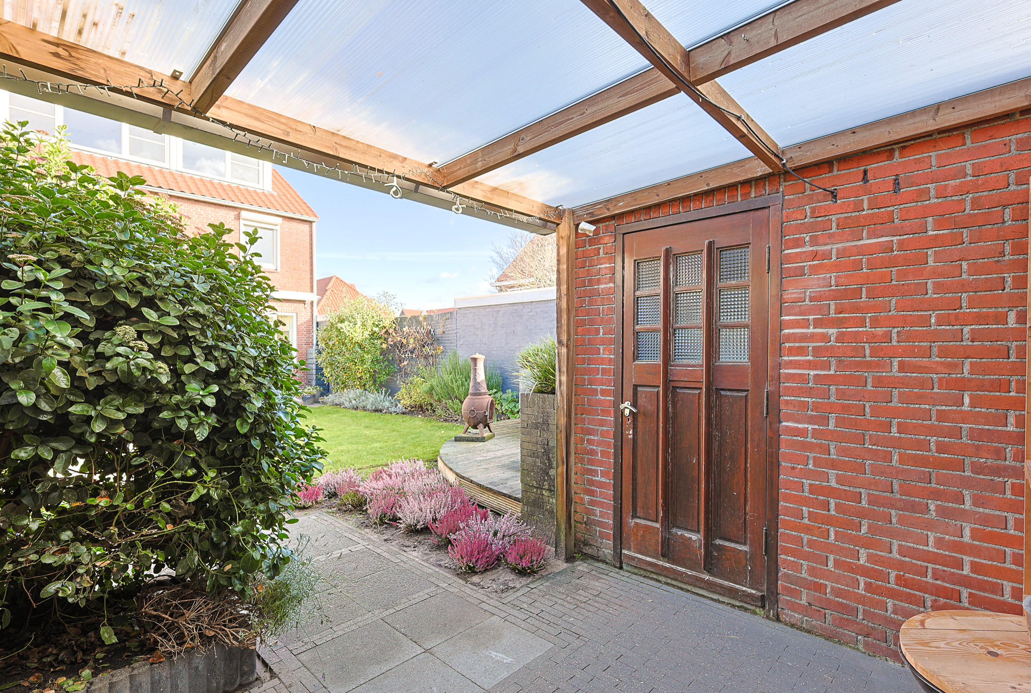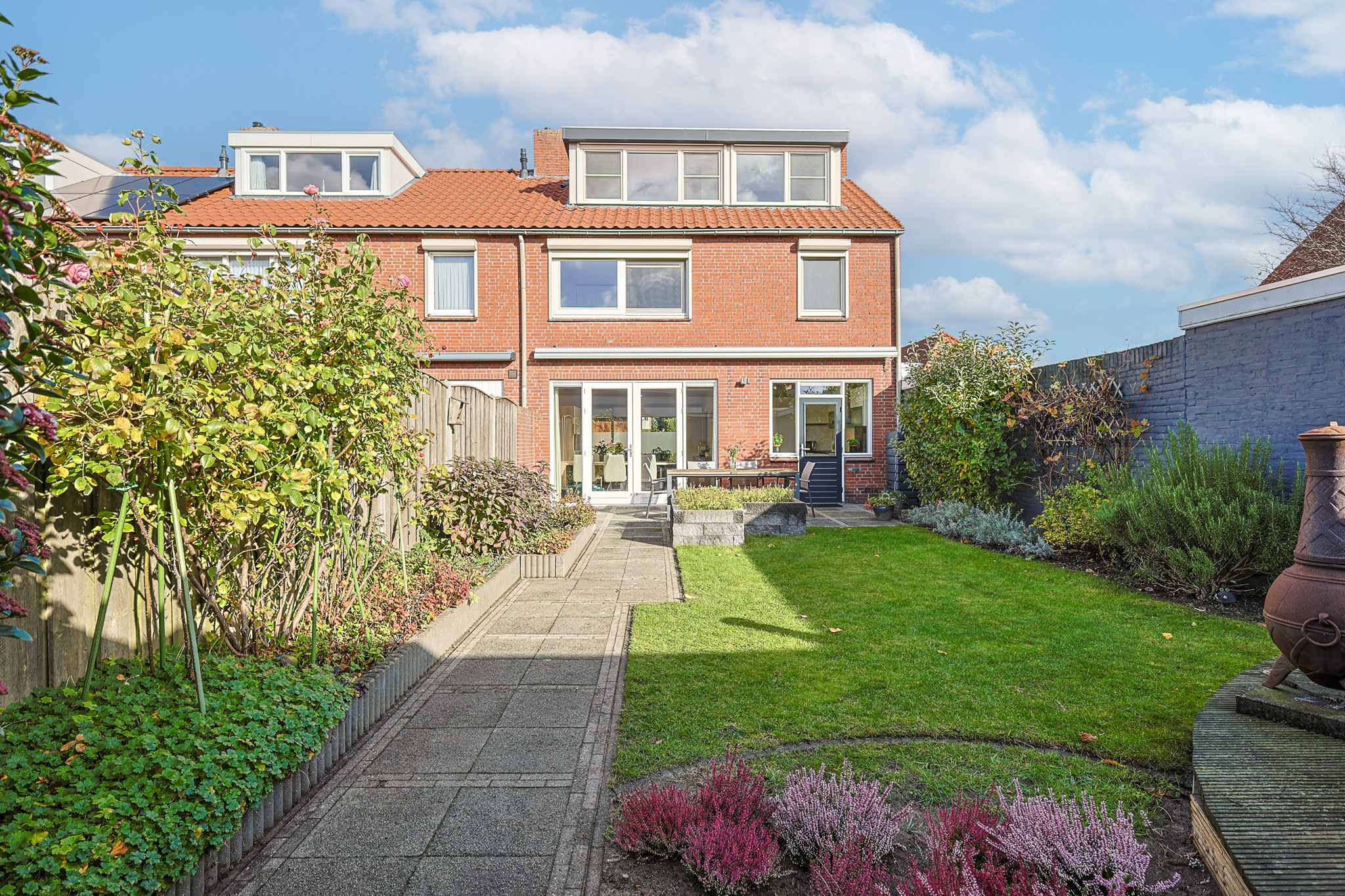 Via de keuken is er toegang tot de achtertuin, een diepe, brede tuin met twee fijne zitgedeeltes en volwassen beplanting met o.a. een appelboom en een druivenstruik. De tuin biedt veel privacy en vrij uitzicht. Achterin bevindt zich een schuurtje met elektra , een overkapping en een achterom.