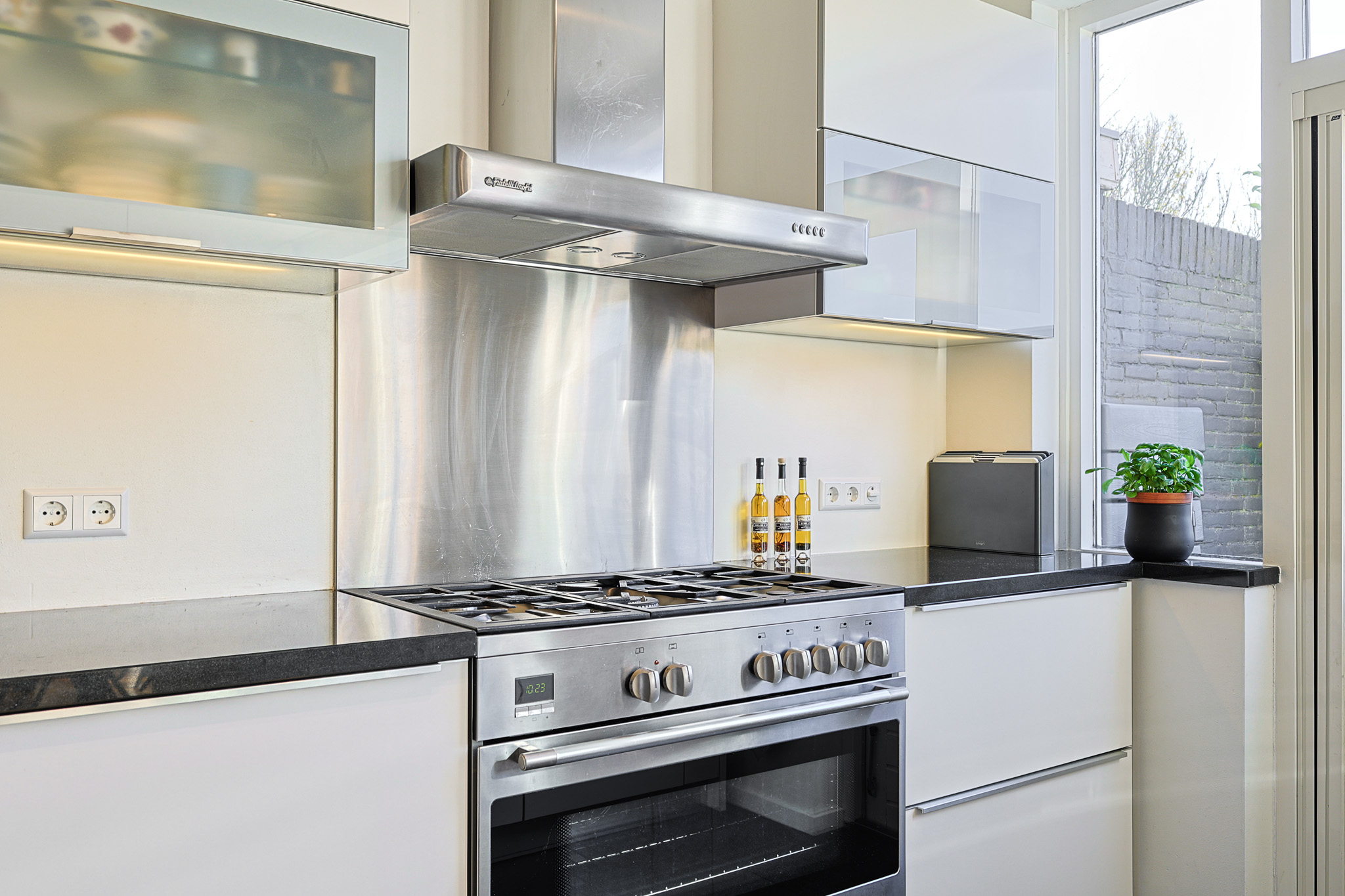 De open keuken is voorzien van een sfeervol barretje, een tegelvloer en diverse inbouwapparatuur zoals een grote oven, een 5-pits gasfornuis, koelkast, diepvries en vaatwasser. Daarnaast beschikt de keuken over een bijzonder diepe kelderkast met veel opbergruimte.