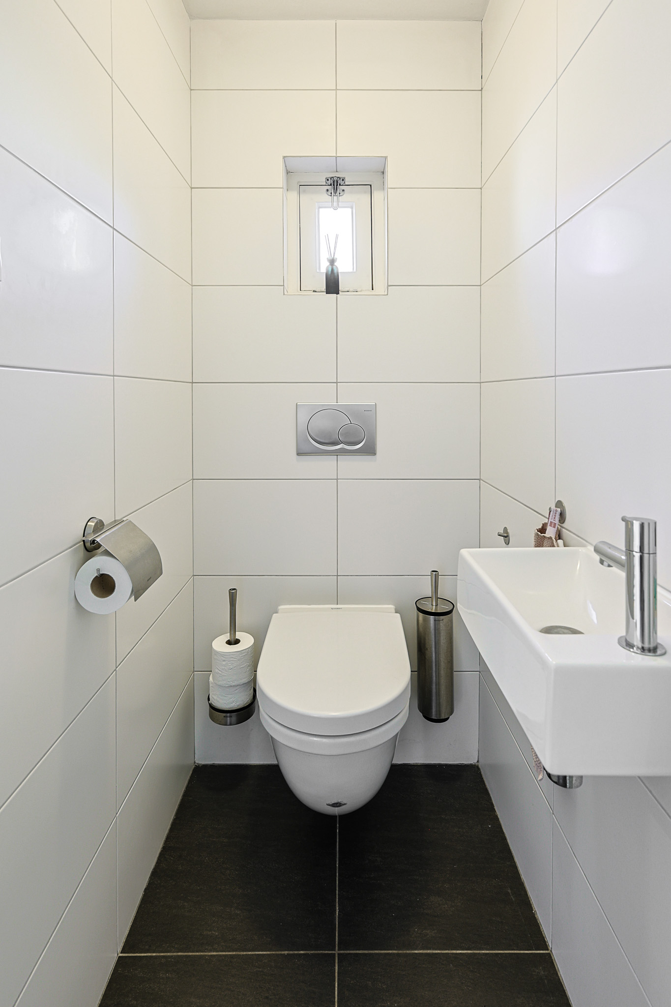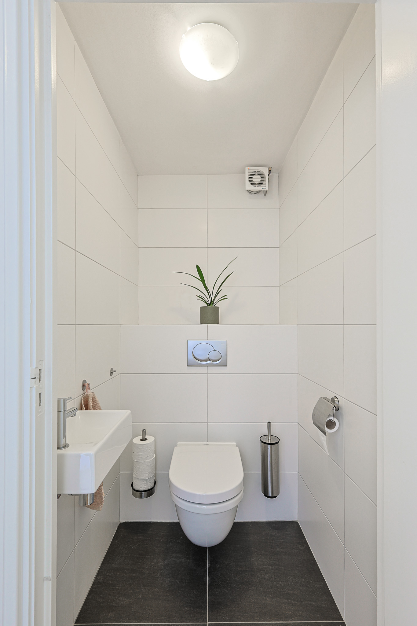 Separaat toilet: met hangcloset, kraantje, tegelvloer en afzuiging.