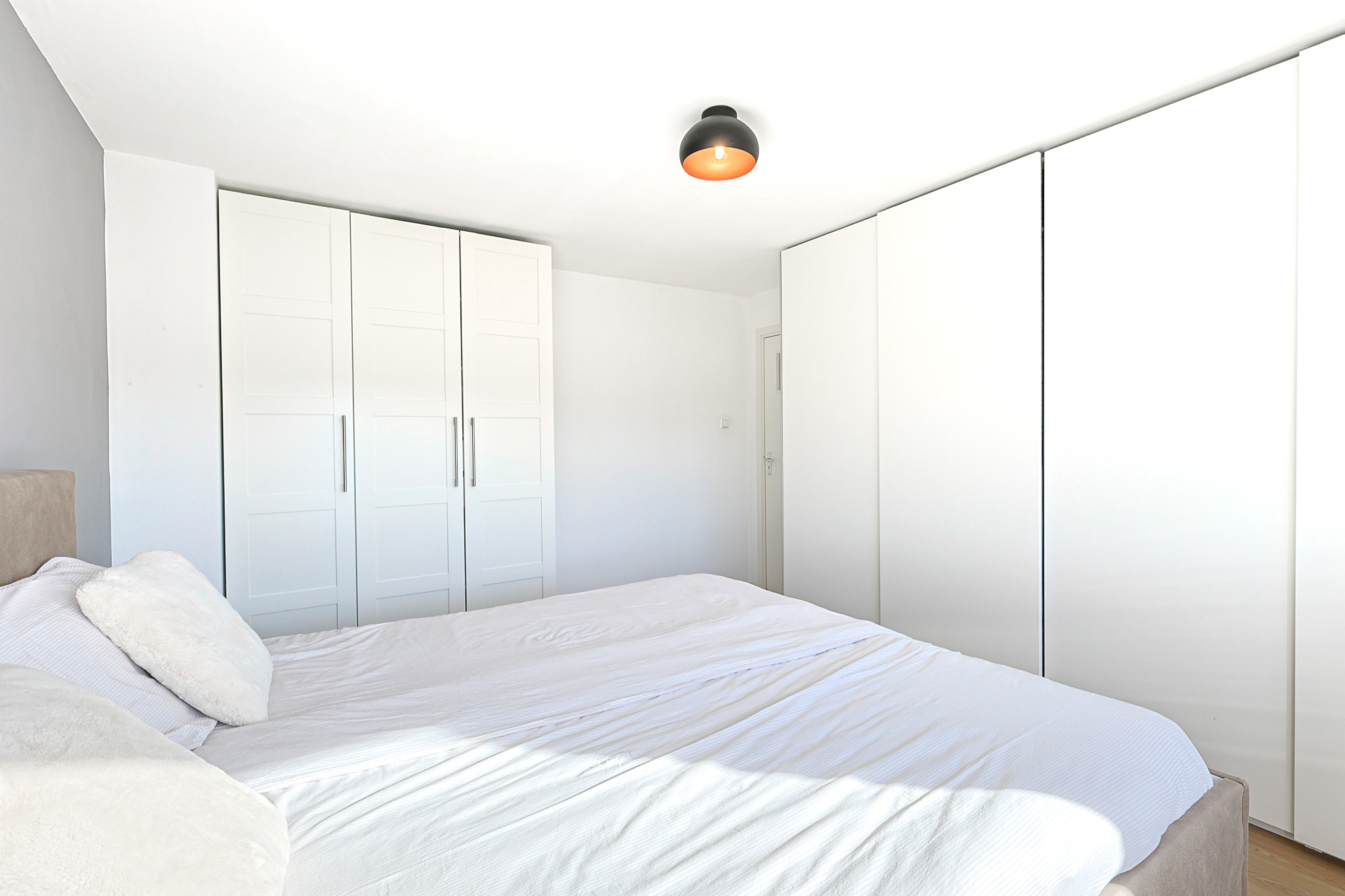 Grote kamer met veel kastruimte, hor en rolluik; het schuifraam kan volledig open.