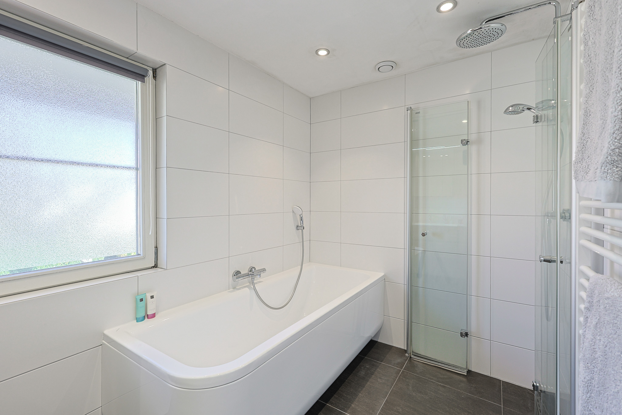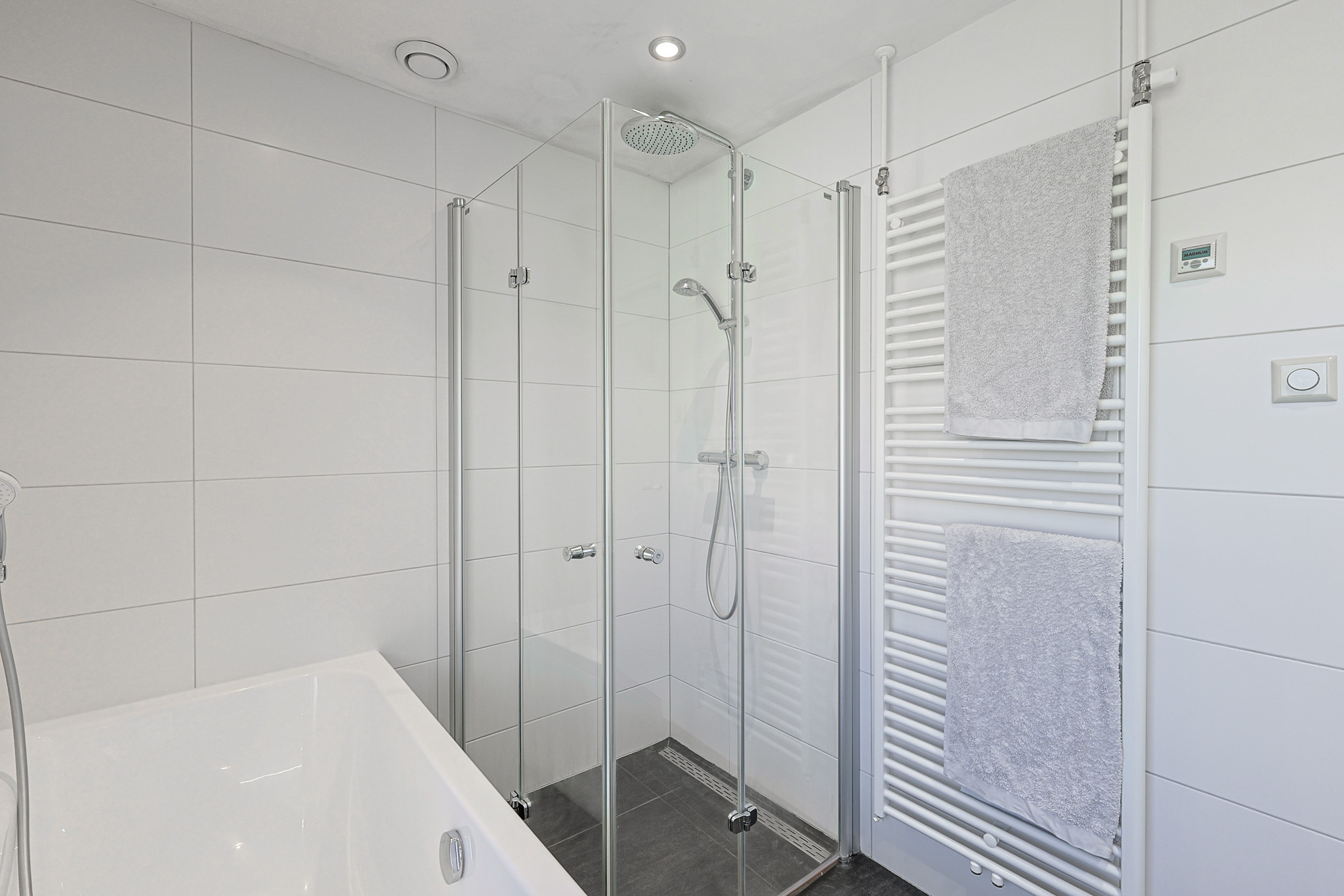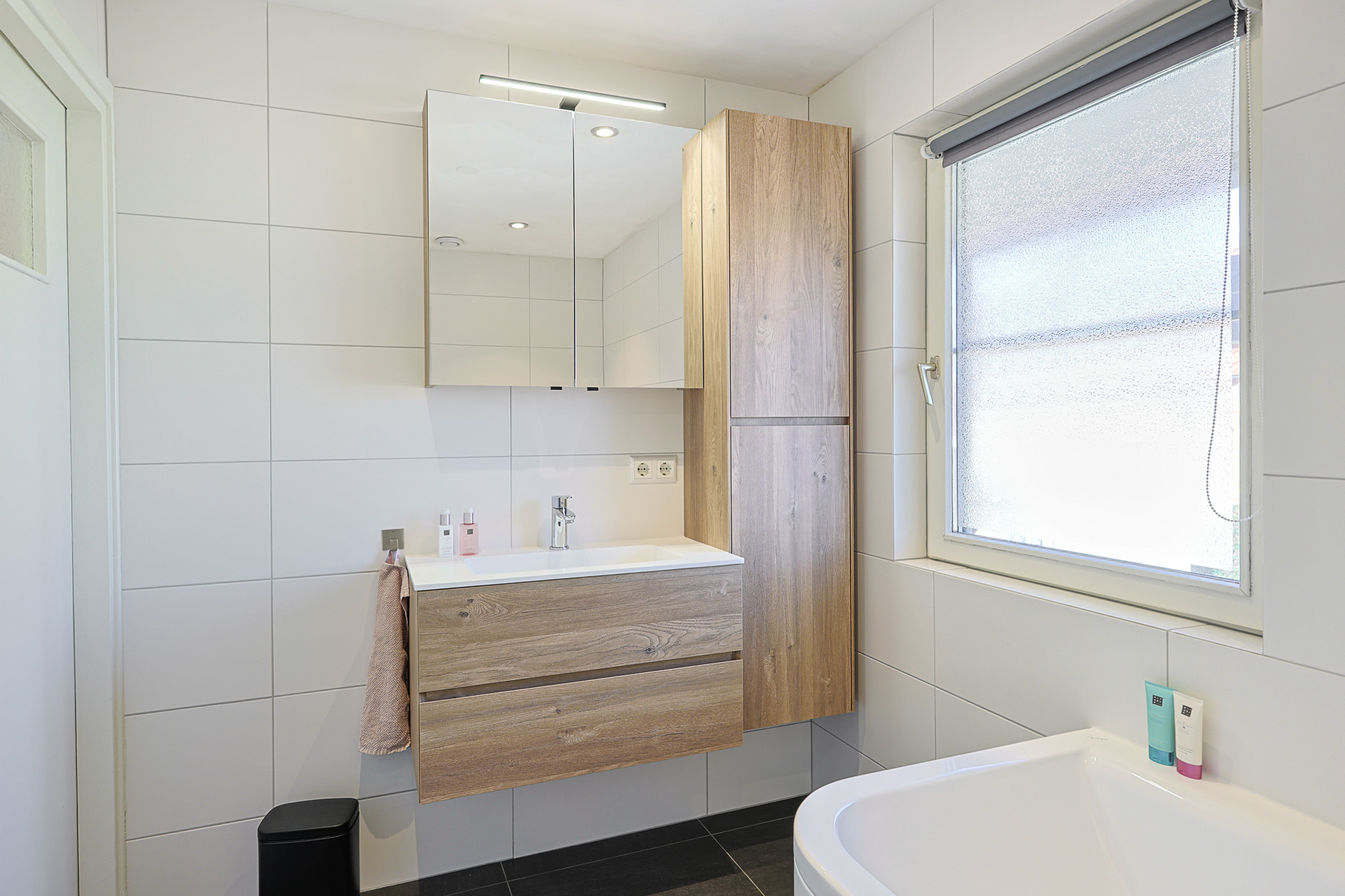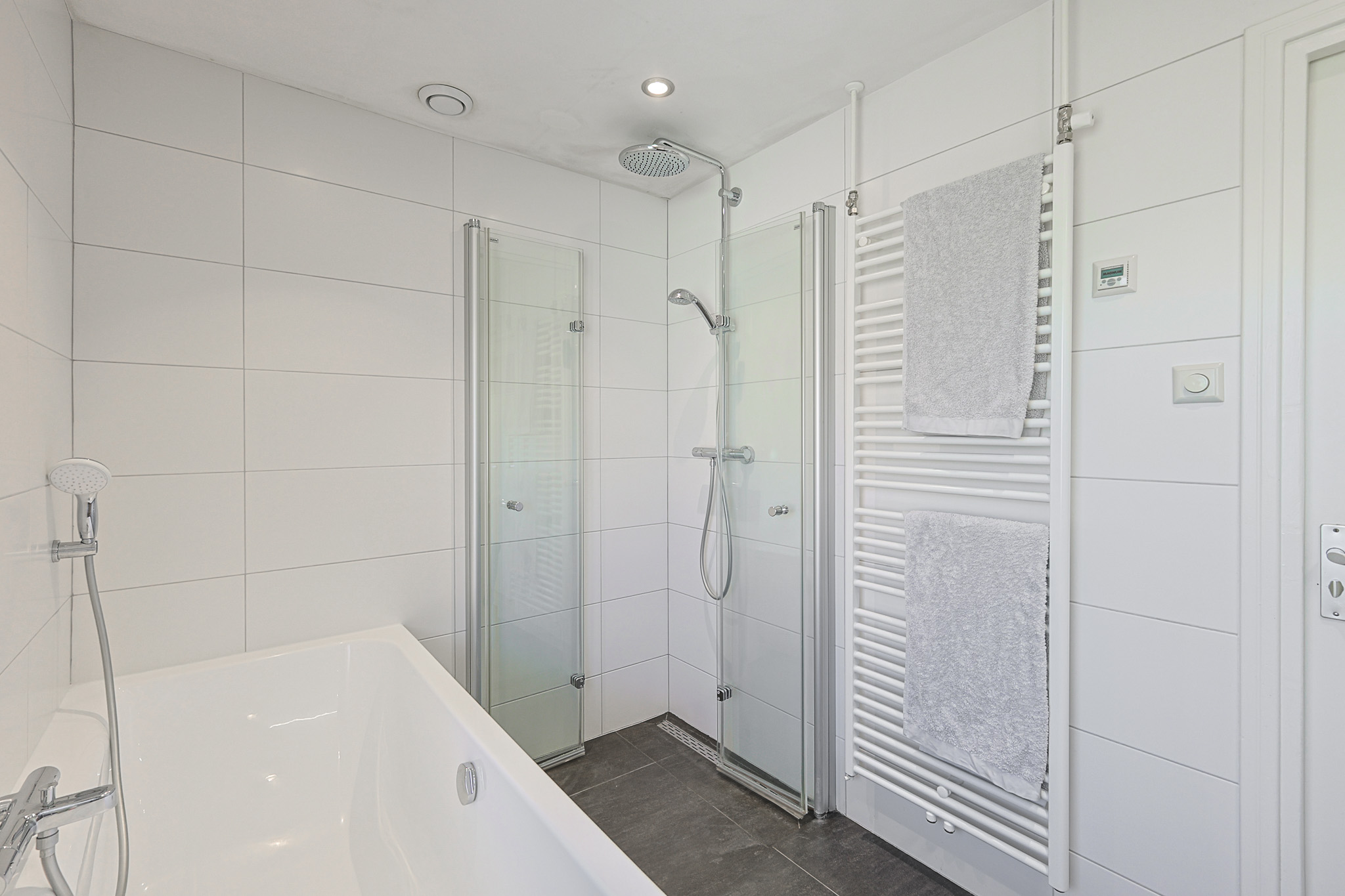 Compleet uitgerust met groot ligbad, inloopdouche, wastafelmeubel en voorzien van elektrische vloerverwarming.
