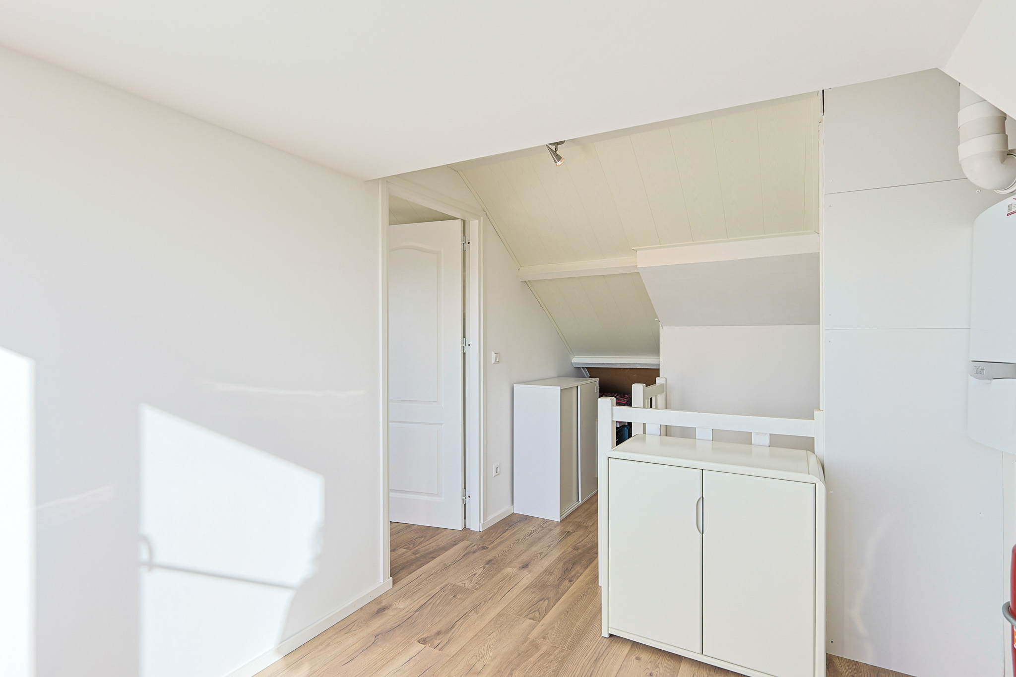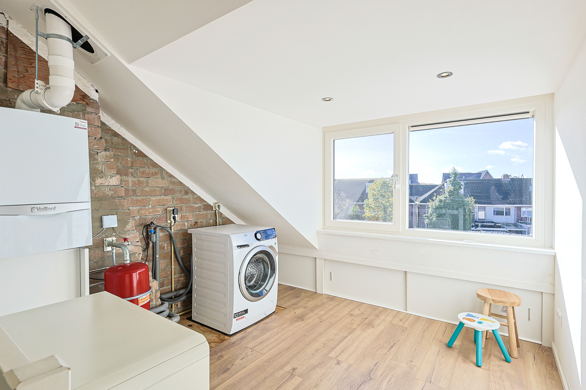 Via een vaste trap bereikt u de tweede verdieping. Hier vindt u de technische ruimte met Vaillant VHR NL ketel (bouwjaar 2021), boiler en aansluitingen voor wasmachine en droger. Achter de knieschotten bevindt zich extra bergruimte.