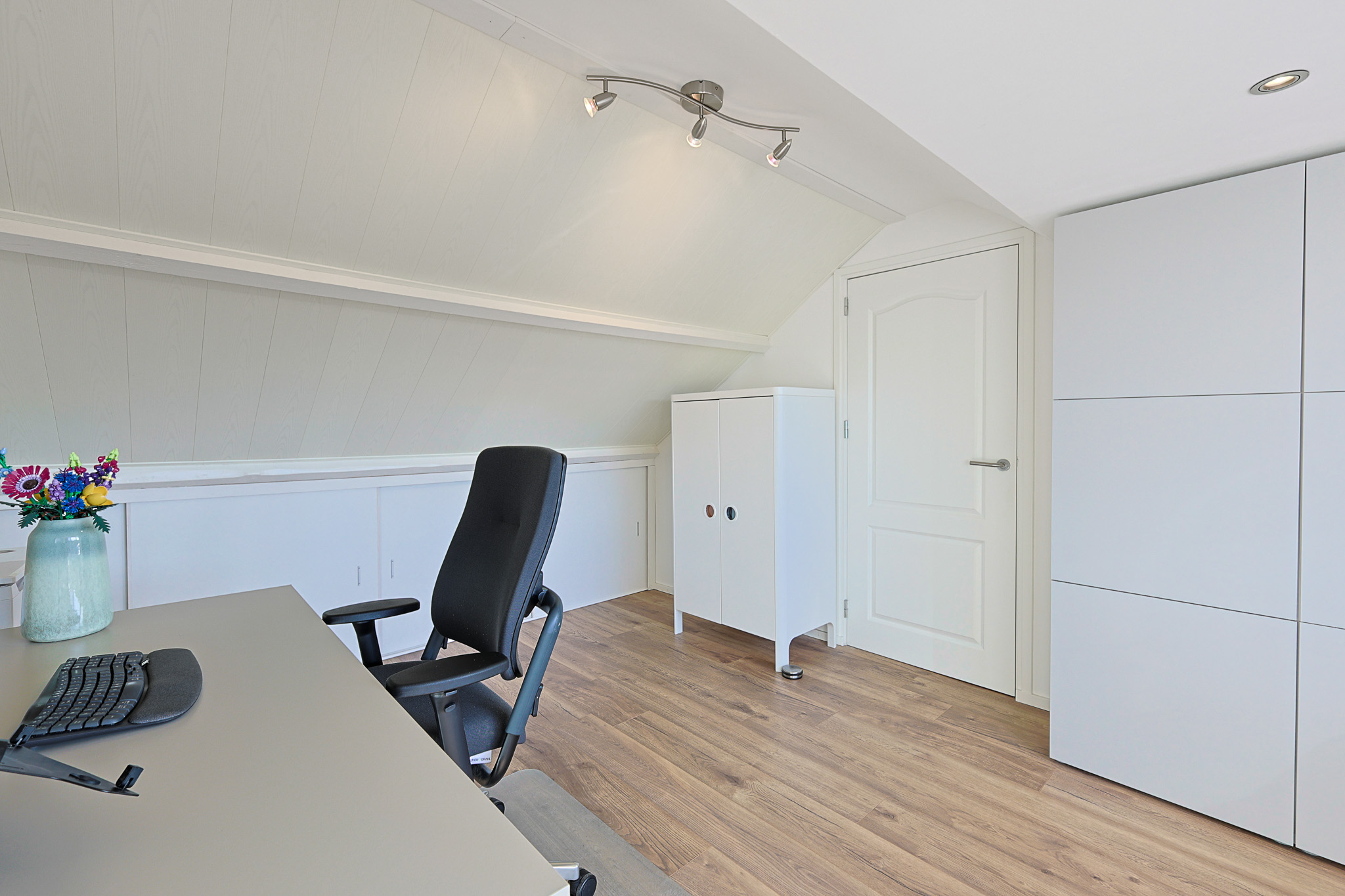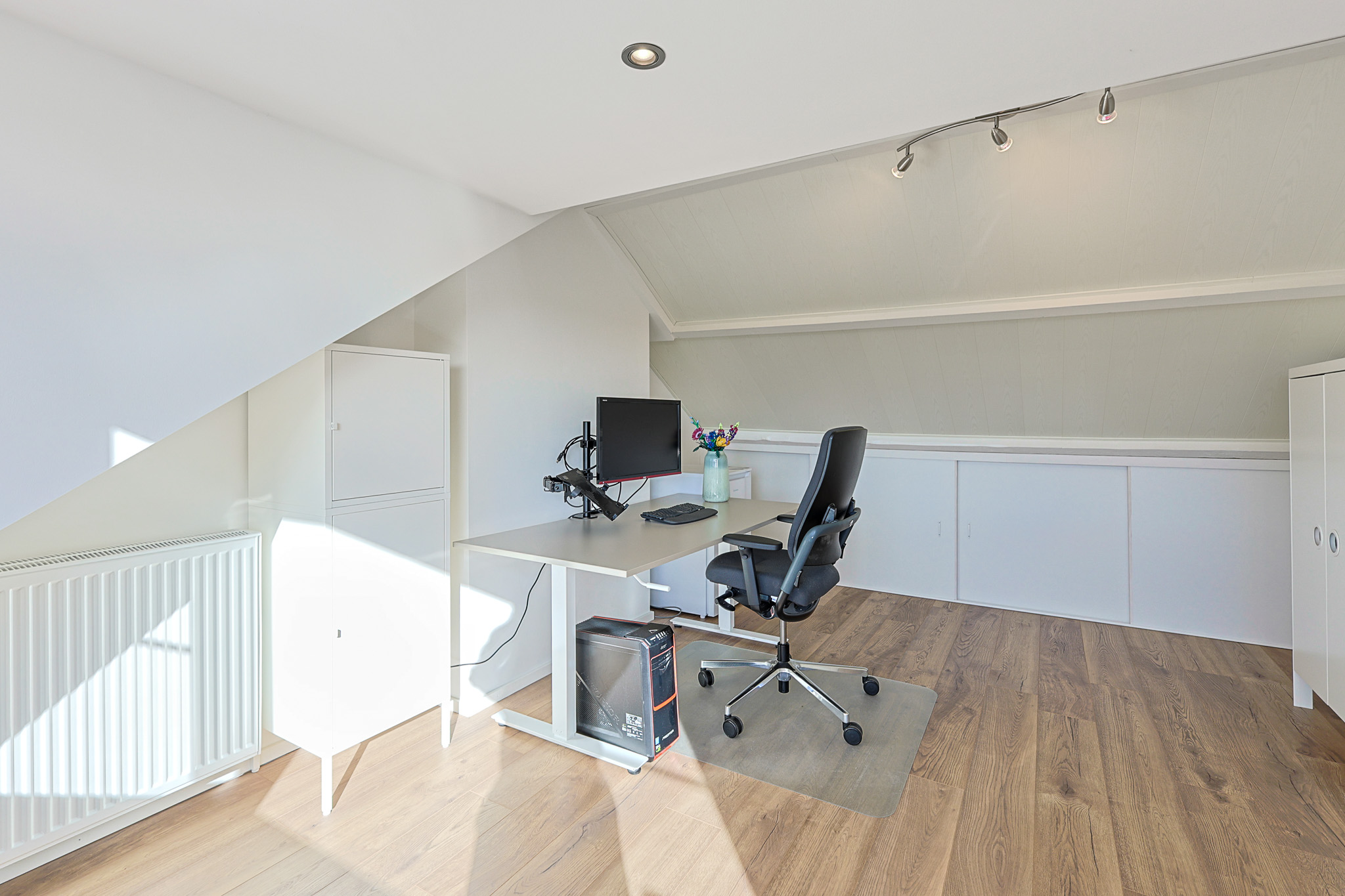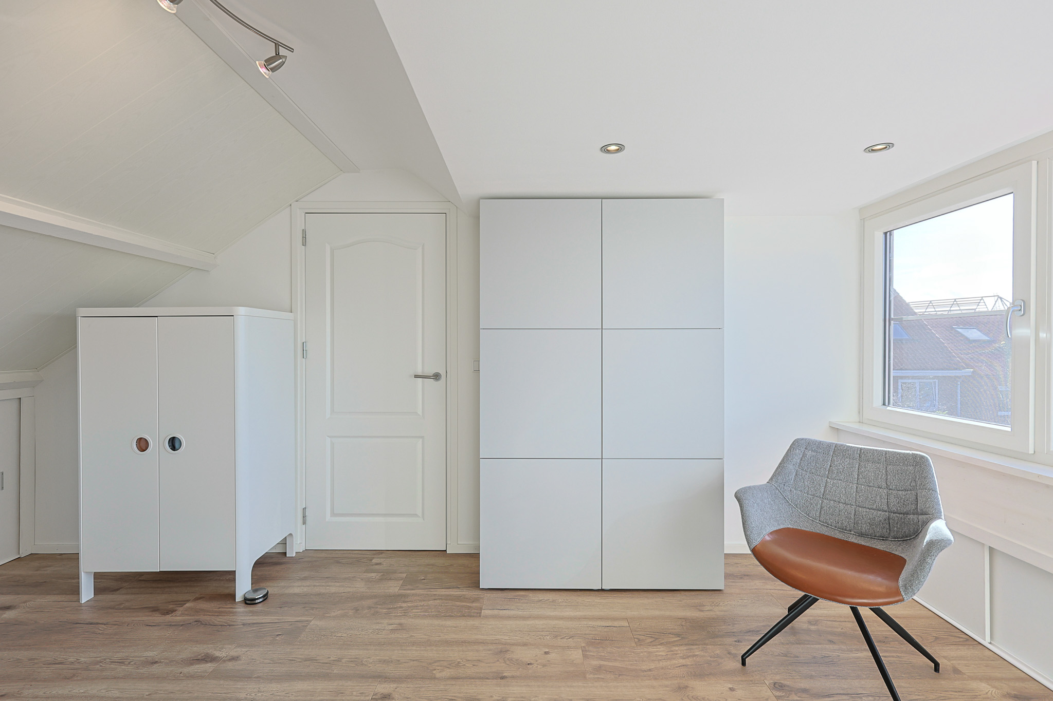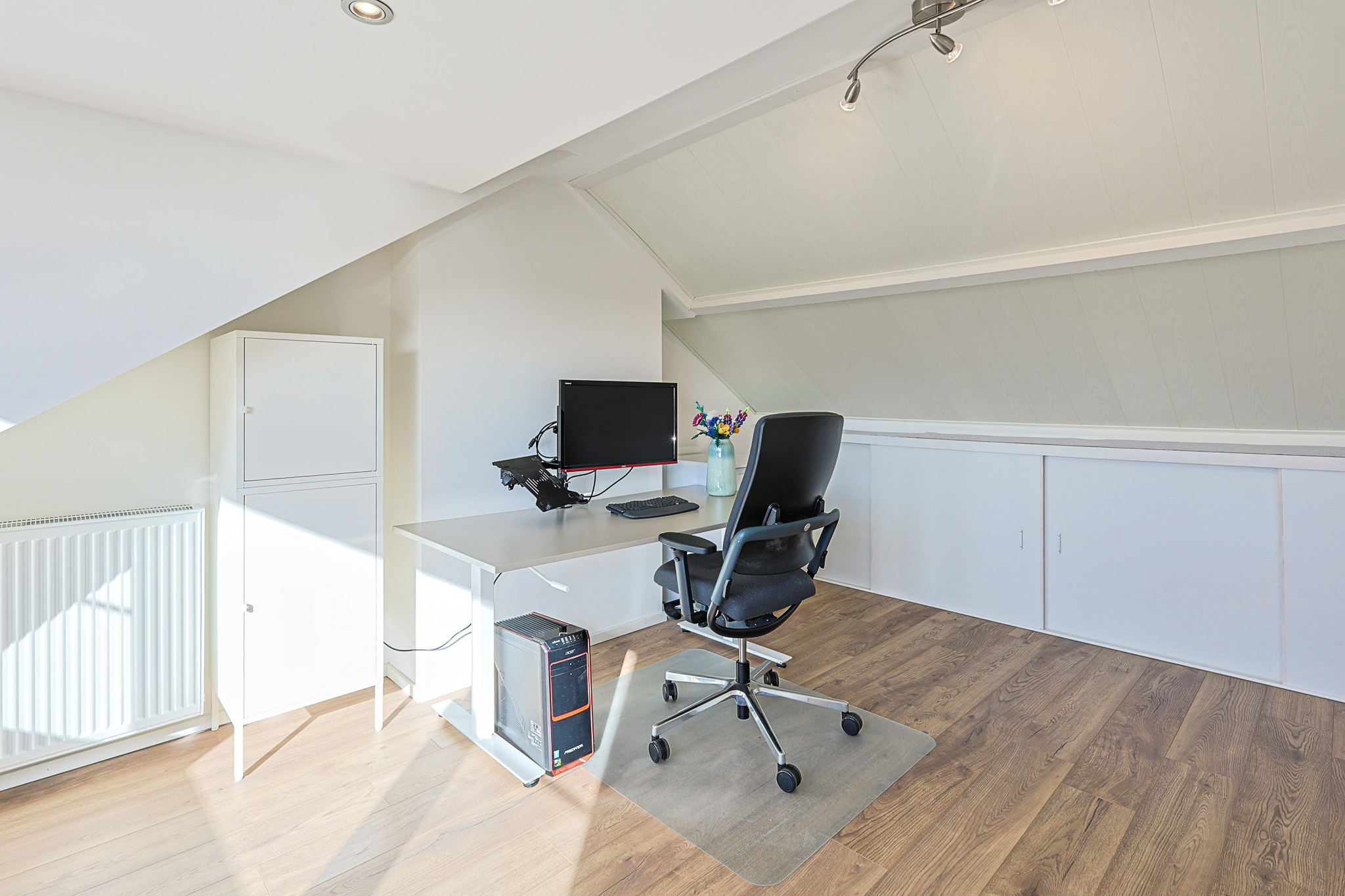 De vierde slaapkamer is een royale ruimte met veel licht dankzij een brede dakkapel over de gehele breedte (geplaatst circa 6 jaar geleden). De kamer is voorzien van draai-/ kiepramen met horren en rolluiken, ingebouwde spots en extra bergruimte achter de knieschotten.