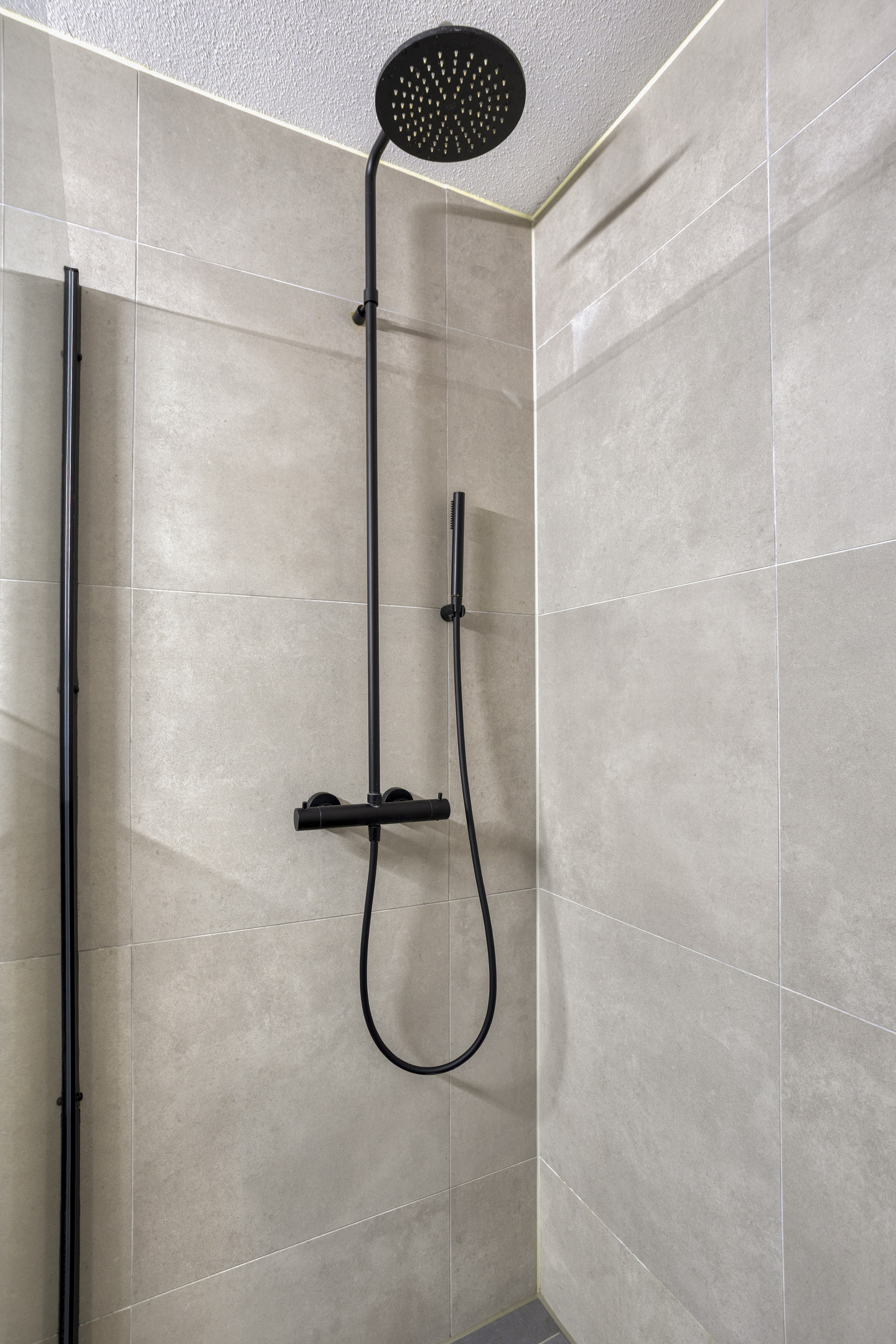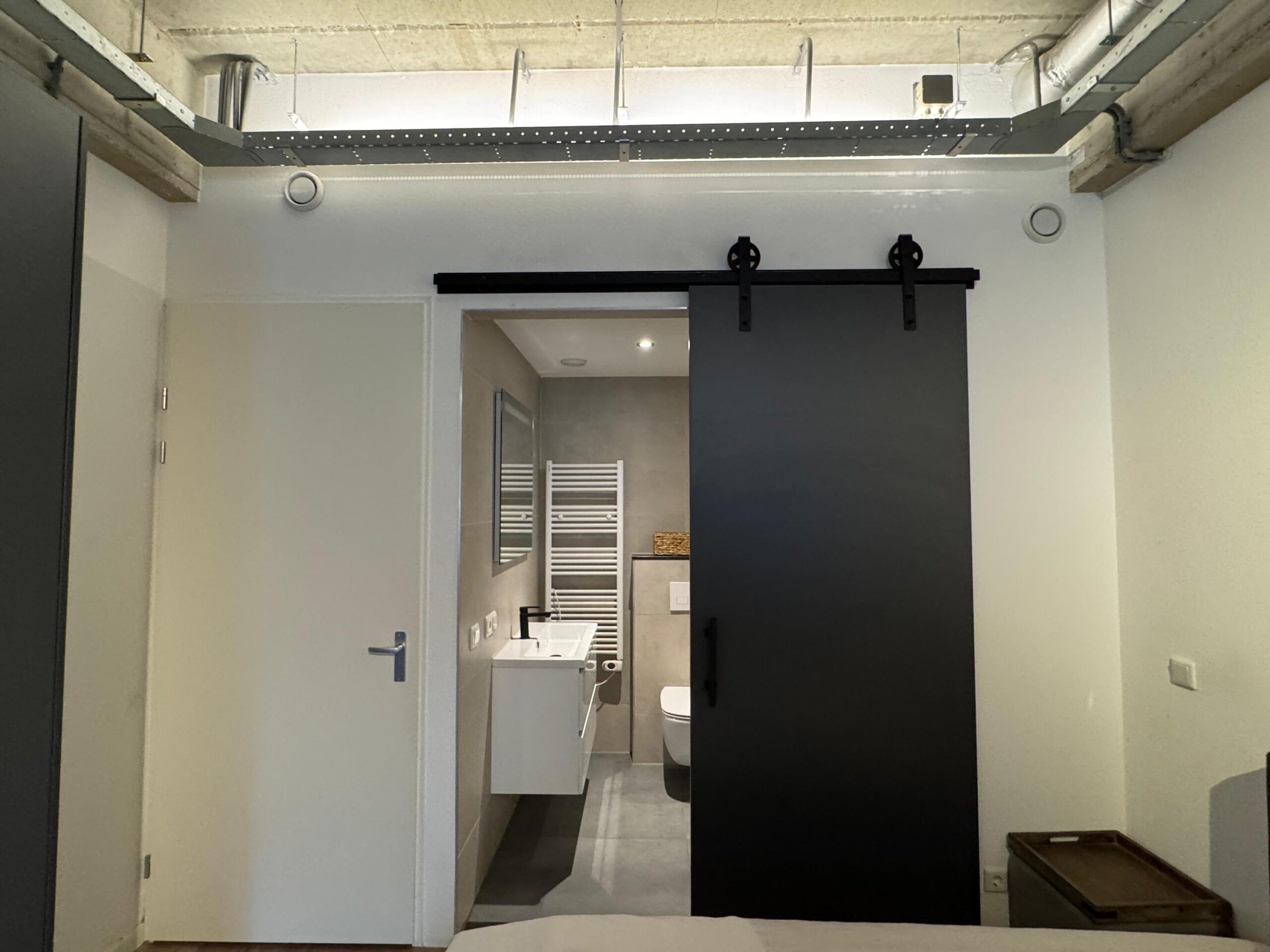 Moderne badkamer: Vanuit het slaapgedeelte bereikt u de strak afgewerkte badkamer, voorzien van een comfortabele douche, een zwevend closet en een moderne wastafel.