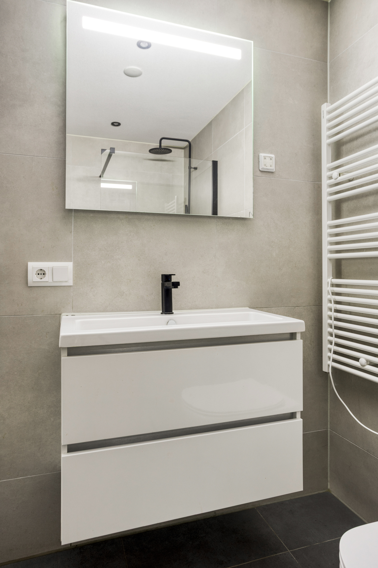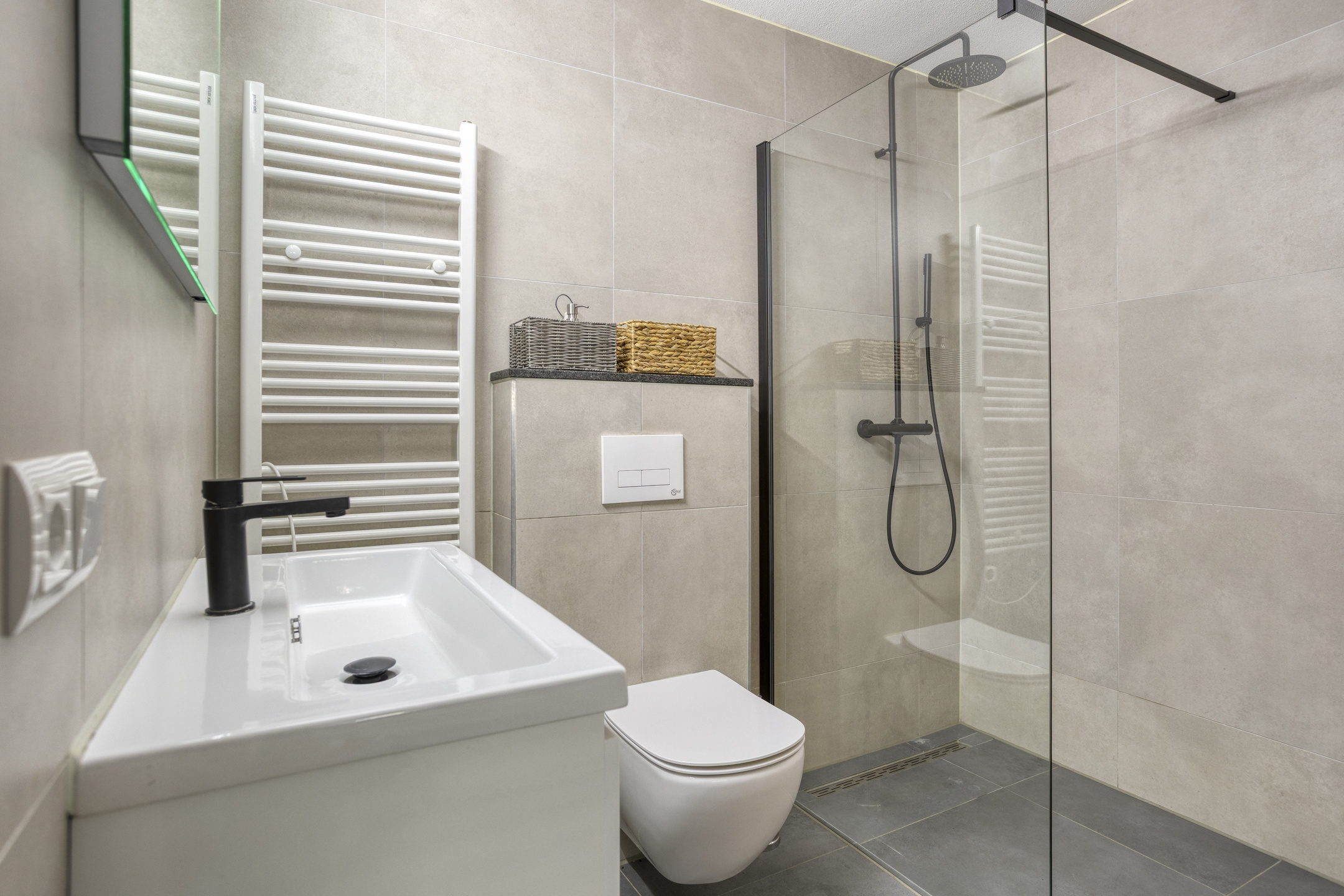 Moderne badkamer: Vanuit het slaapgedeelte bereikt u de strak afgewerkte badkamer, voorzien van een comfortabele douche, een zwevend closet en een moderne wastafel.