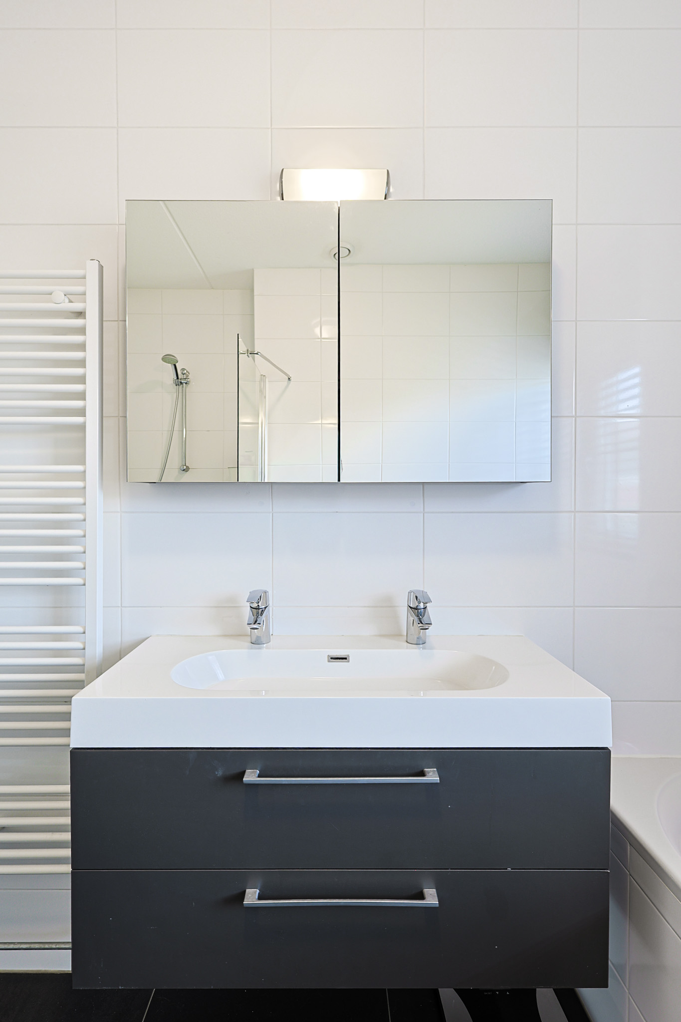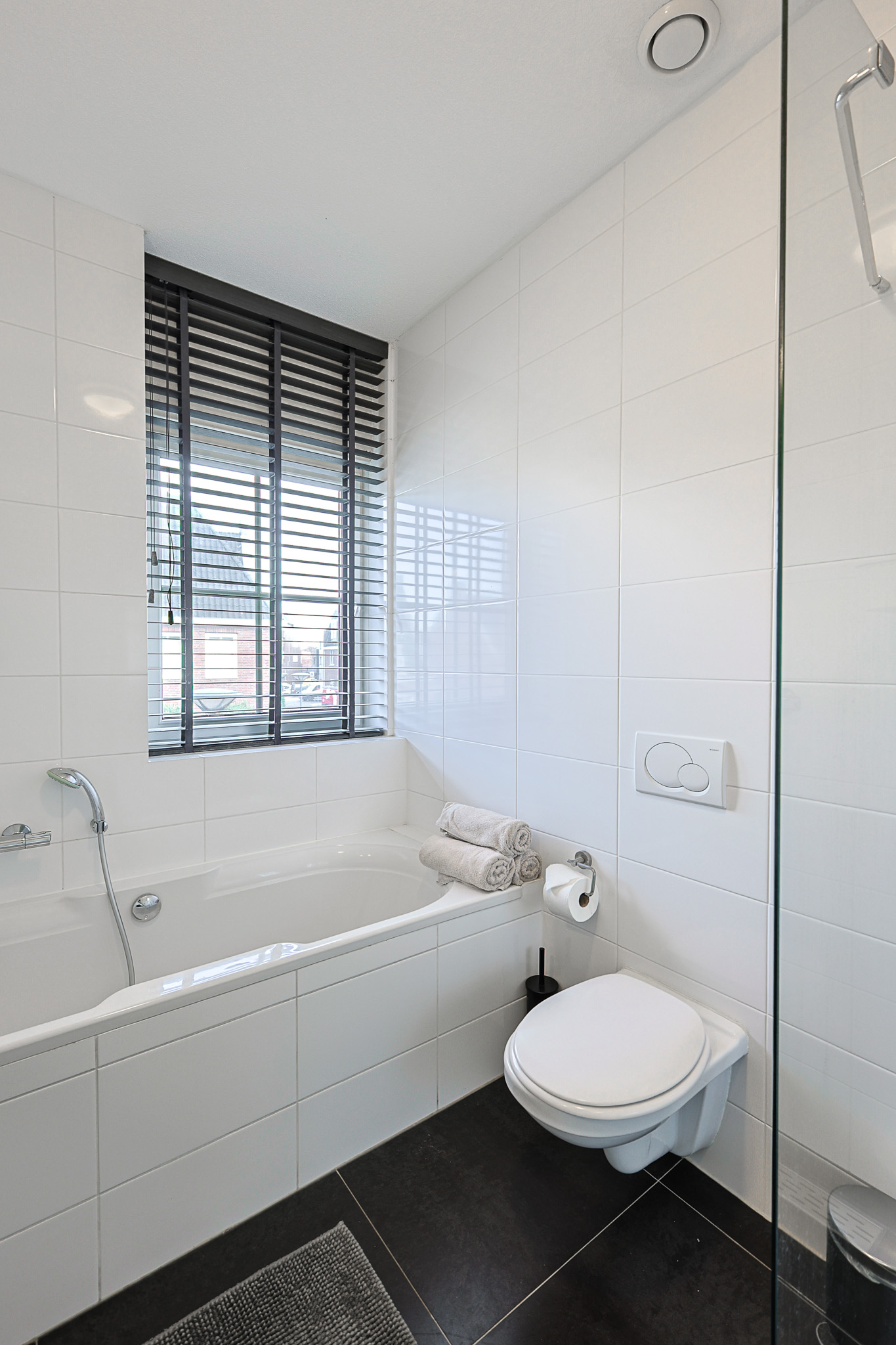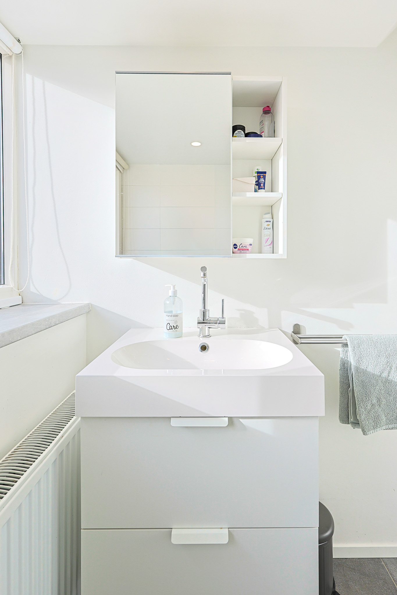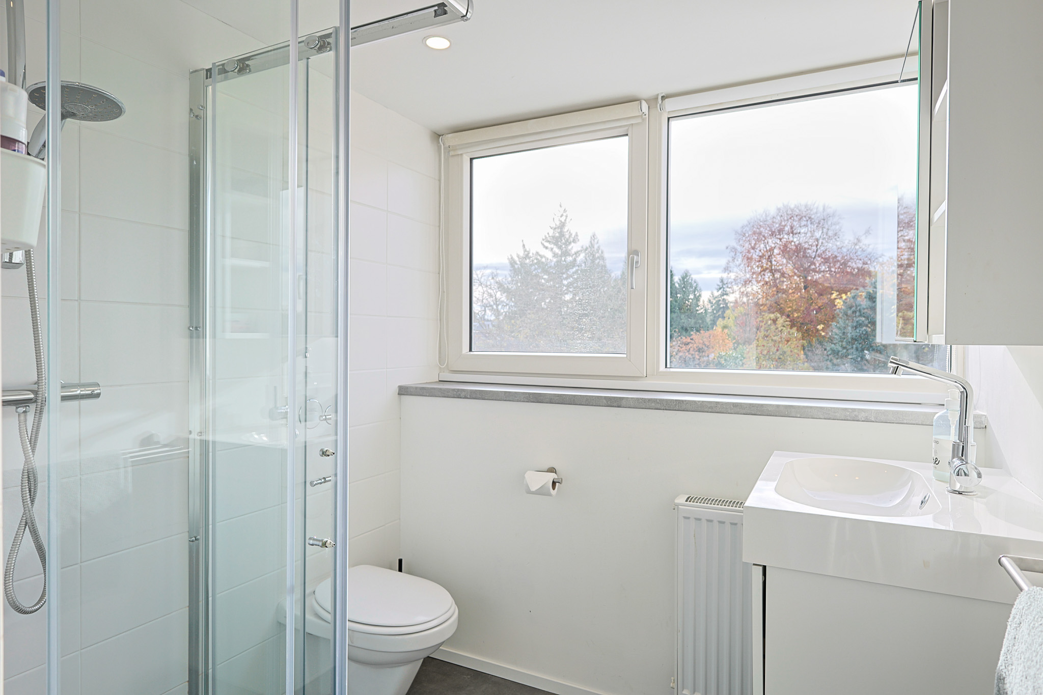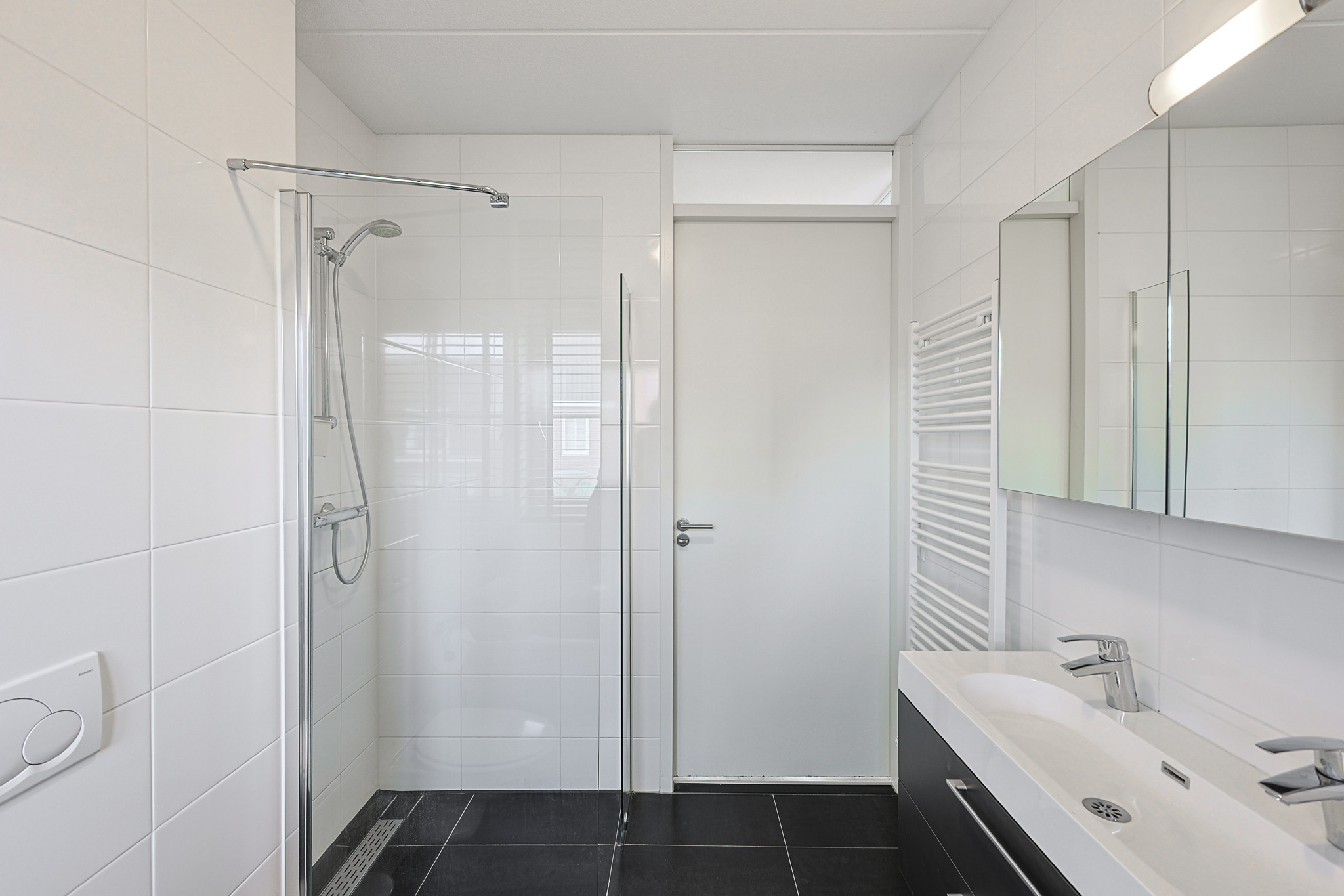 In 2018 is een tweede badkamer gerealiseerd, voorzien van een donkere tegelvloer, douchecabine, hangcloset en wastafel met meubel. Het grote raam, bestaande uit twee delen, heeft één raam met draai/kiepmechanisme en hor.