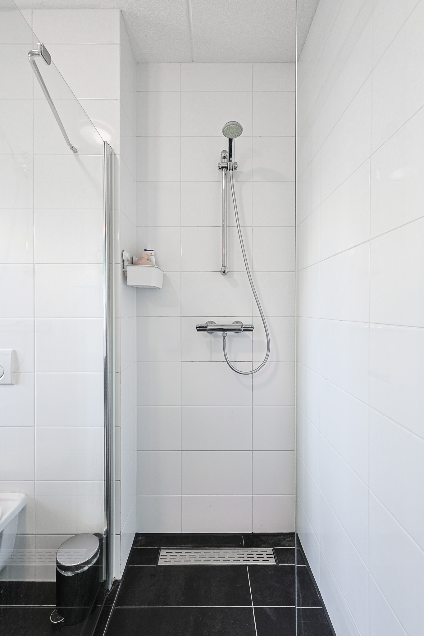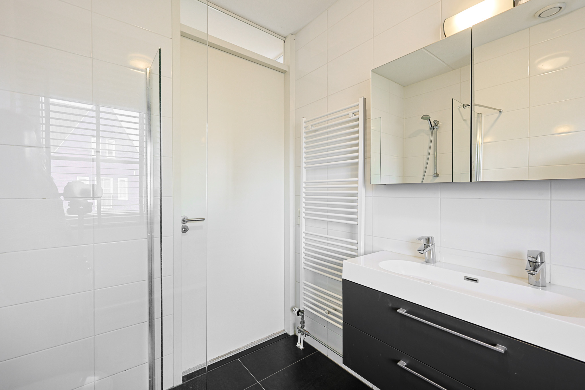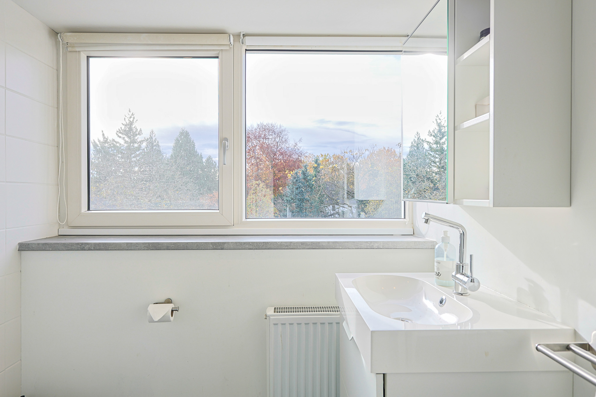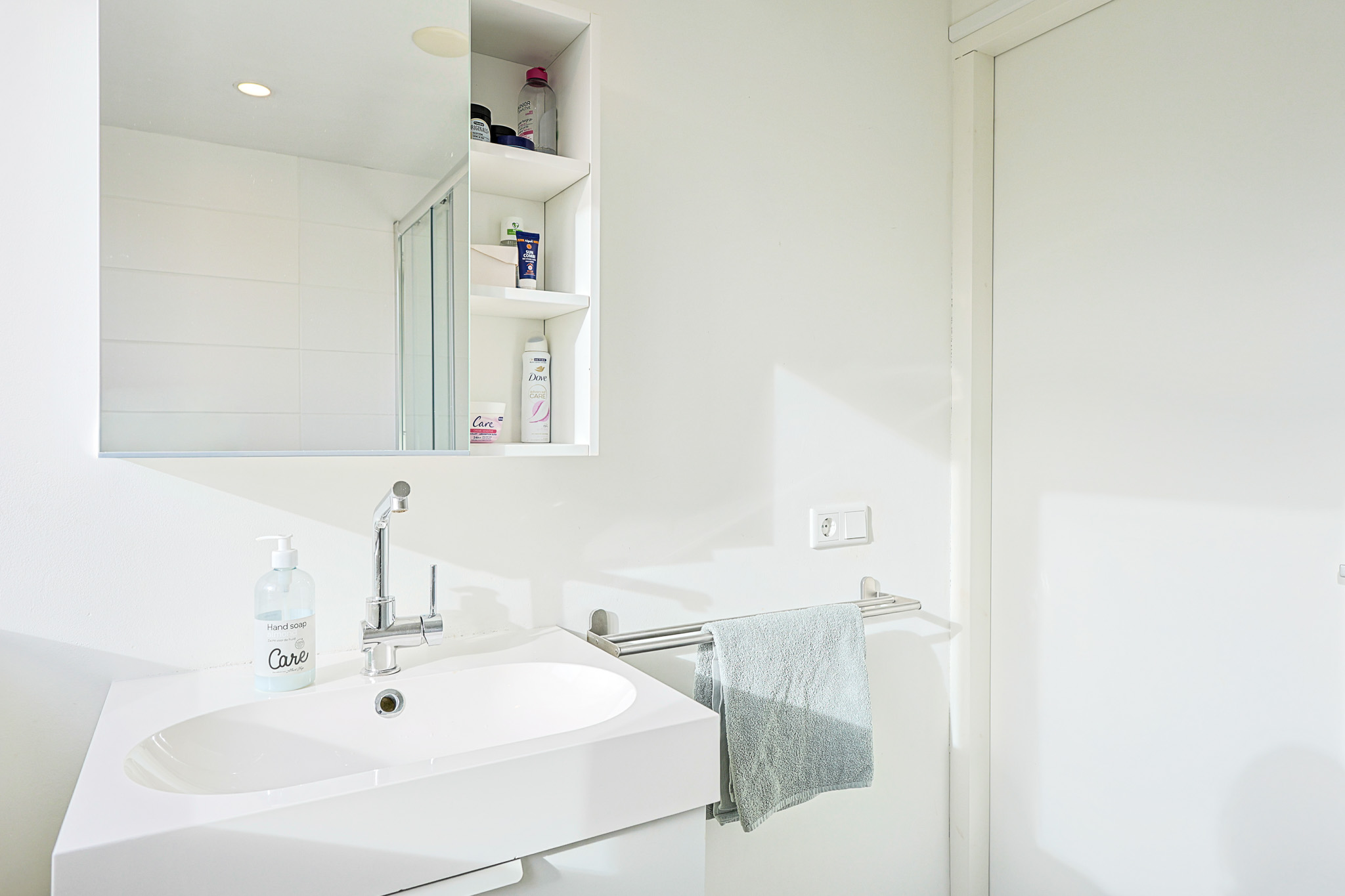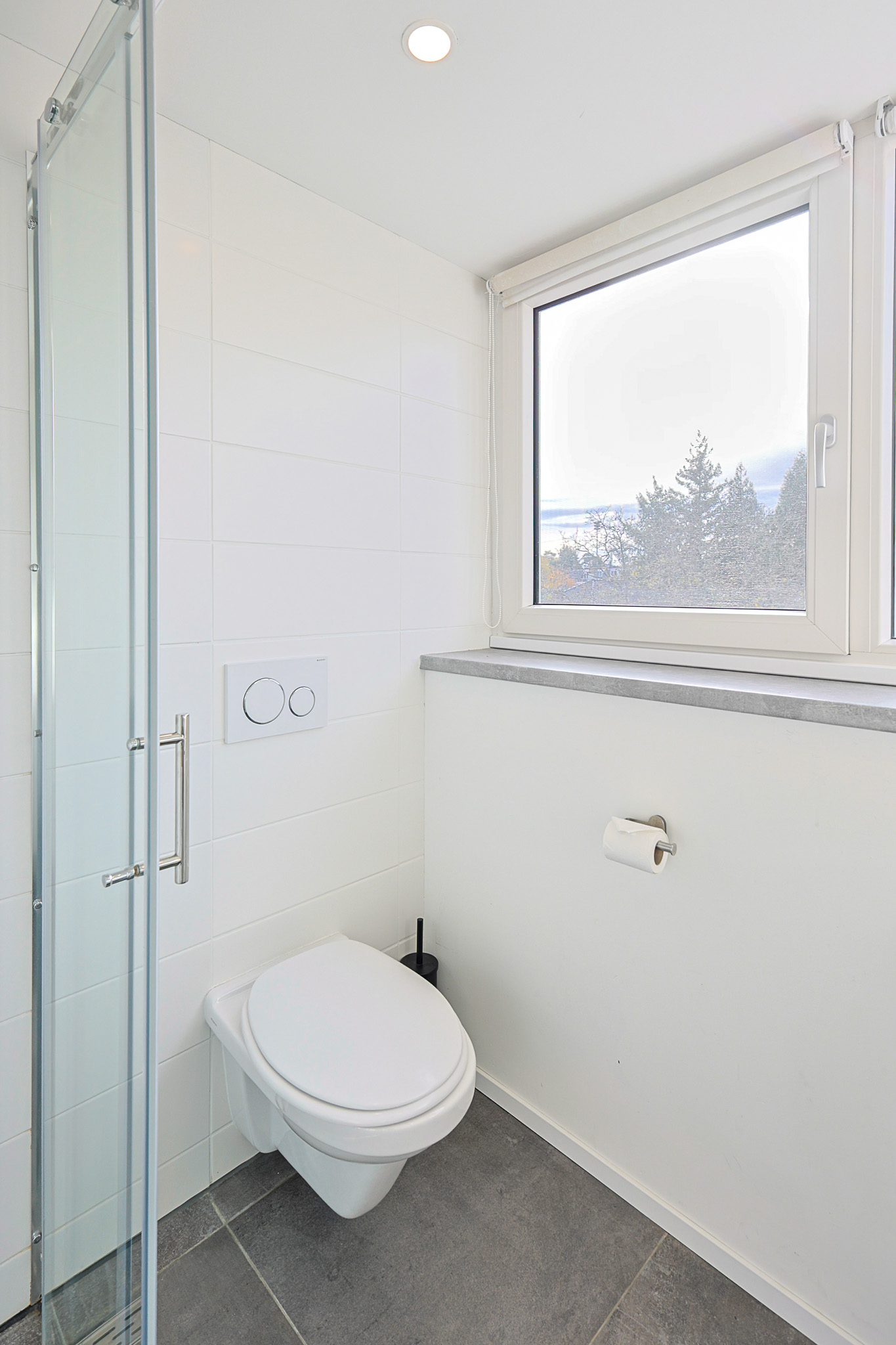 In 2018 is een tweede badkamer gerealiseerd, voorzien van een donkere tegelvloer, douchecabine, hangcloset en wastafel met meubel. Het grote raam, bestaande uit twee delen, heeft één raam met draai/kiepmechanisme en hor.