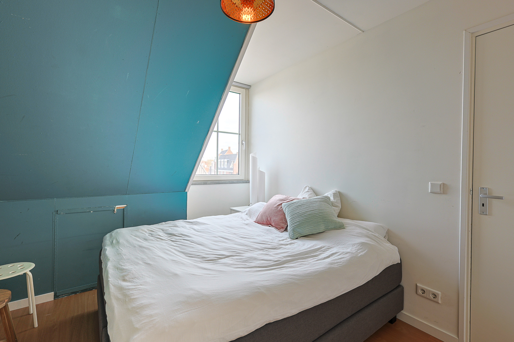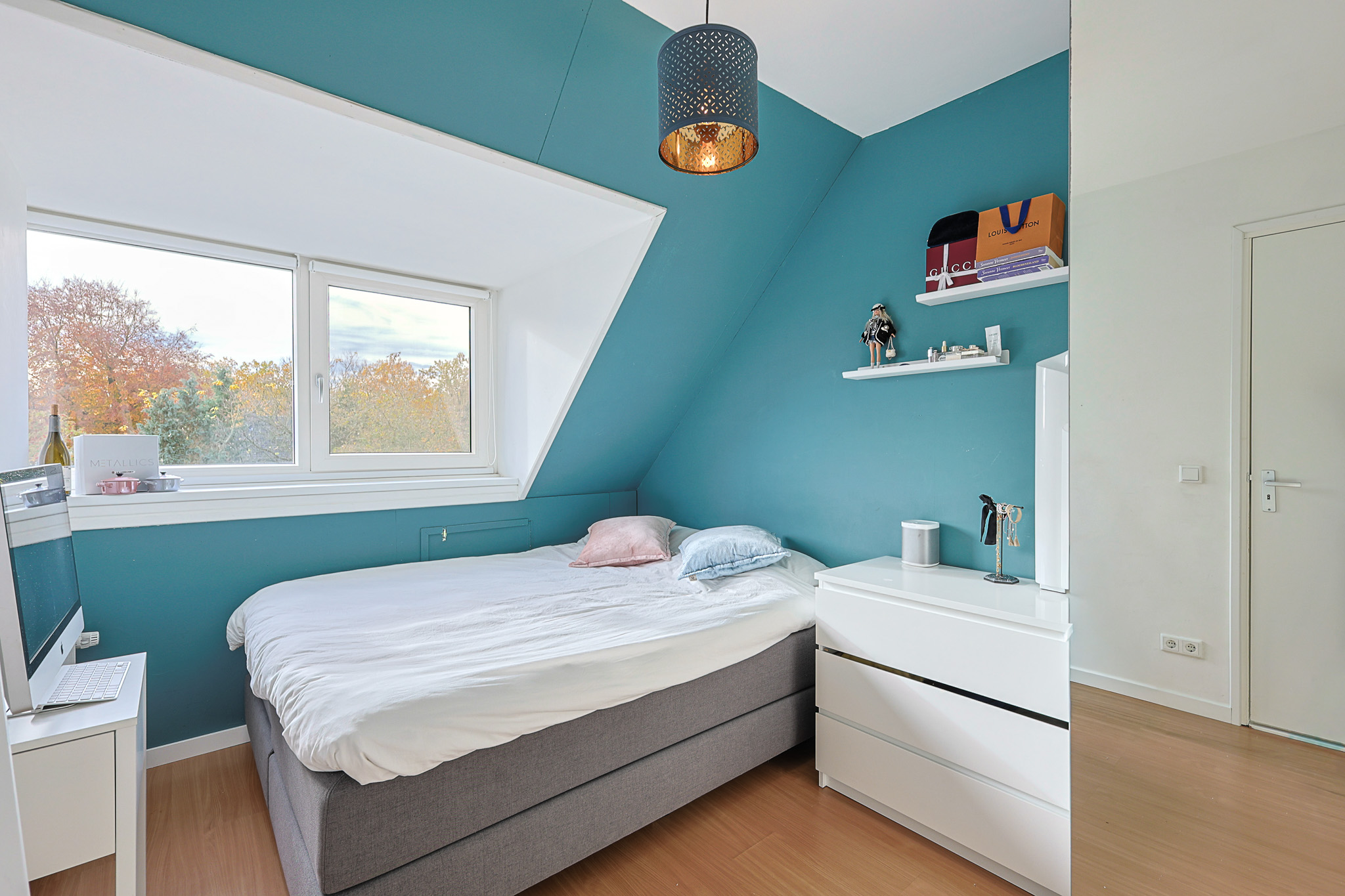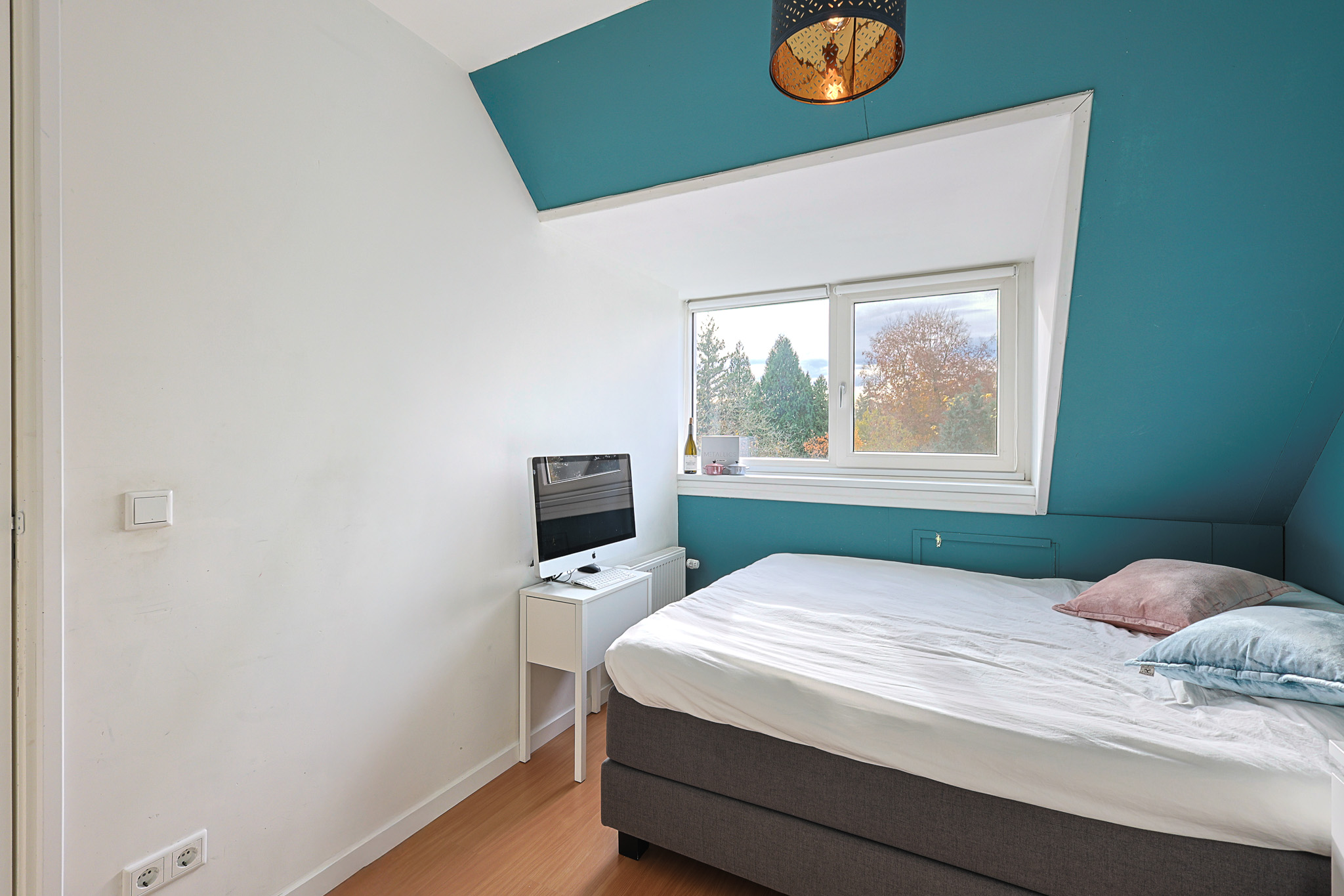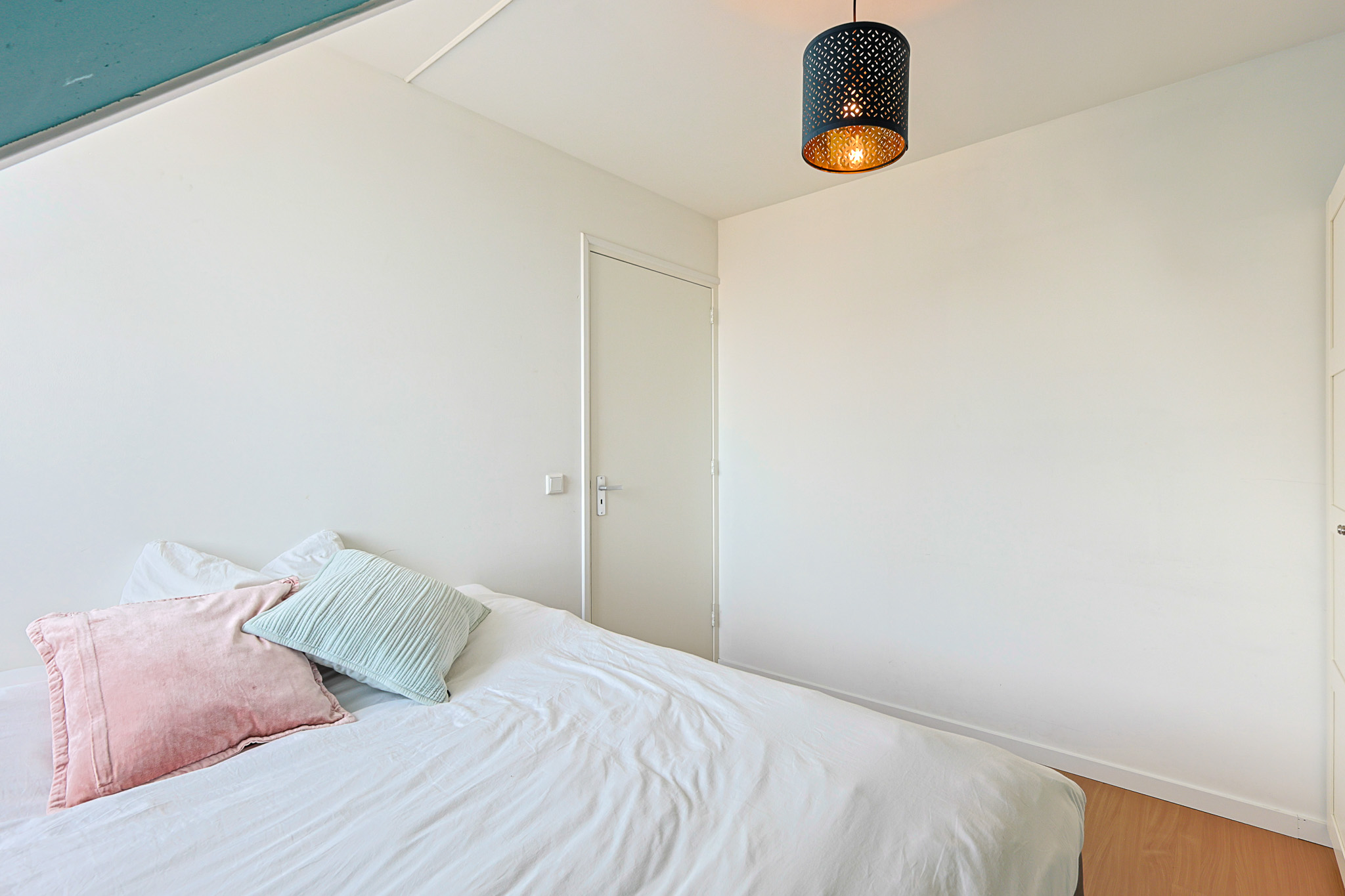 Ruime slaapkamer aan de achterzijde van de woning, met een groot raam, waarvan één raam is uitgevoerd met draaikiepmechanisme en hor. Het dakbeschot biedt extra opbergruimte.
