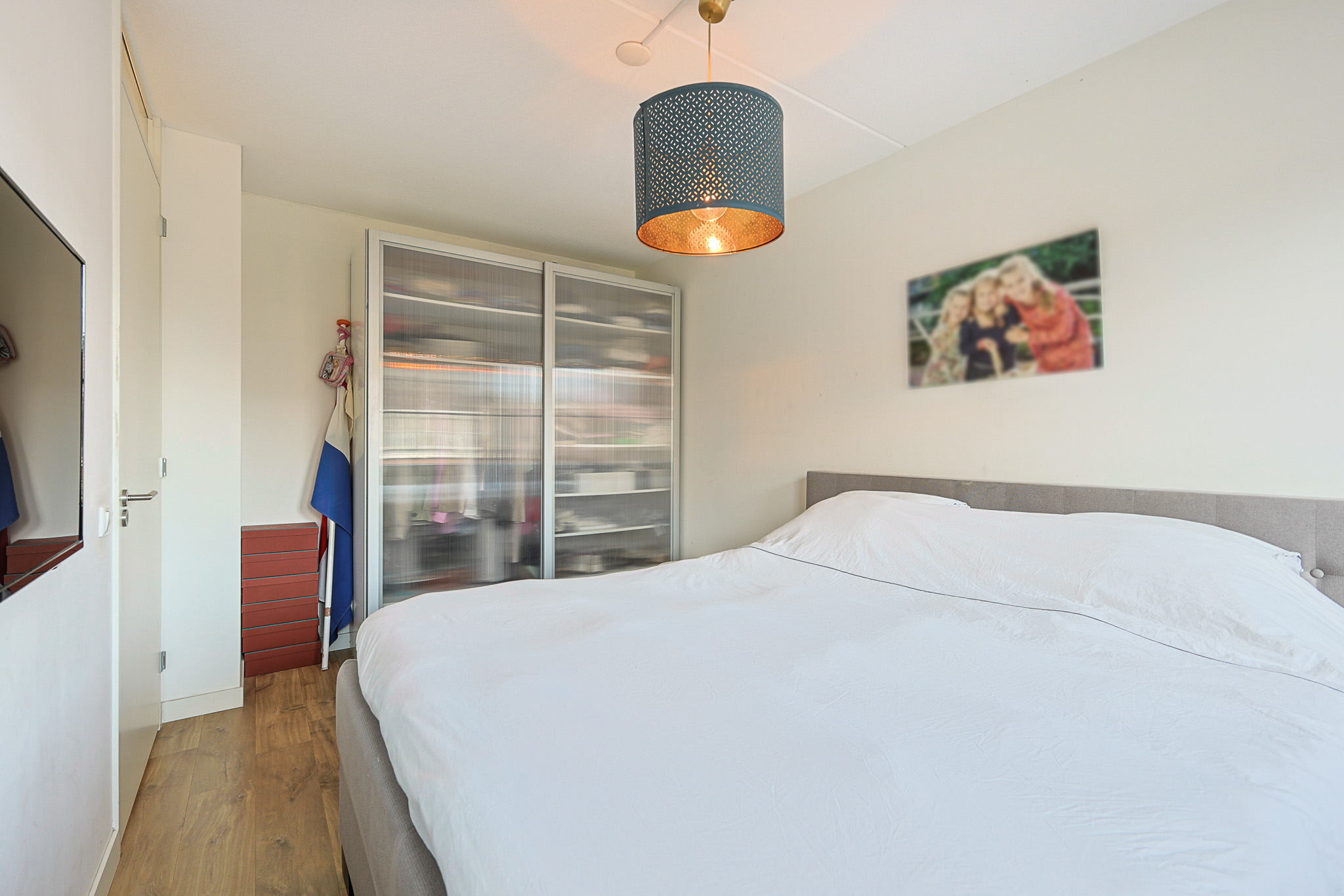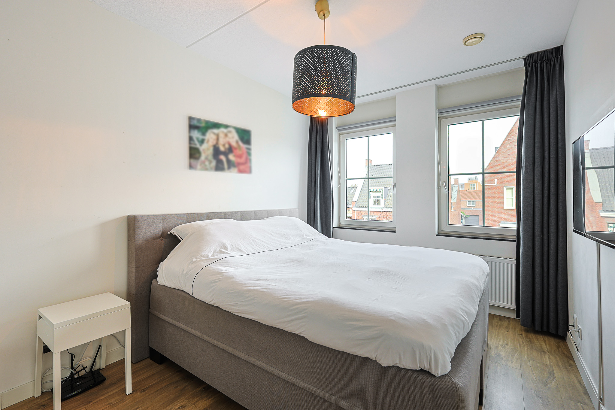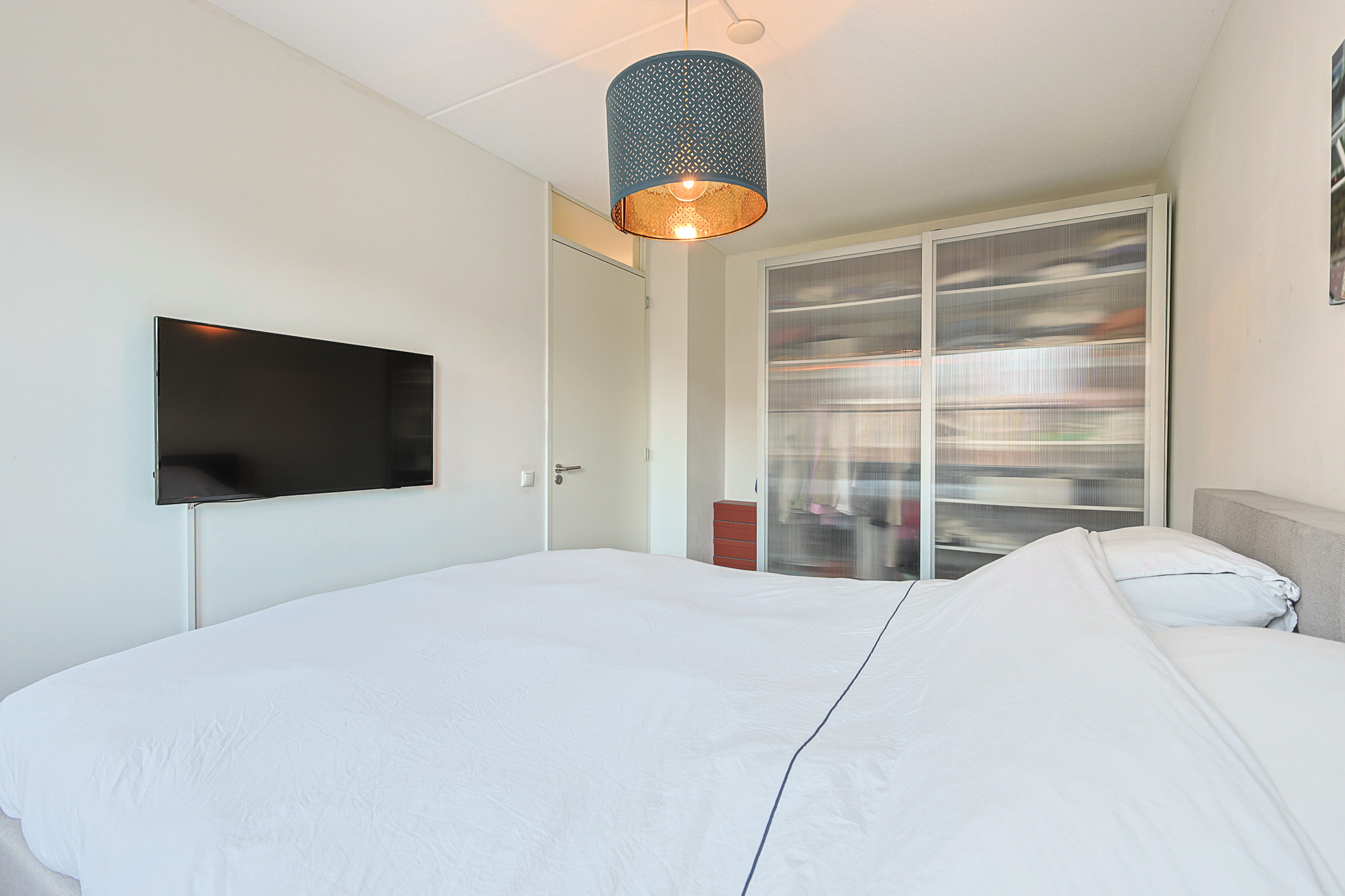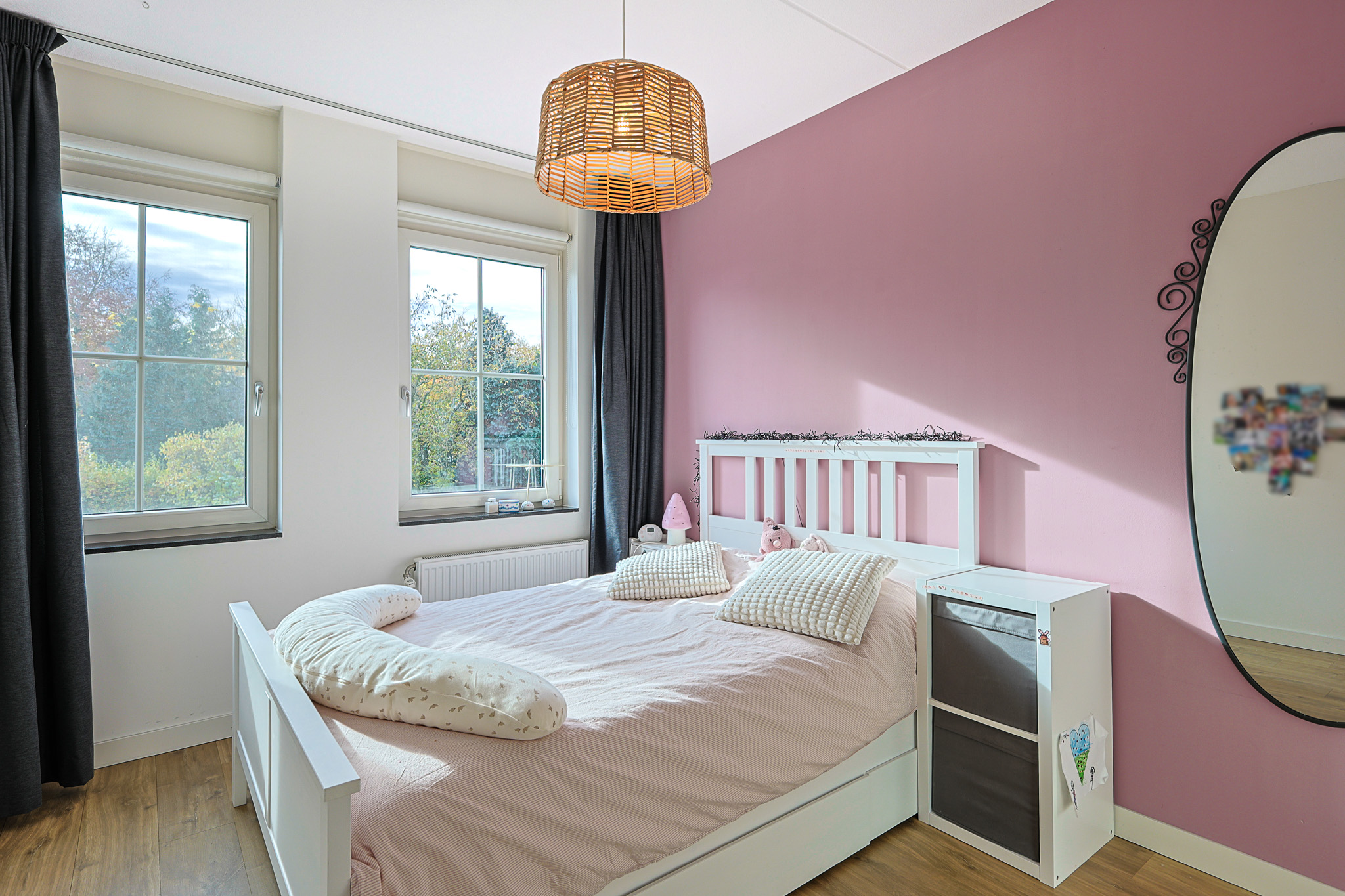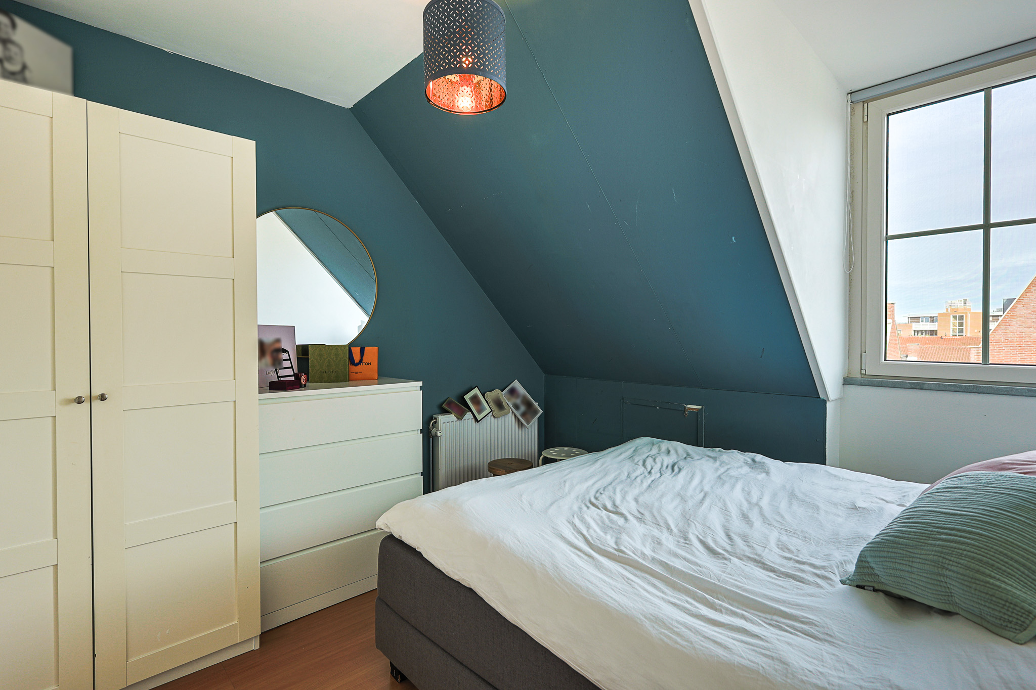 Ruime slaapkamer aan de achterzijde van de woning, met een groot raam, waarvan één raam is uitgevoerd met draaikiepmechanisme en hor. Het dakbeschot biedt extra opbergruimte.