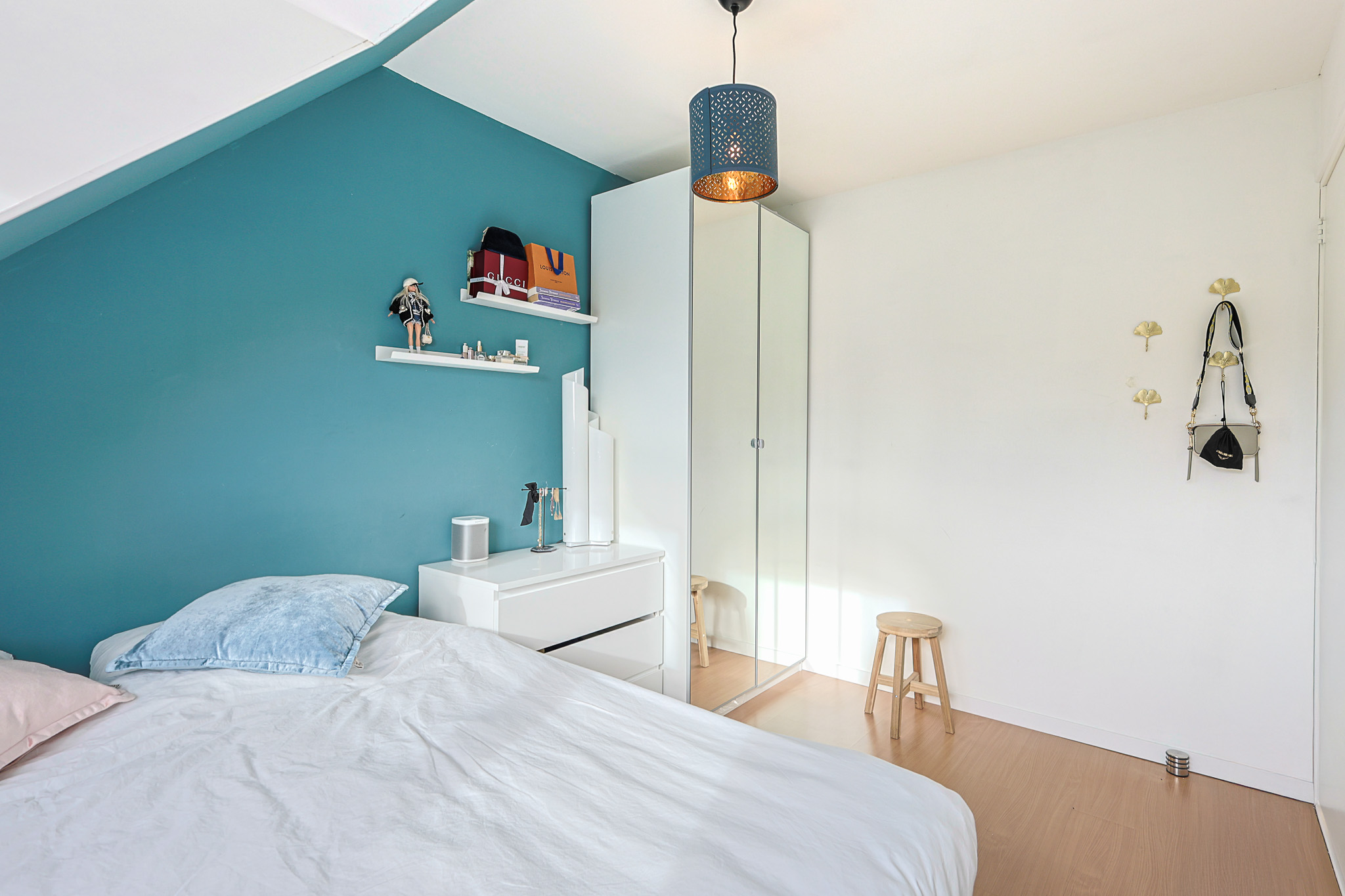 Deze slaapkamer ligt aan de voorzijde van de woning en is voorzien van een raam met draaikiepmechanisme en hor. Het dakbeschot biedt ook hier extra opbergruimte.