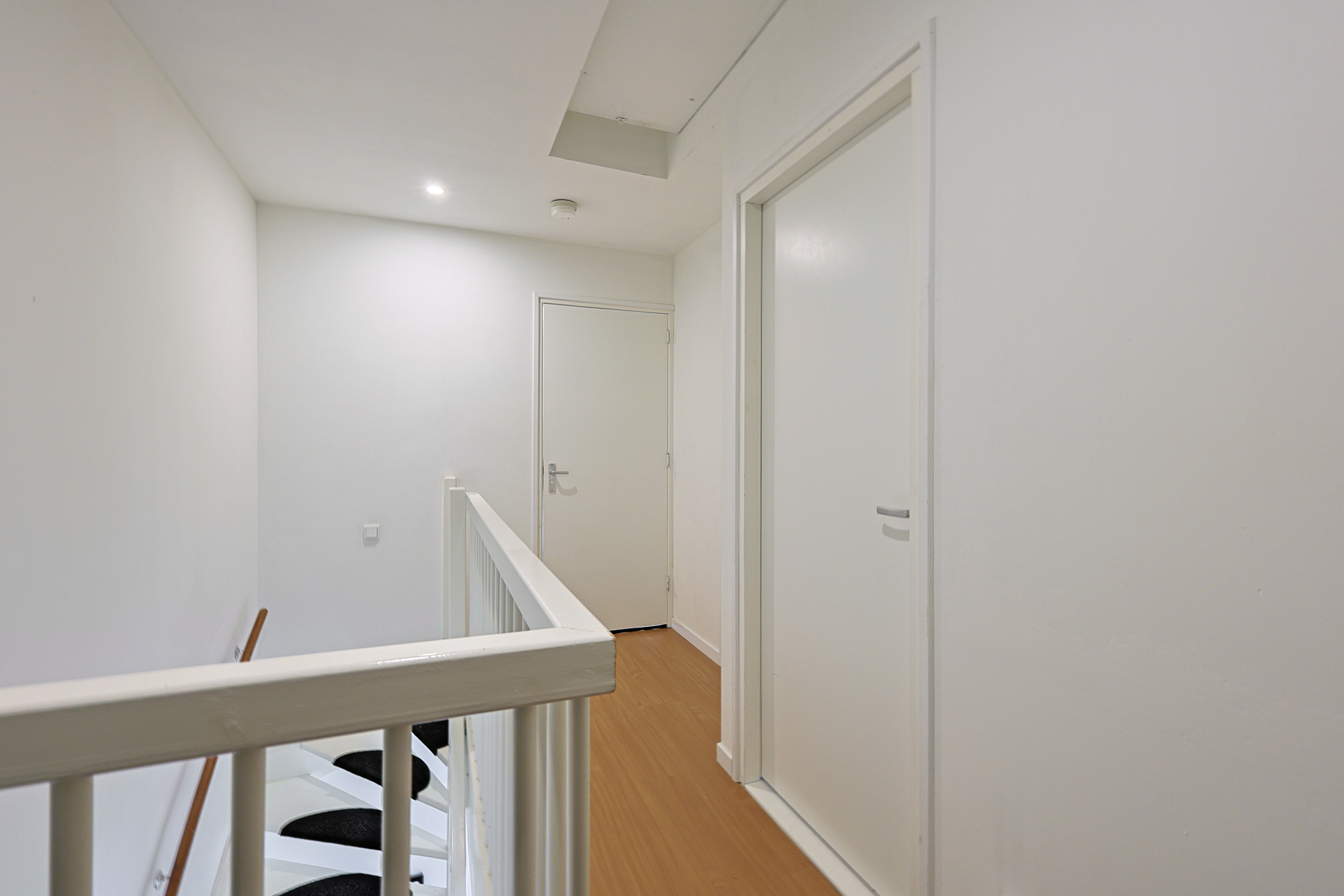 De overloop is voorzien van een laminaatvloer en biedt toegang tot drie slaapkamers, de badkamer en de tweede verdieping via een vaste trap.