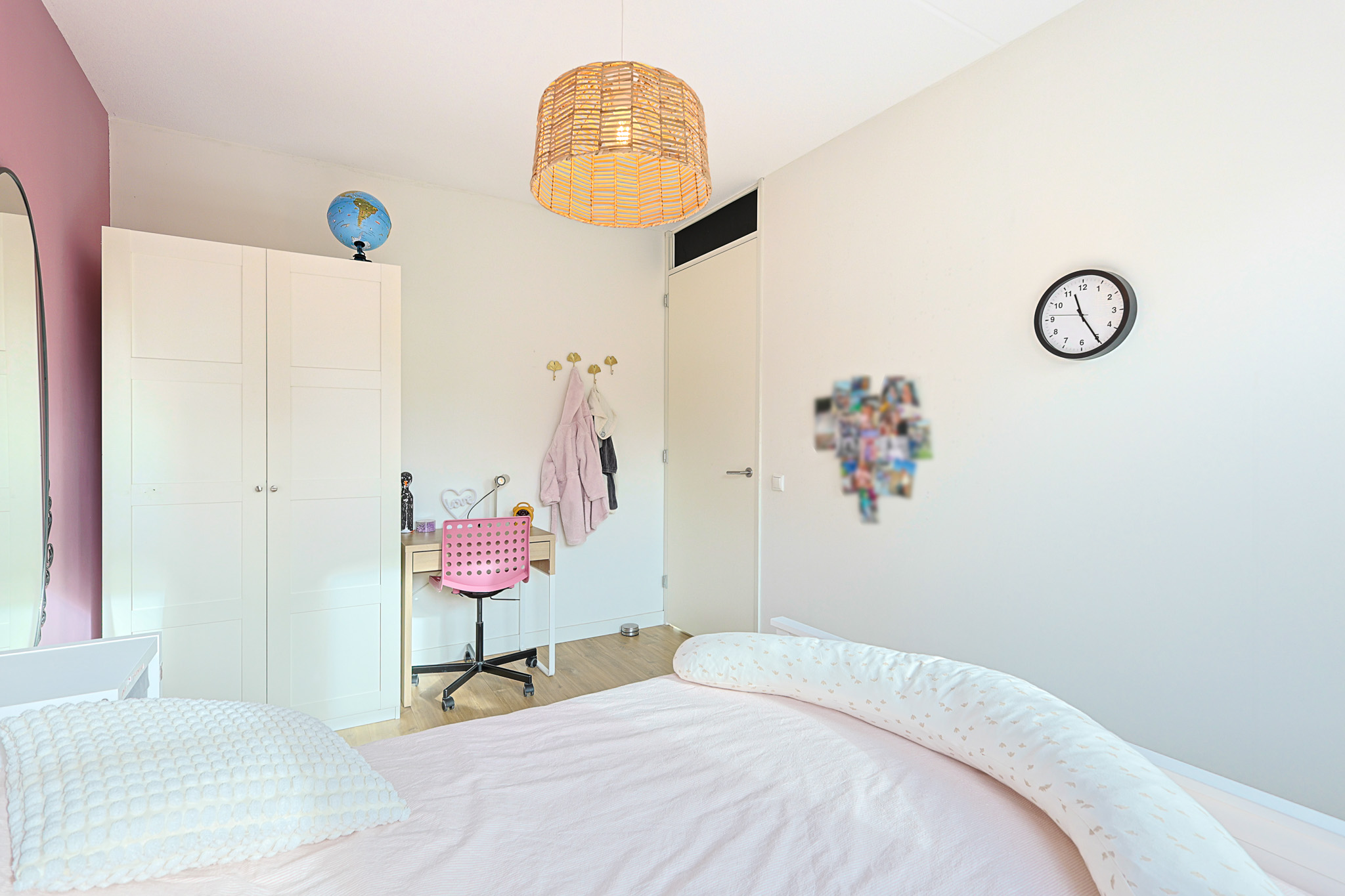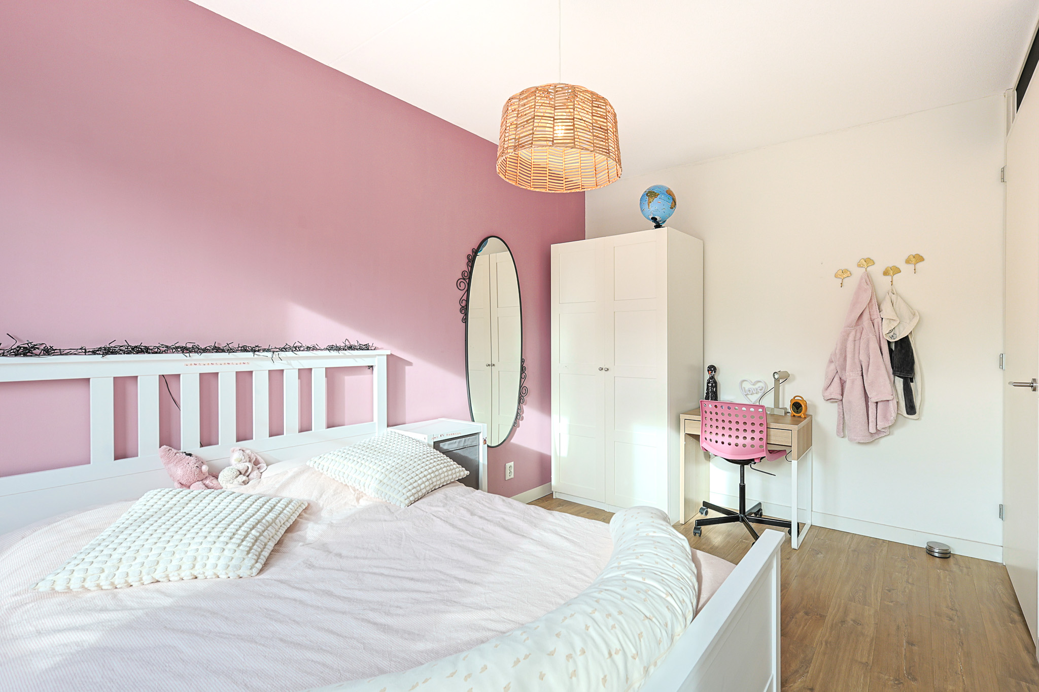 Deze slaapkamer ligt eveneens aan de achterzijde van de woning, voorzien van laminaatvloer en een raampartij met draaikiepmechanisme en hor.