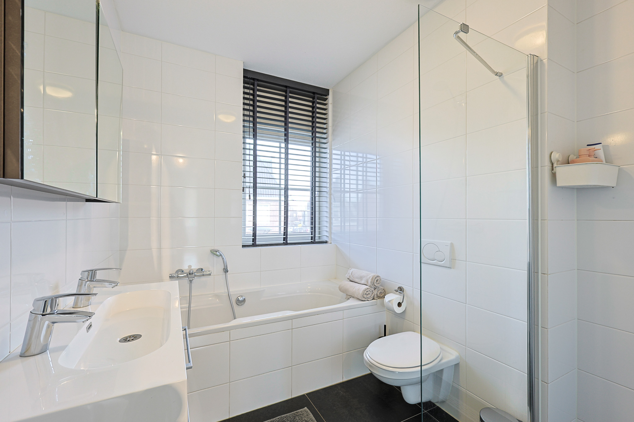 Volledig betegelde badkamer met lichte wandtegels en een donkere tegelvloer. De ruimte is voorzien van een dubbele wastafel met meubel, inloopdouche met glazen wand, royaal ligbad, hangcloset en een raampartij met draaikiepmechanisme.