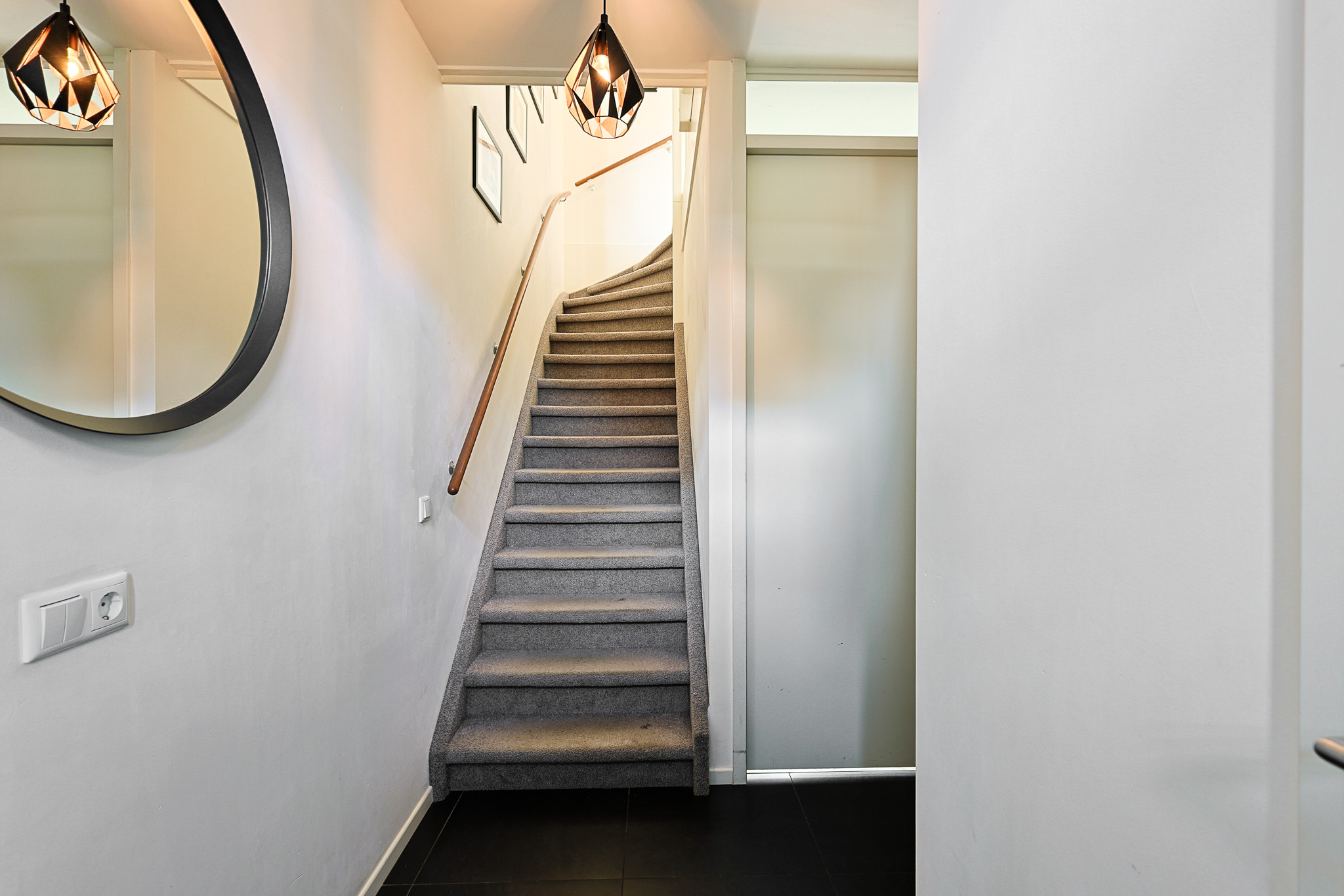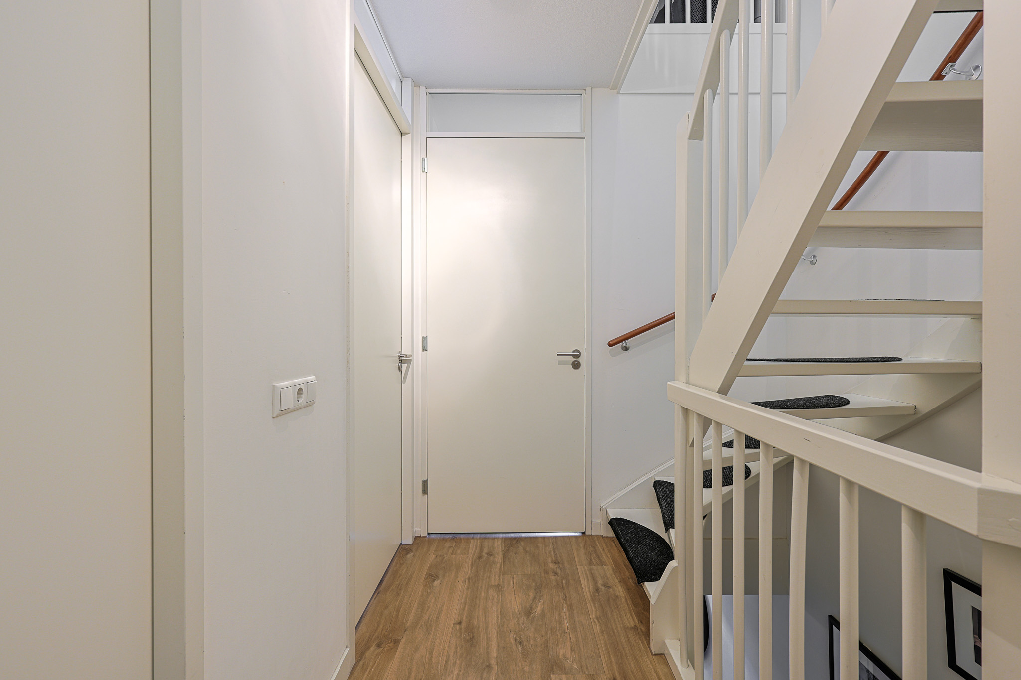 De hal is voorzien van een donkere tegelvloer, een garderobenis, de meterkast, en biedt toegang tot het toilet, de woonkamer en de eerste verdieping.