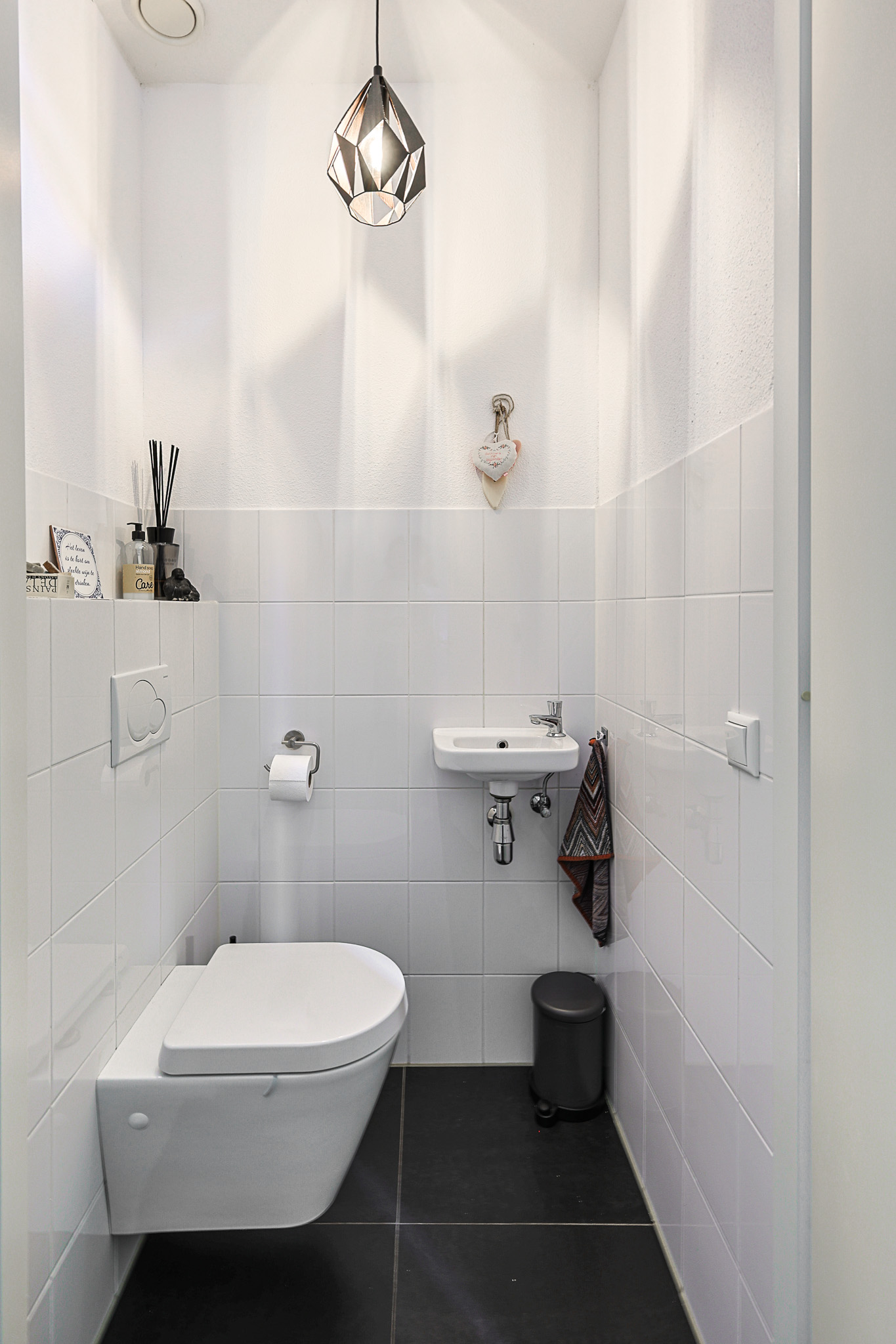 De wanden van het toilet zijn deels betegeld in een lichte kleurstelling. Het toilet is uitgerust met een hangcloset, een fonteintje en mechanische ventilatie.