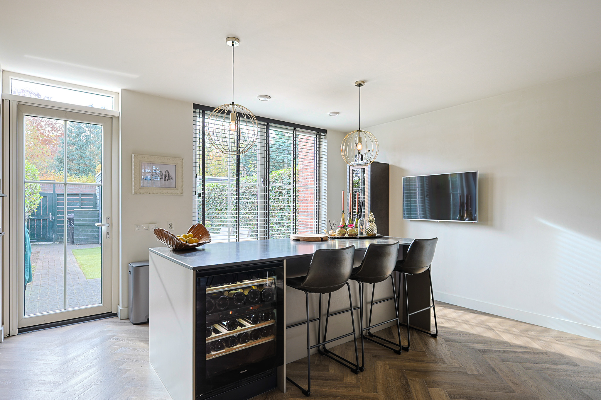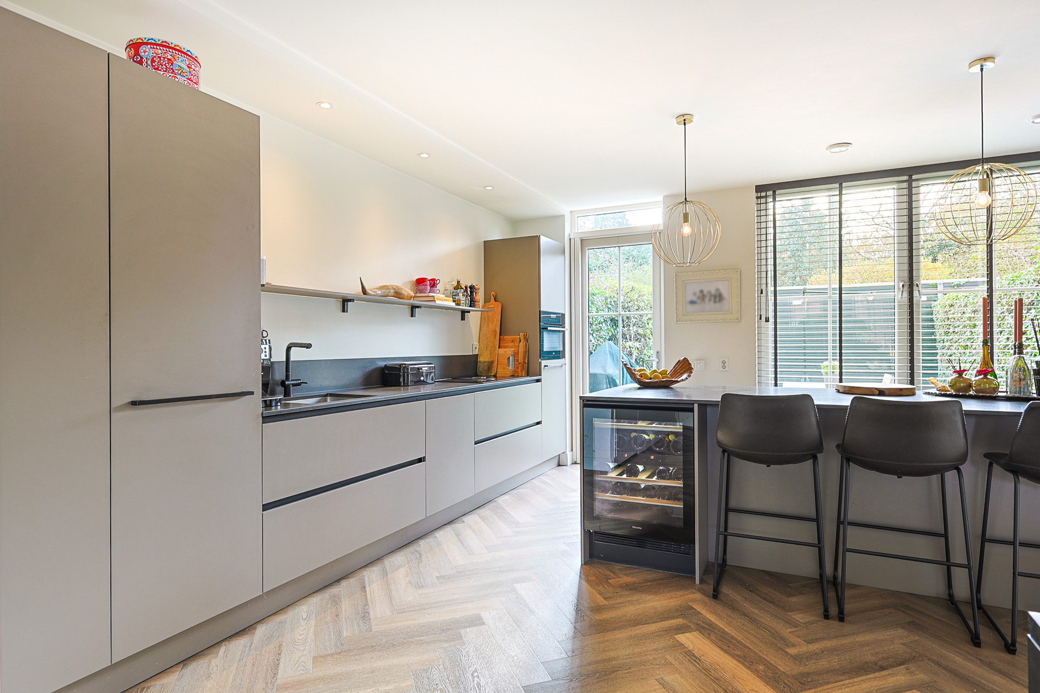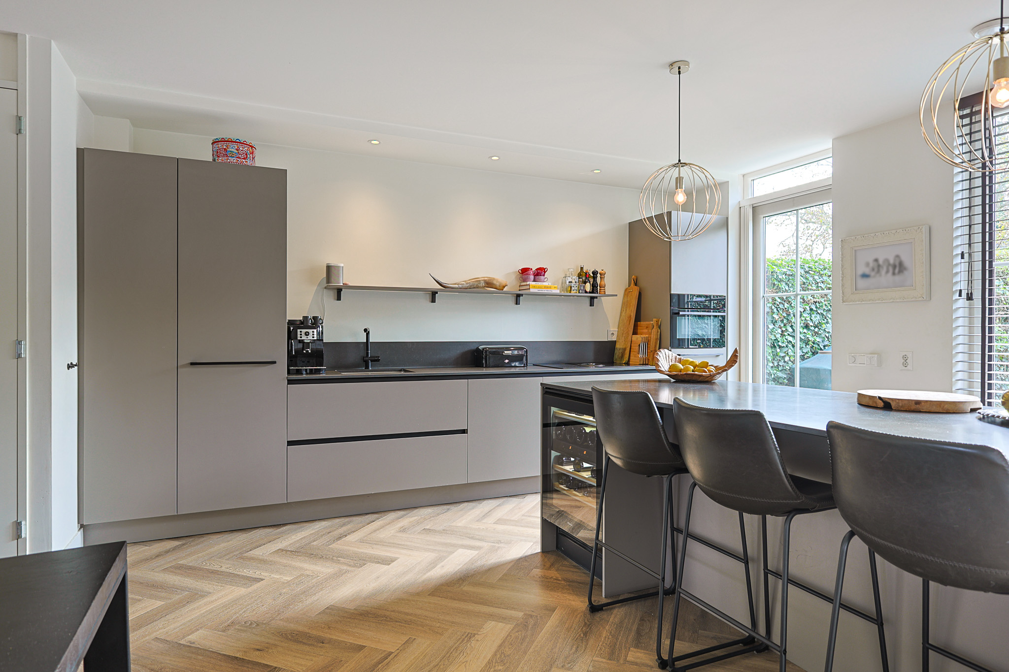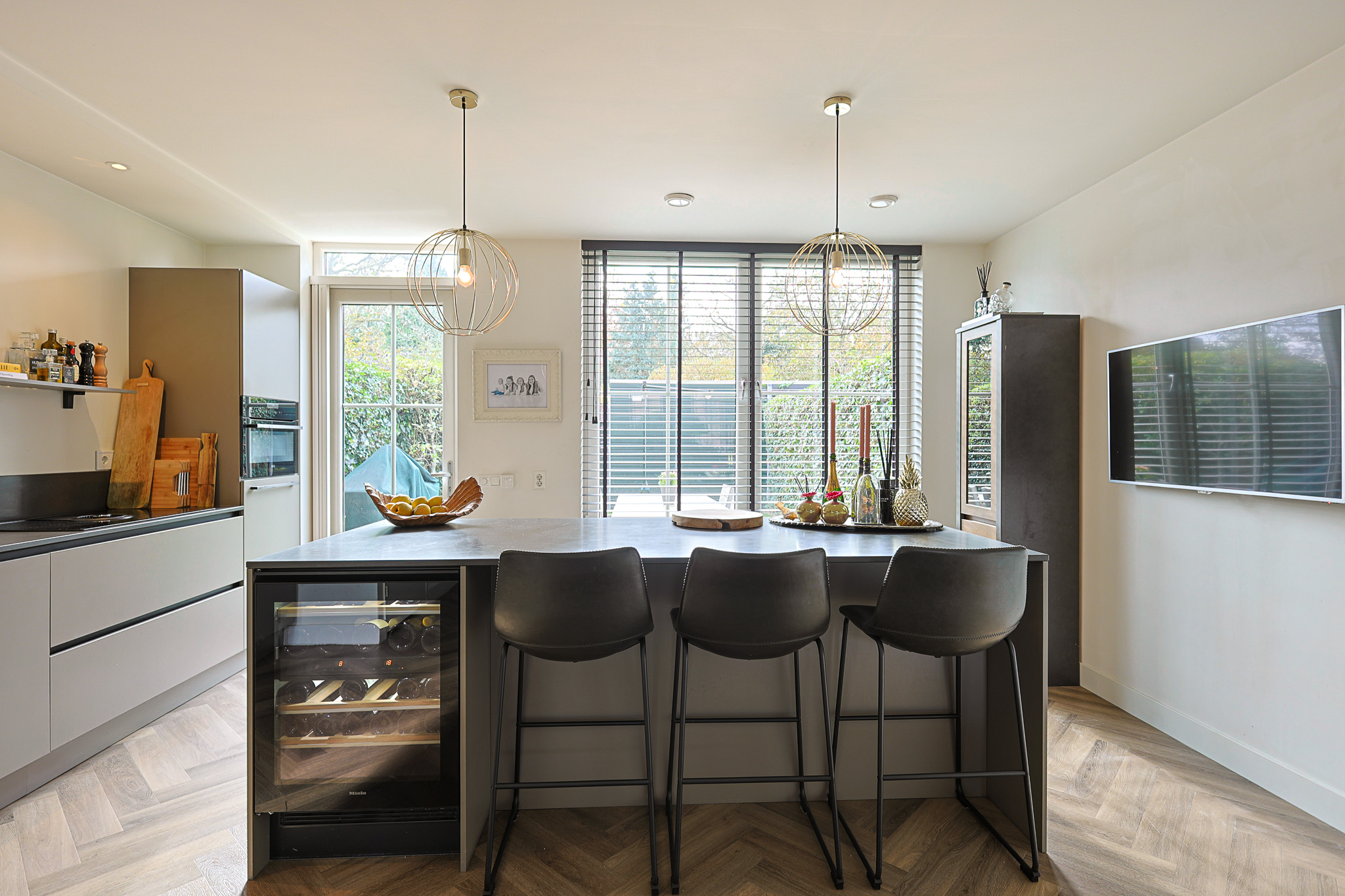 De moderne keuken uit 2020 vormt het hart van de begane grond. Het ruime kookeiland biedt veel opbergruimte en is uitgerust met een vaatwasser en een wijnklimaatkast, evenals een fijne zitplek. Langs de wand bevinden zich hoge kasten met een royaal werkblad, waarin een 4-pits inductiekookplaat met geïntegreerde afzuiging, een koelkast, een vriezer en een combi-oven zijn ingebouwd. Het grote raam geeft een mooi zicht op de achtertuin, die bereikbaar is via een deur met hor.