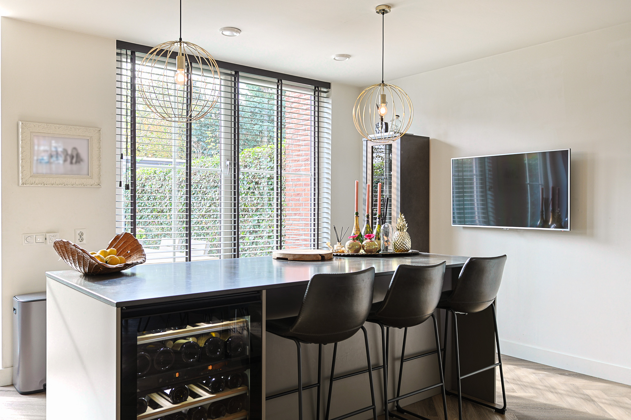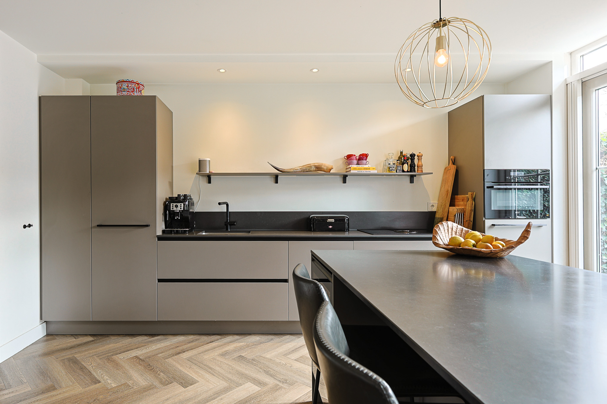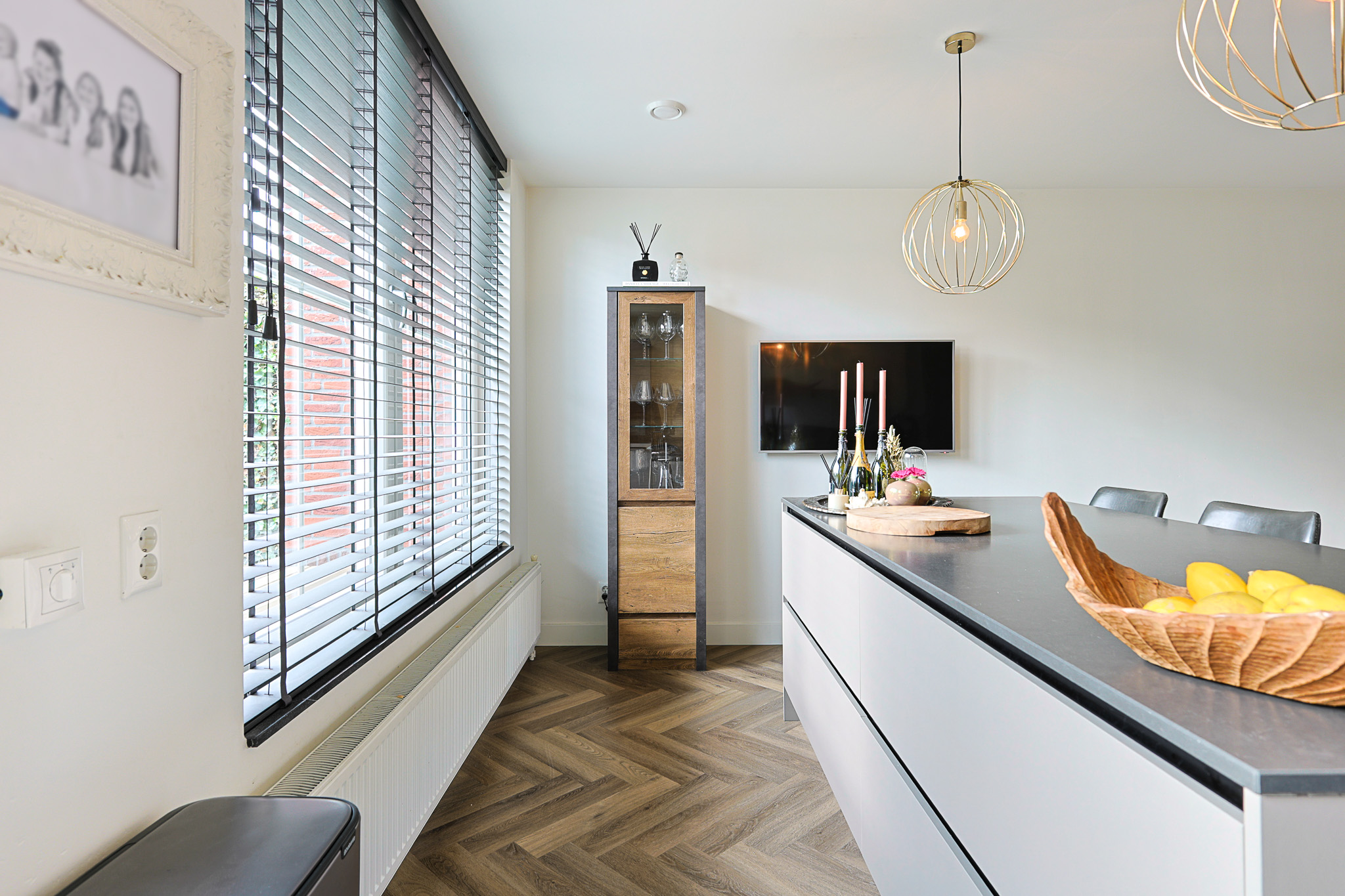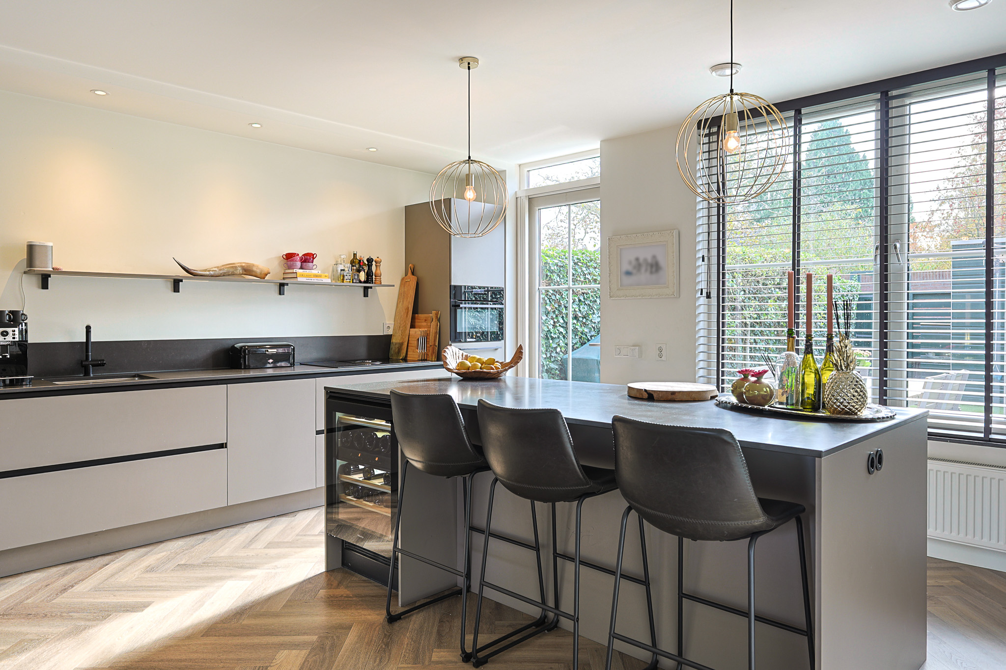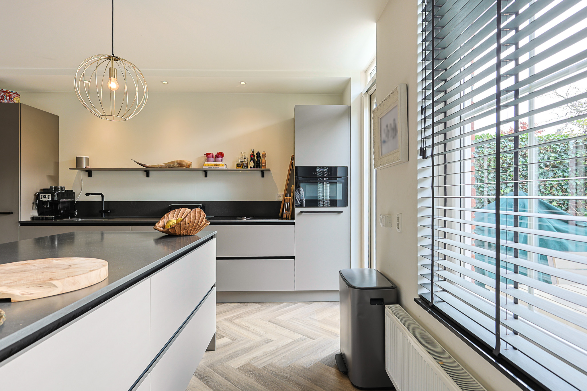 De moderne keuken uit 2020 vormt het hart van de begane grond. Het ruime kookeiland biedt veel opbergruimte en is uitgerust met een vaatwasser en een wijnklimaatkast, evenals een fijne zitplek. Langs de wand bevinden zich hoge kasten met een royaal werkblad, waarin een 4-pits inductiekookplaat met geïntegreerde afzuiging, een koelkast, een vriezer en een combi-oven zijn ingebouwd. Het grote raam geeft een mooi zicht op de achtertuin, die bereikbaar is via een deur met hor.