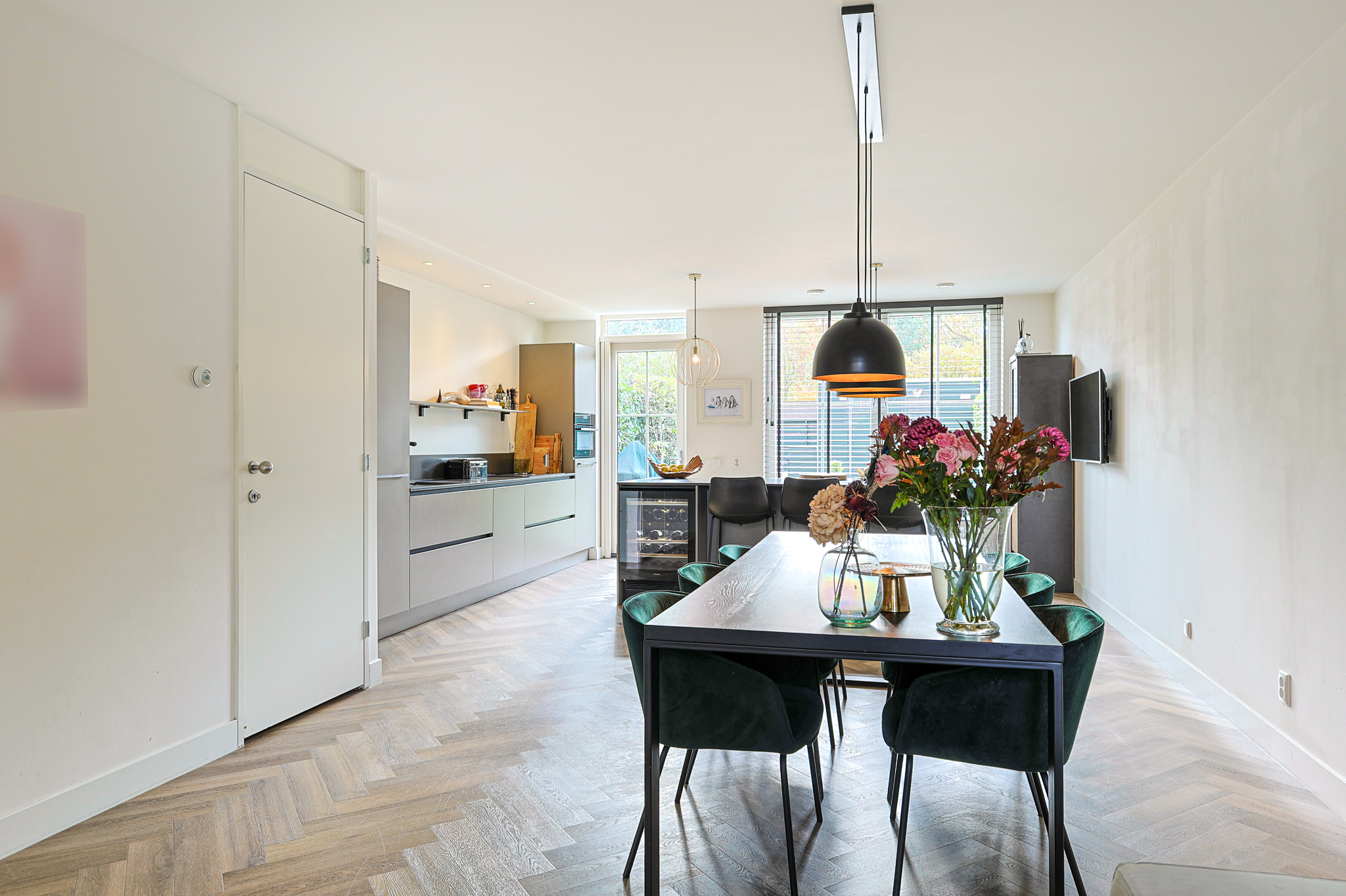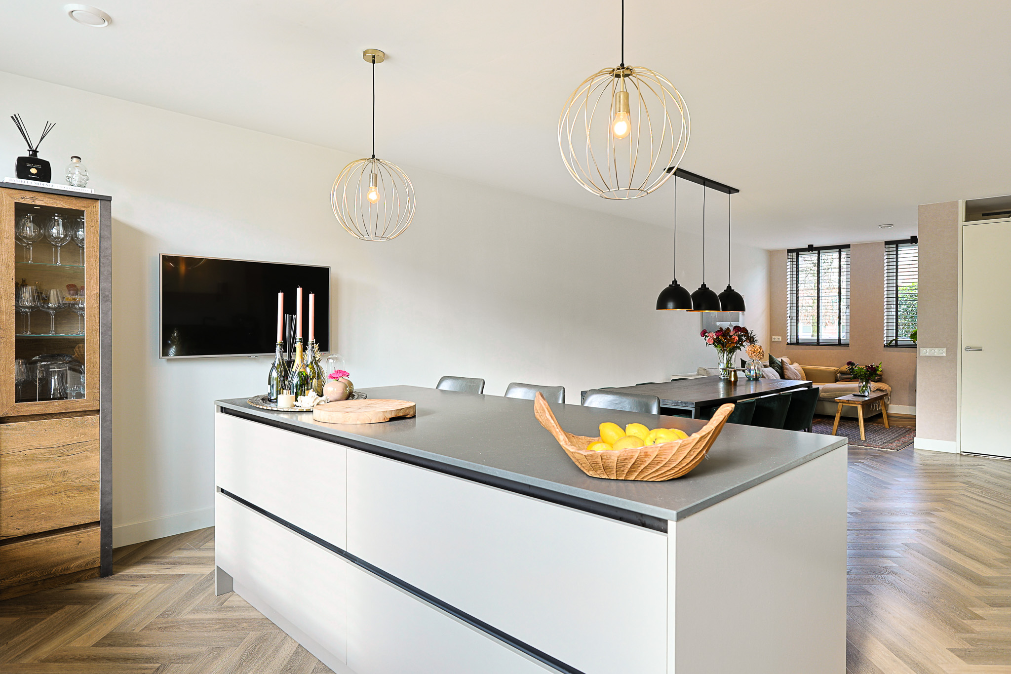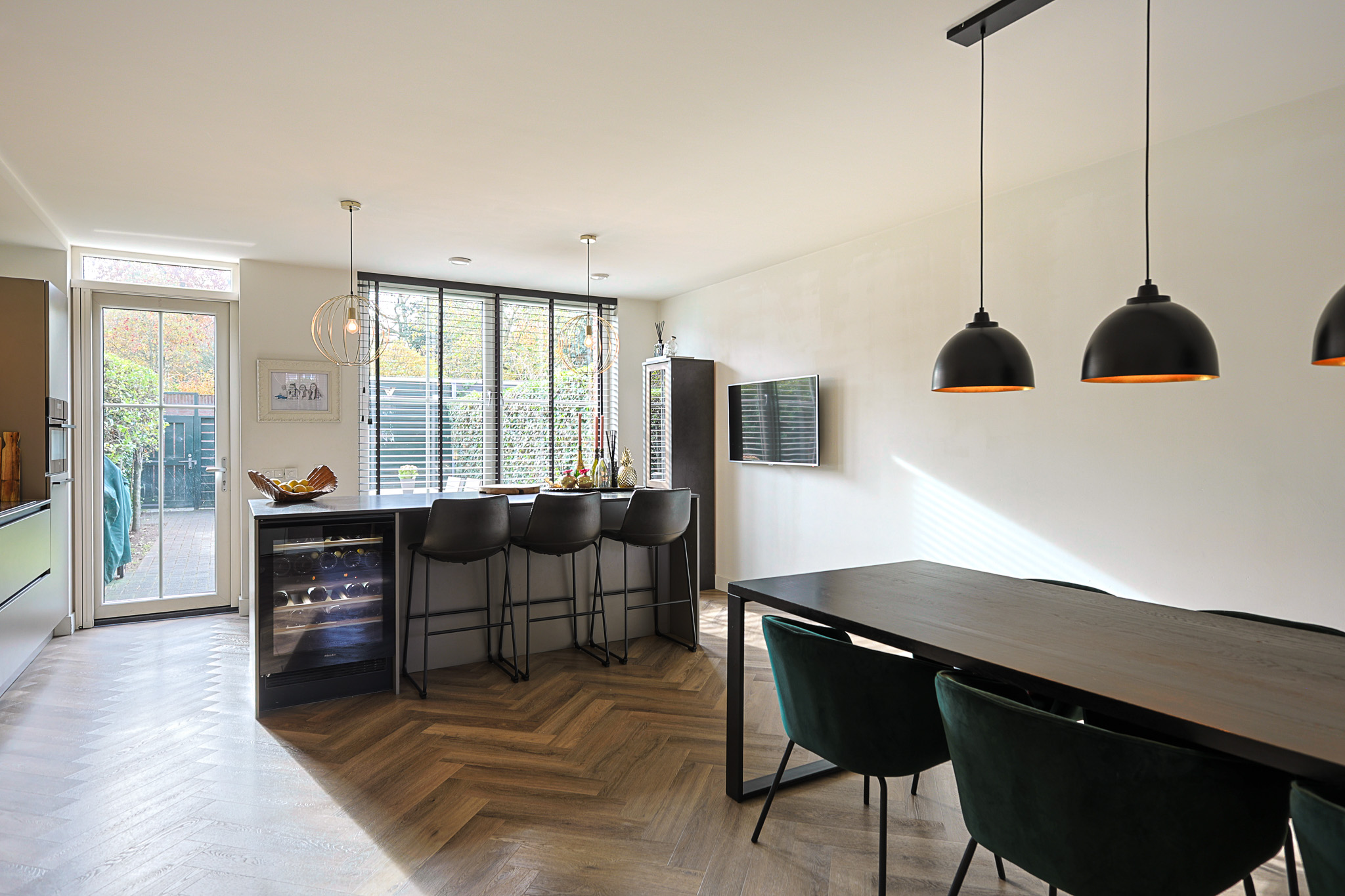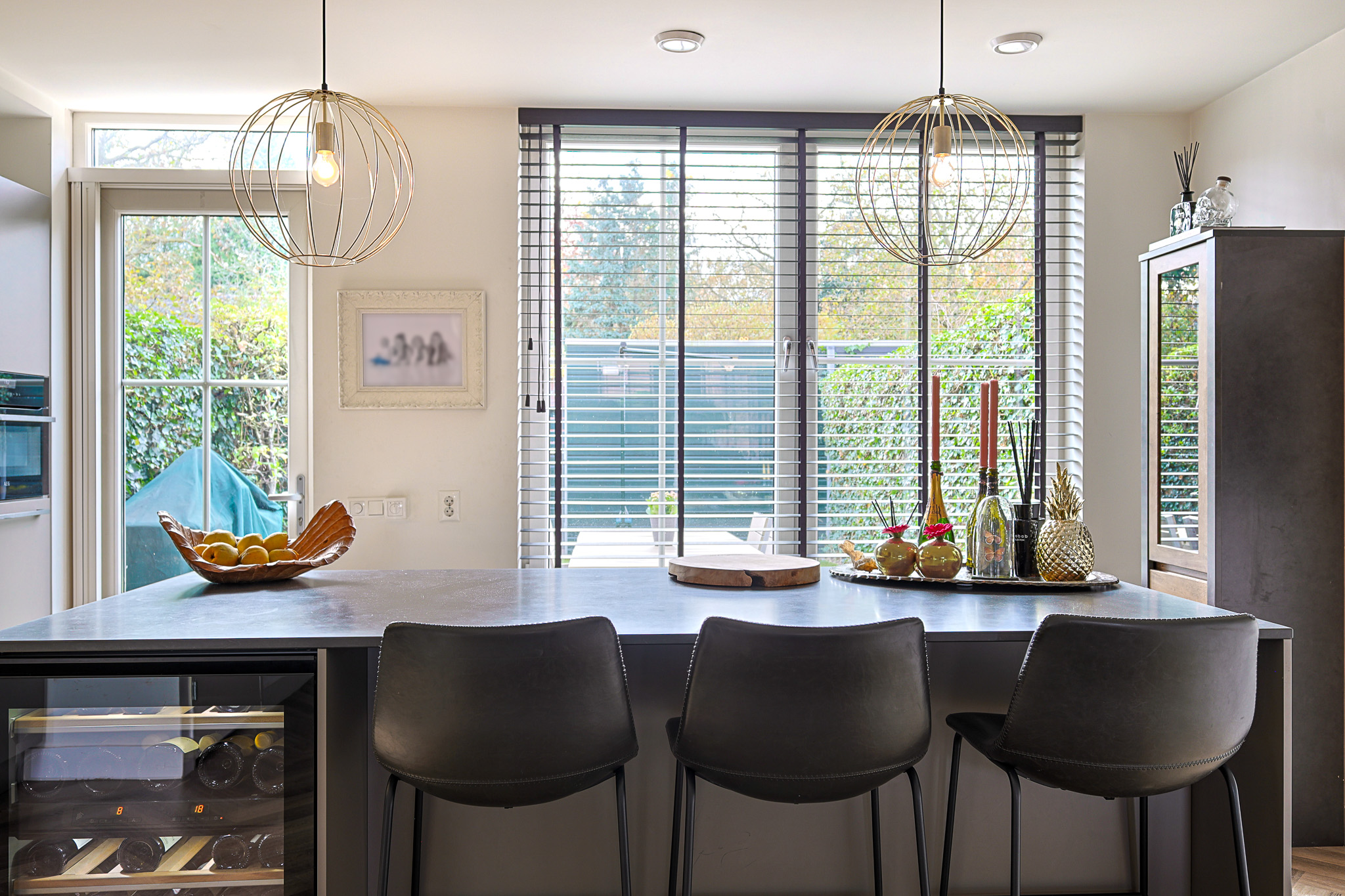 De moderne keuken uit 2020 vormt het hart van de begane grond. Het ruime kookeiland biedt veel opbergruimte en is uitgerust met een vaatwasser en een wijnklimaatkast, evenals een fijne zitplek. Langs de wand bevinden zich hoge kasten met een royaal werkblad, waarin een 4-pits inductiekookplaat met geïntegreerde afzuiging, een koelkast, een vriezer en een combi-oven zijn ingebouwd. Het grote raam geeft een mooi zicht op de achtertuin, die bereikbaar is via een deur met hor.
