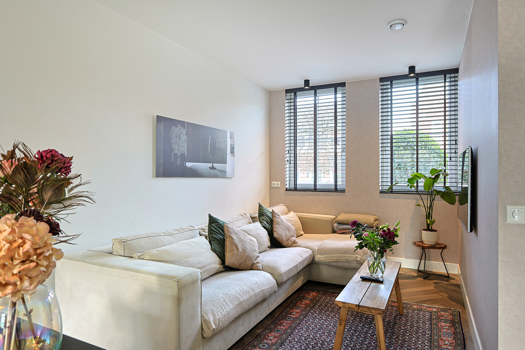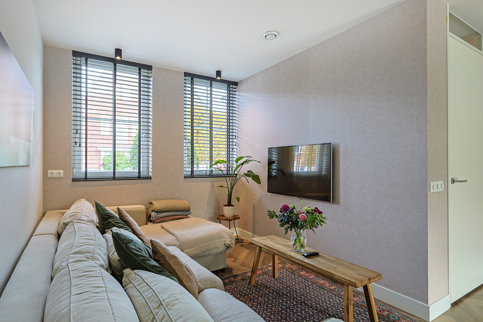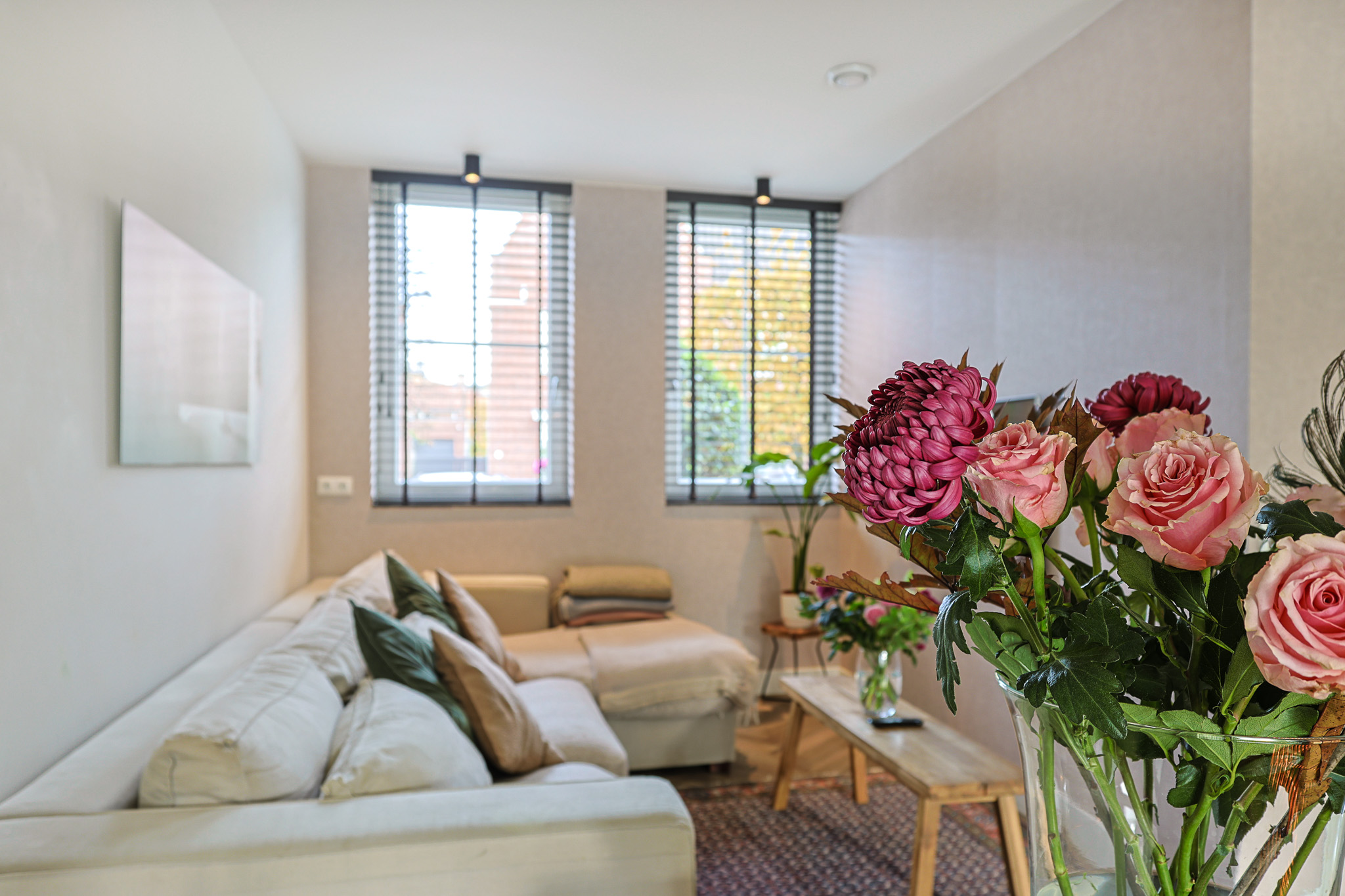 Royale en lichte woonkamer met pvc-vloer (2021). De woonkamer is tijdens de bouw in 2009 met twee meter uitgebouwd. In 2020 is de indeling vernieuwd en zijn de zithoek en de keuken omgedraaid qua positie. Aan zowel de voor- als achterzijde bevinden zich ramen met een draaikiepmechanisme. In het midden van de woning bevindt zich een ruime trapkast die veel extra opbergruimte biedt.