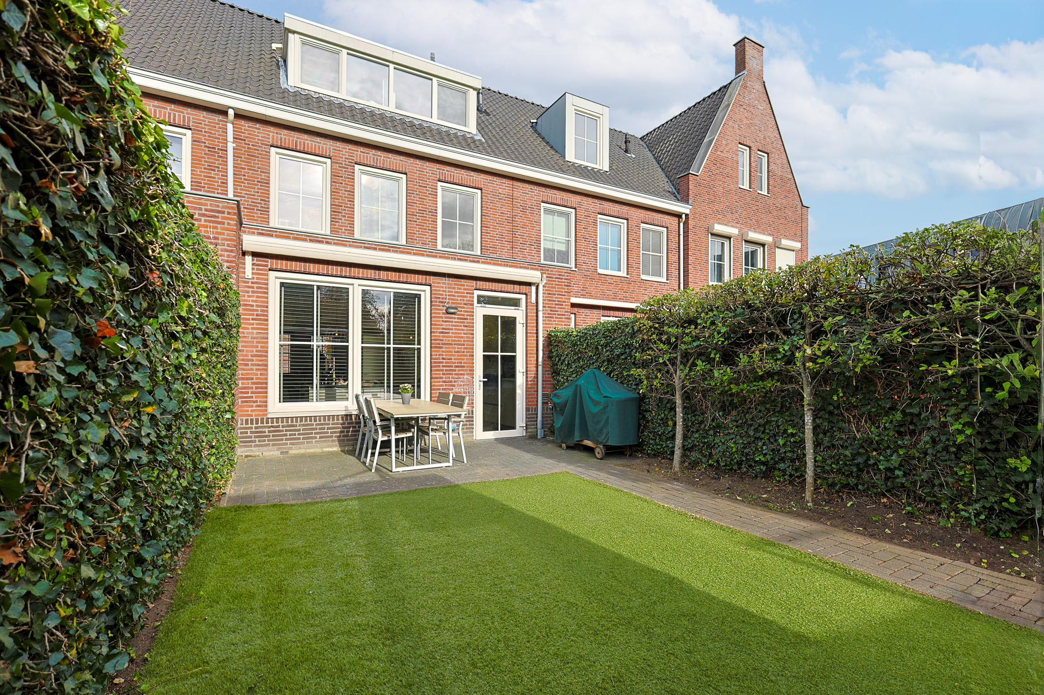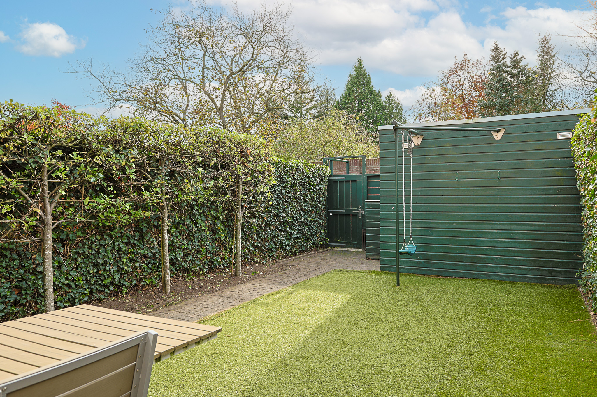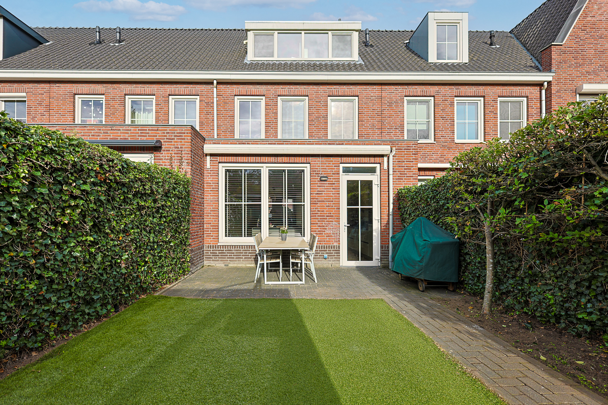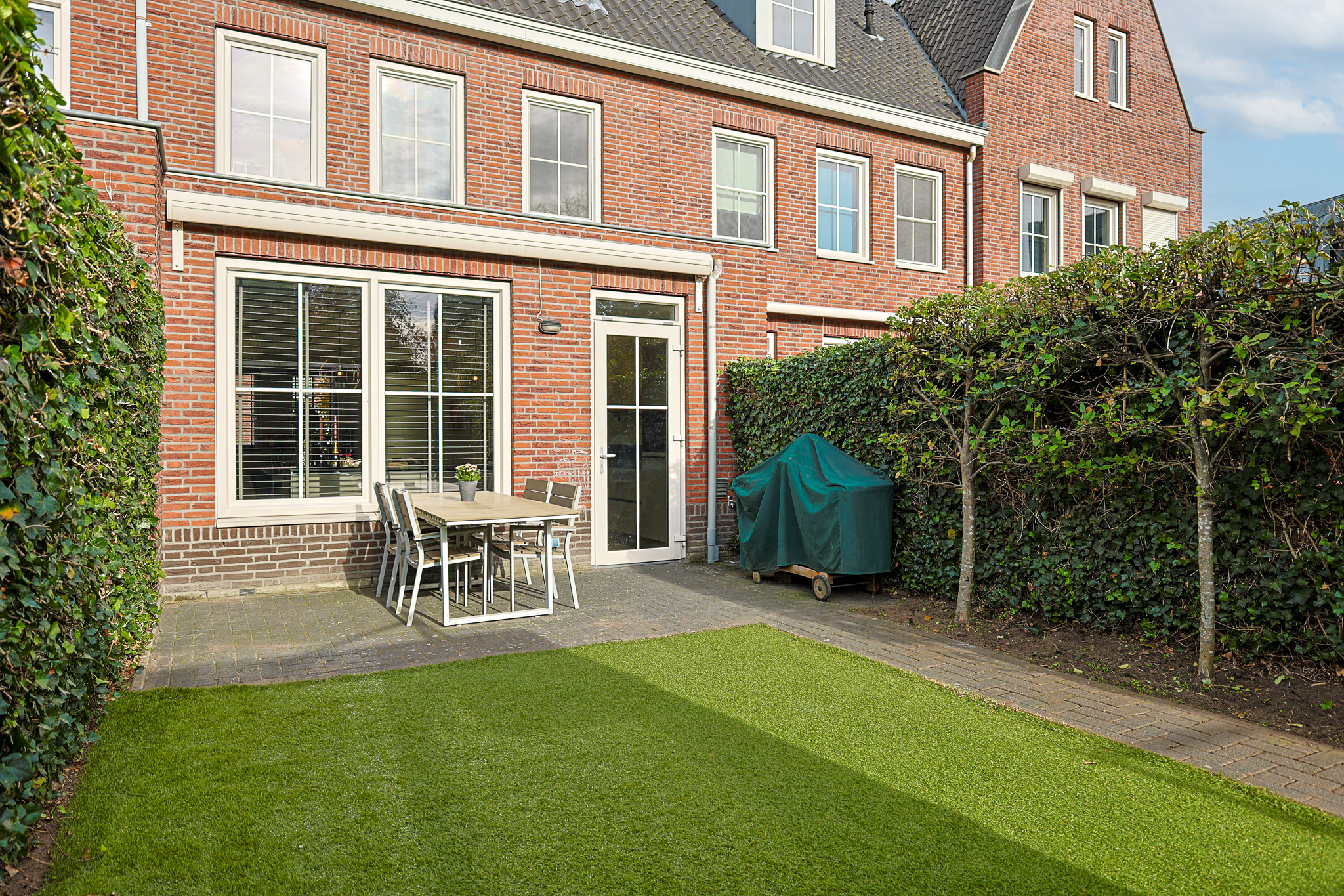 Zonnige, fraai aangelegde en groene tuin op het zuiden en zonder inkijk van achteren. De tuin beschikt over een terras met elektrisch bedienbare zonneluifel, kunstgras, sierbestrating, groene borders, een buitenkraan met afvoer, buitenverlichting en meerdere elektrapunten. Aan de achterzijde bevindt zich een achterom en een vrijstaande houten berging met elektra.