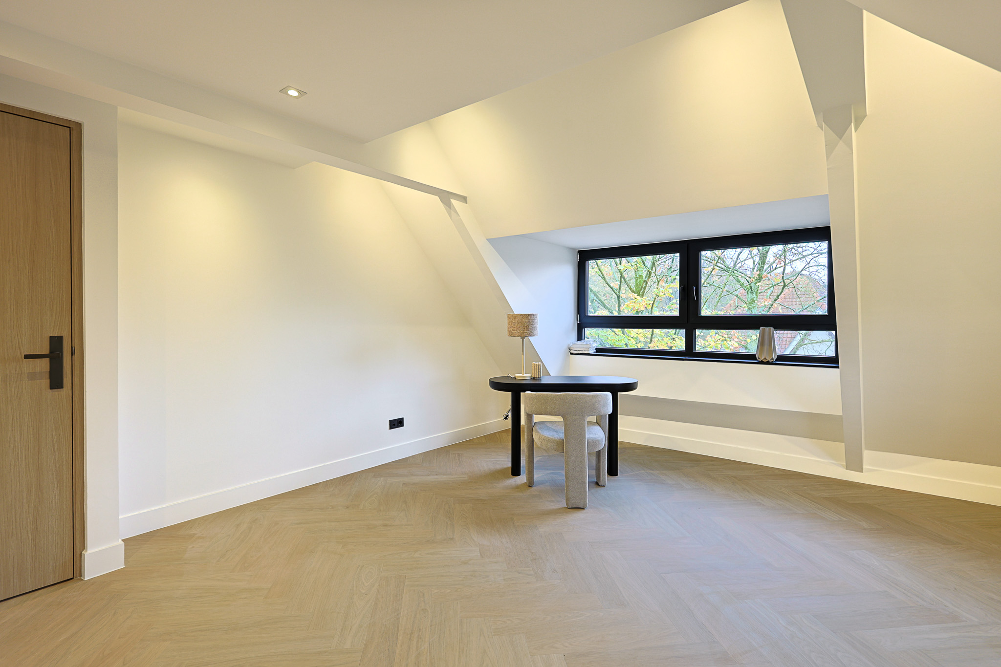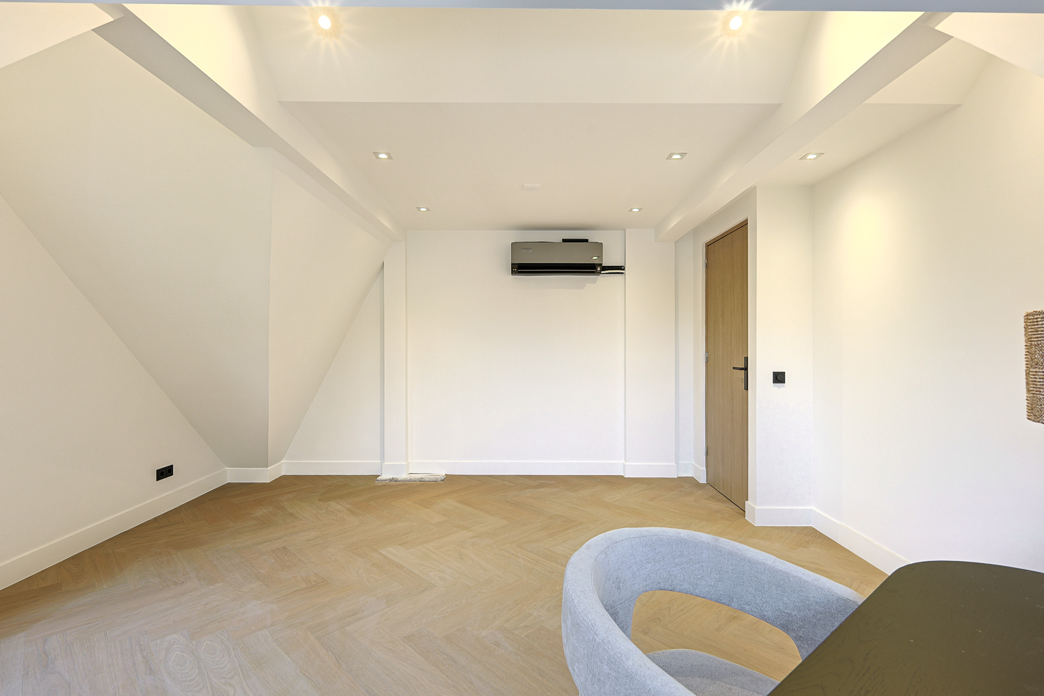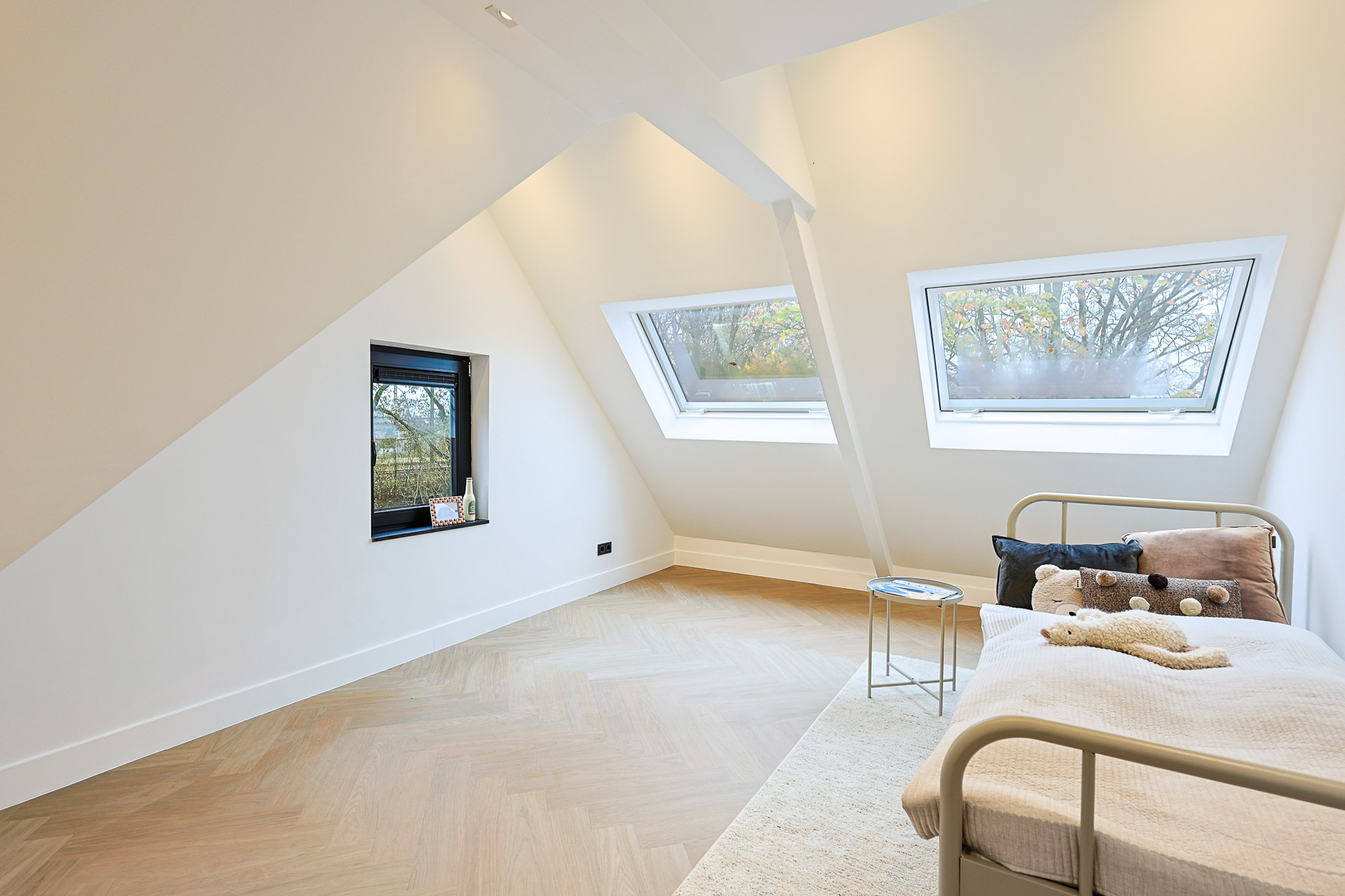 Ruime slaapkamer met veel licht dankzij meerdere ramen en dakkapel. Ook hier vind je airco, inbouwverlichting en een nette pvc-vloer.