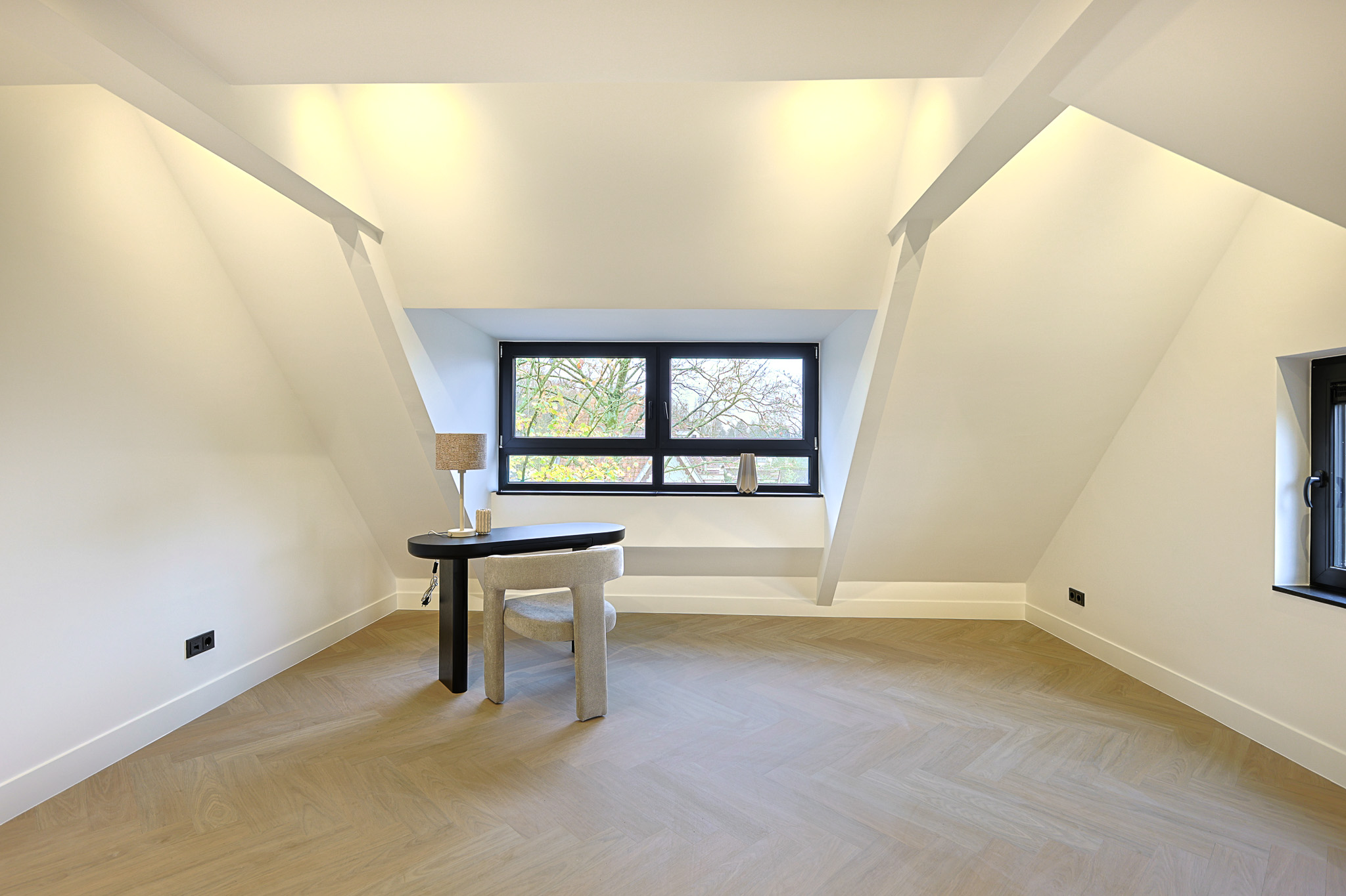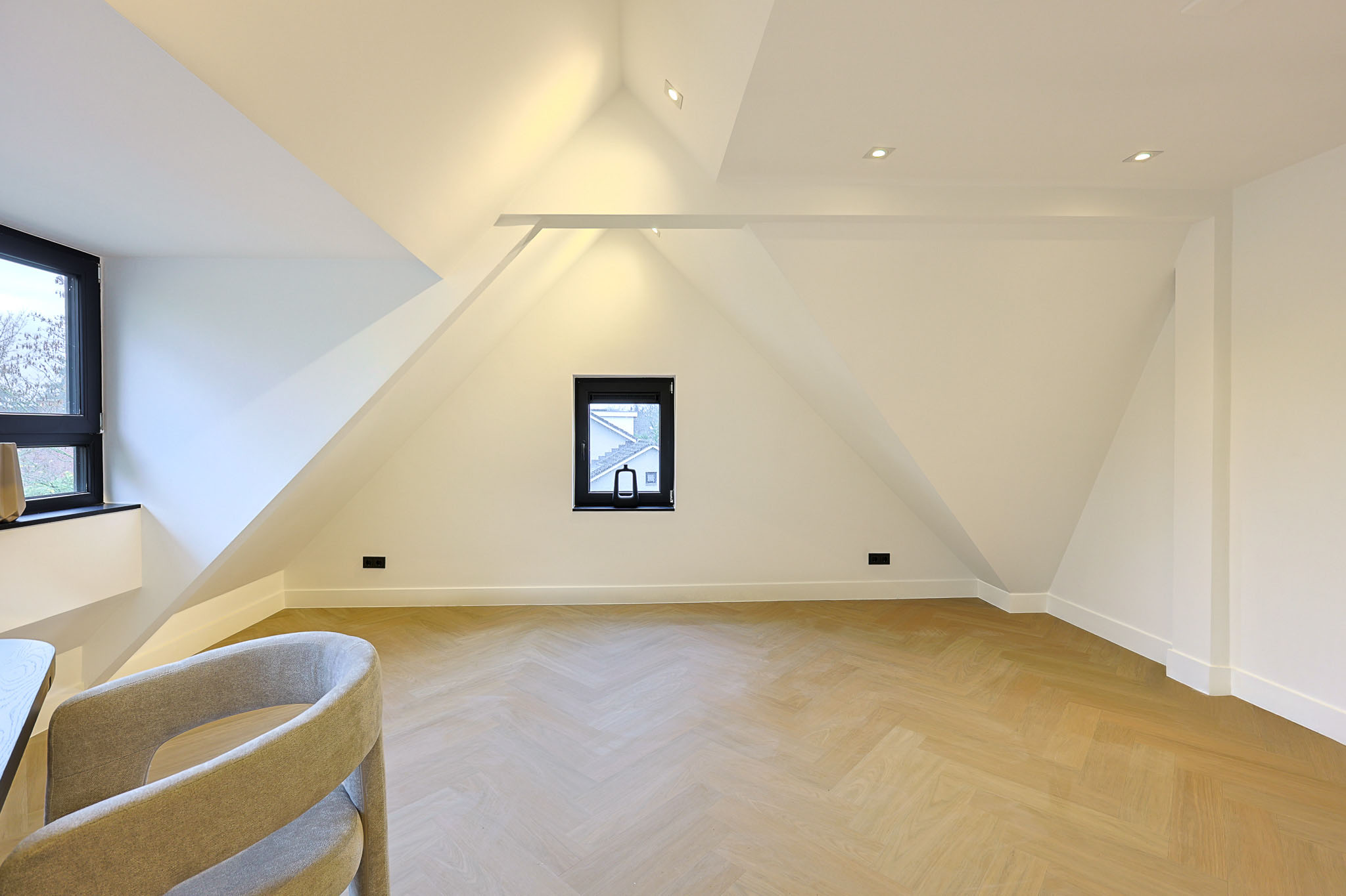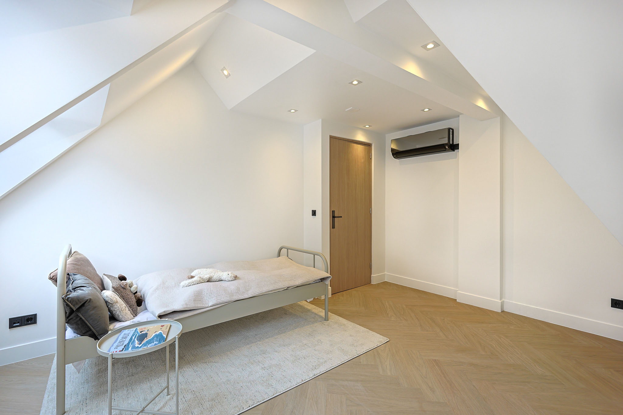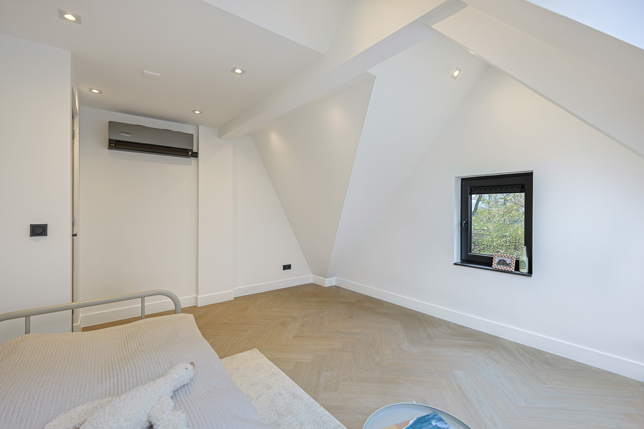 Ruime slaapkamer met veel licht dankzij meerdere ramen en dakkapel. Ook hier vind je airco, inbouwverlichting en een nette pvc-vloer.