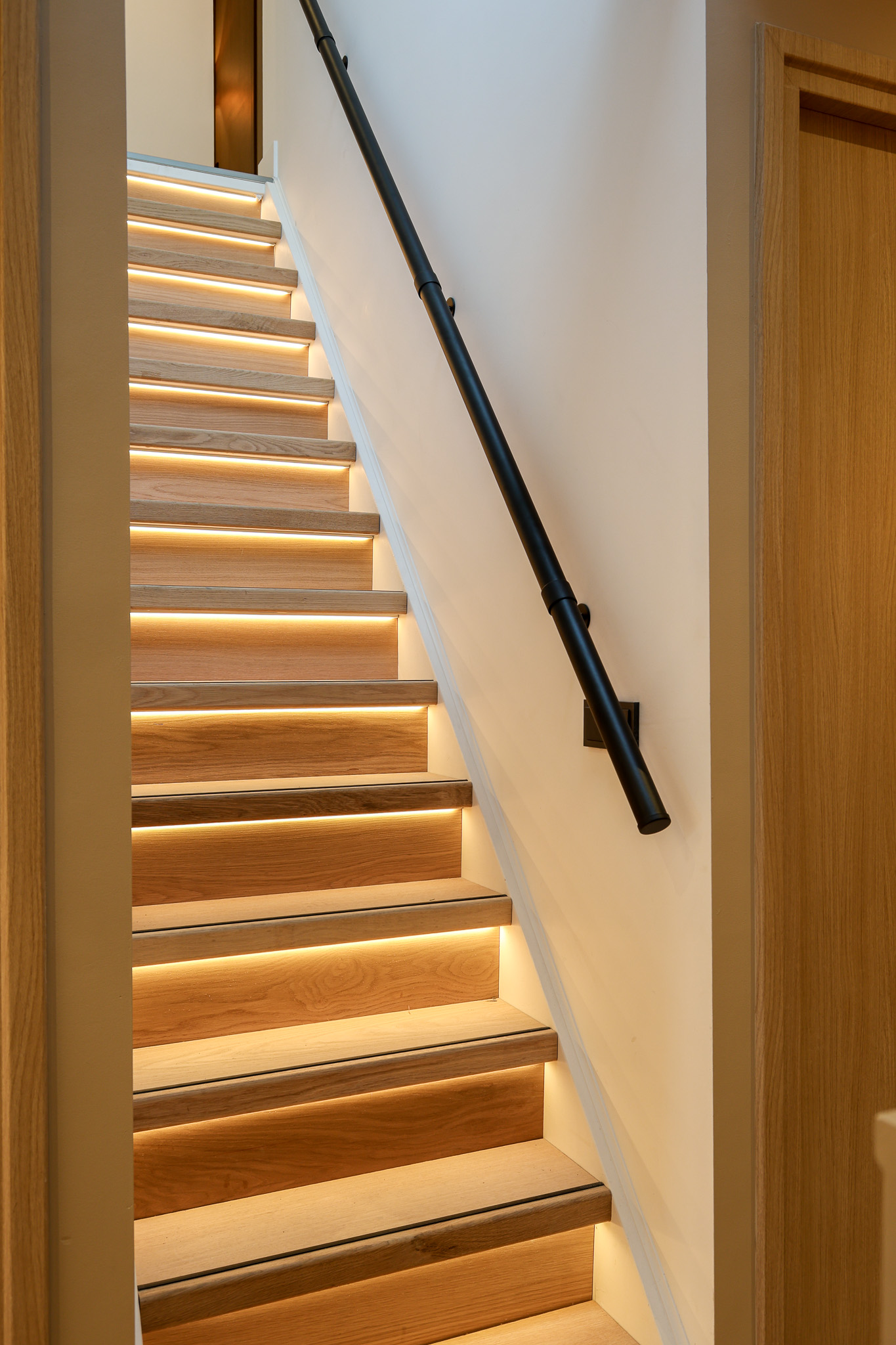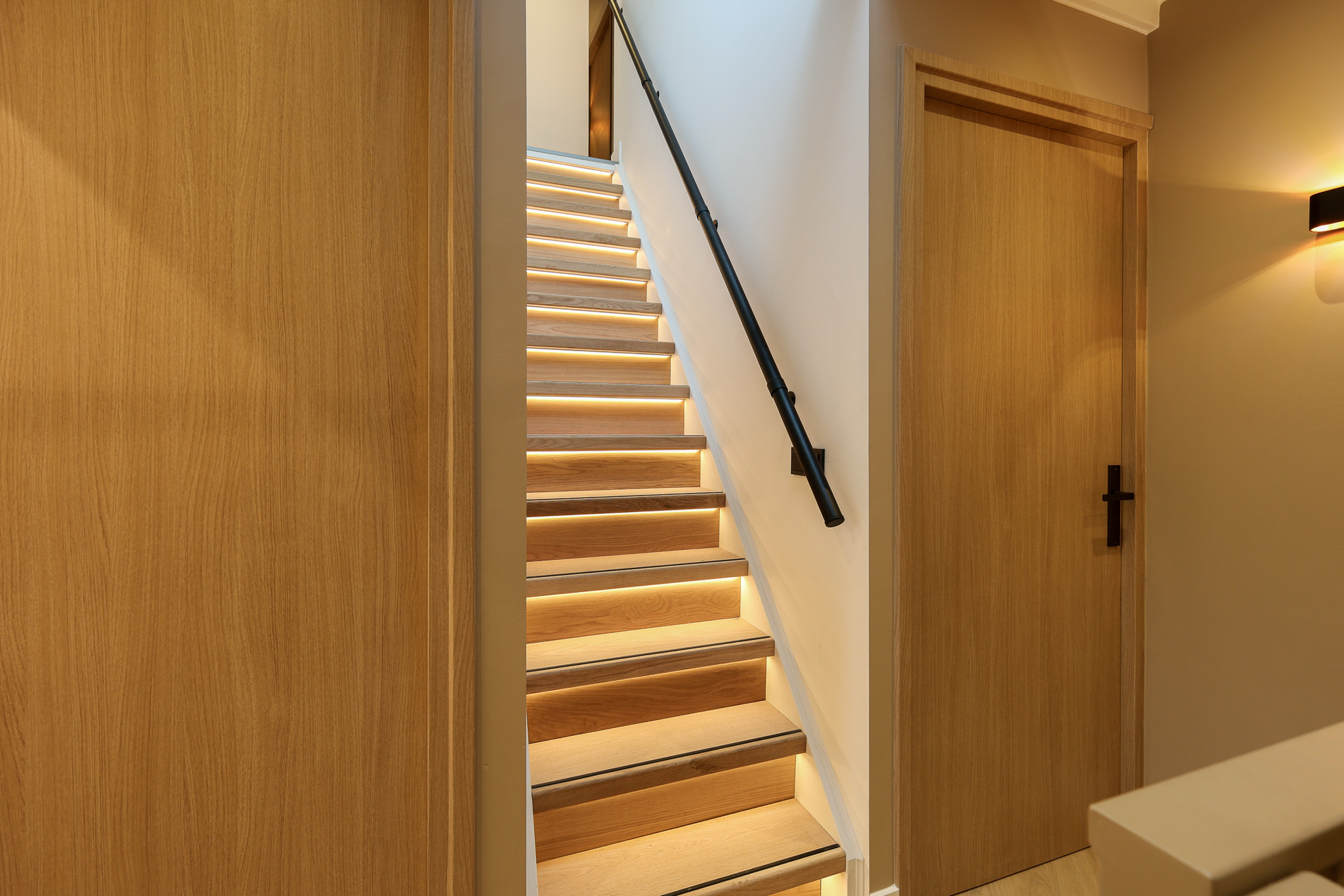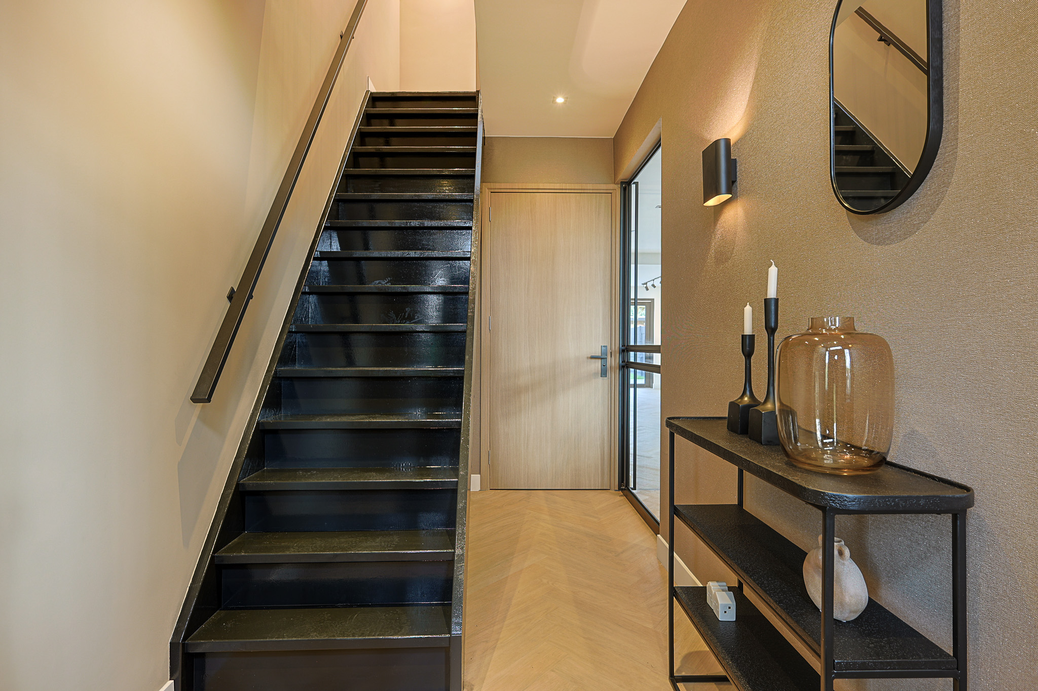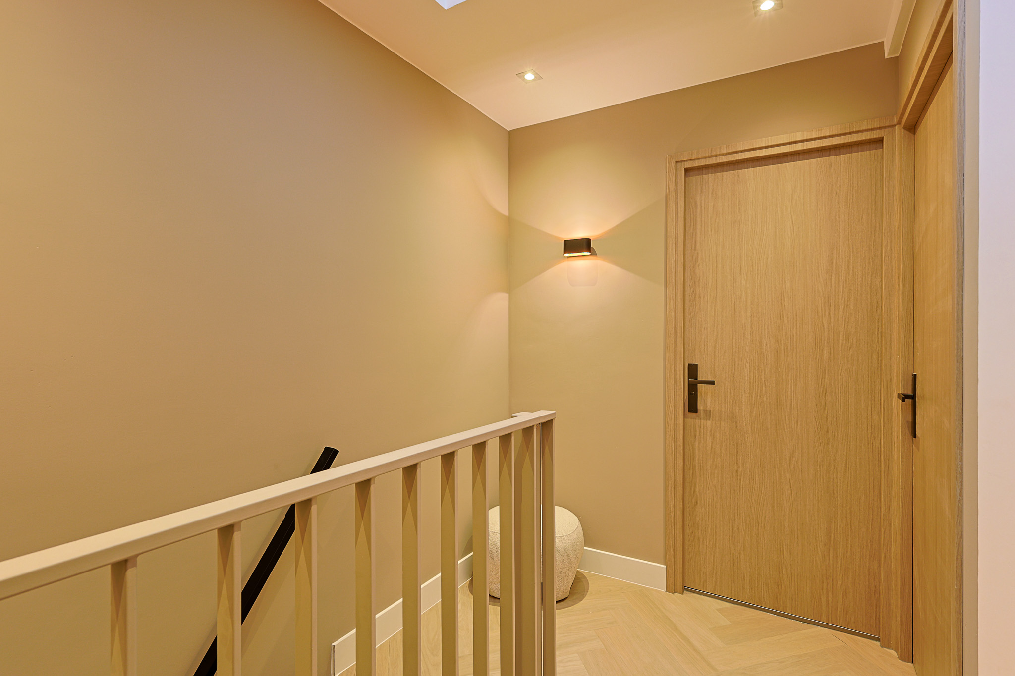 De chique overloop geeft toegang tot twee slaapkamers, twee badkamers en de trap naar de tweede verdieping. De trap is stijlvol verlicht en op deze verdieping ligt, net als elders, een hoogwaardige pvc-vloer.
