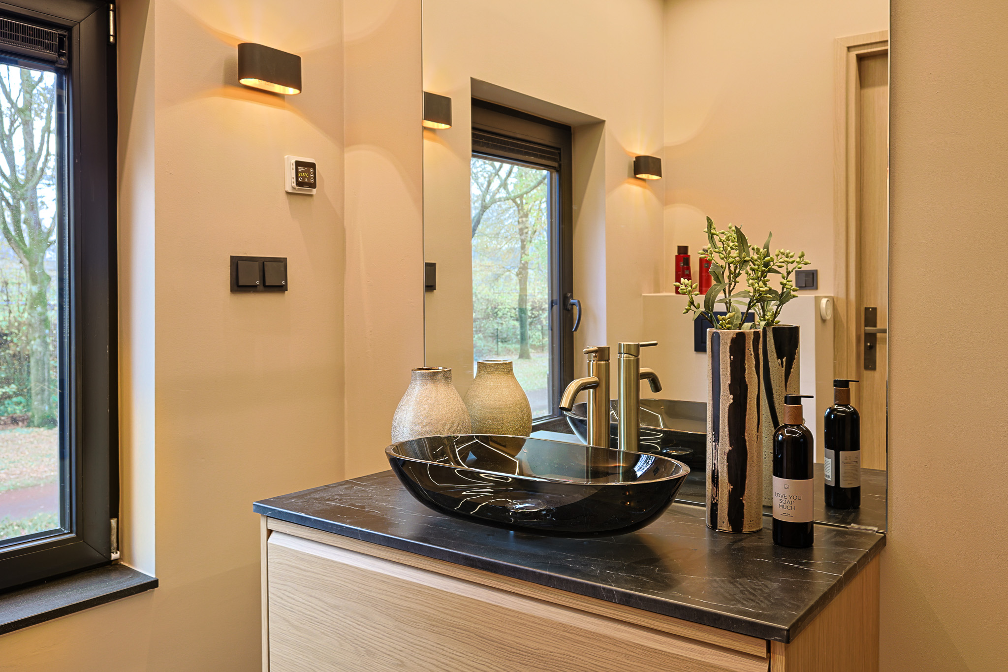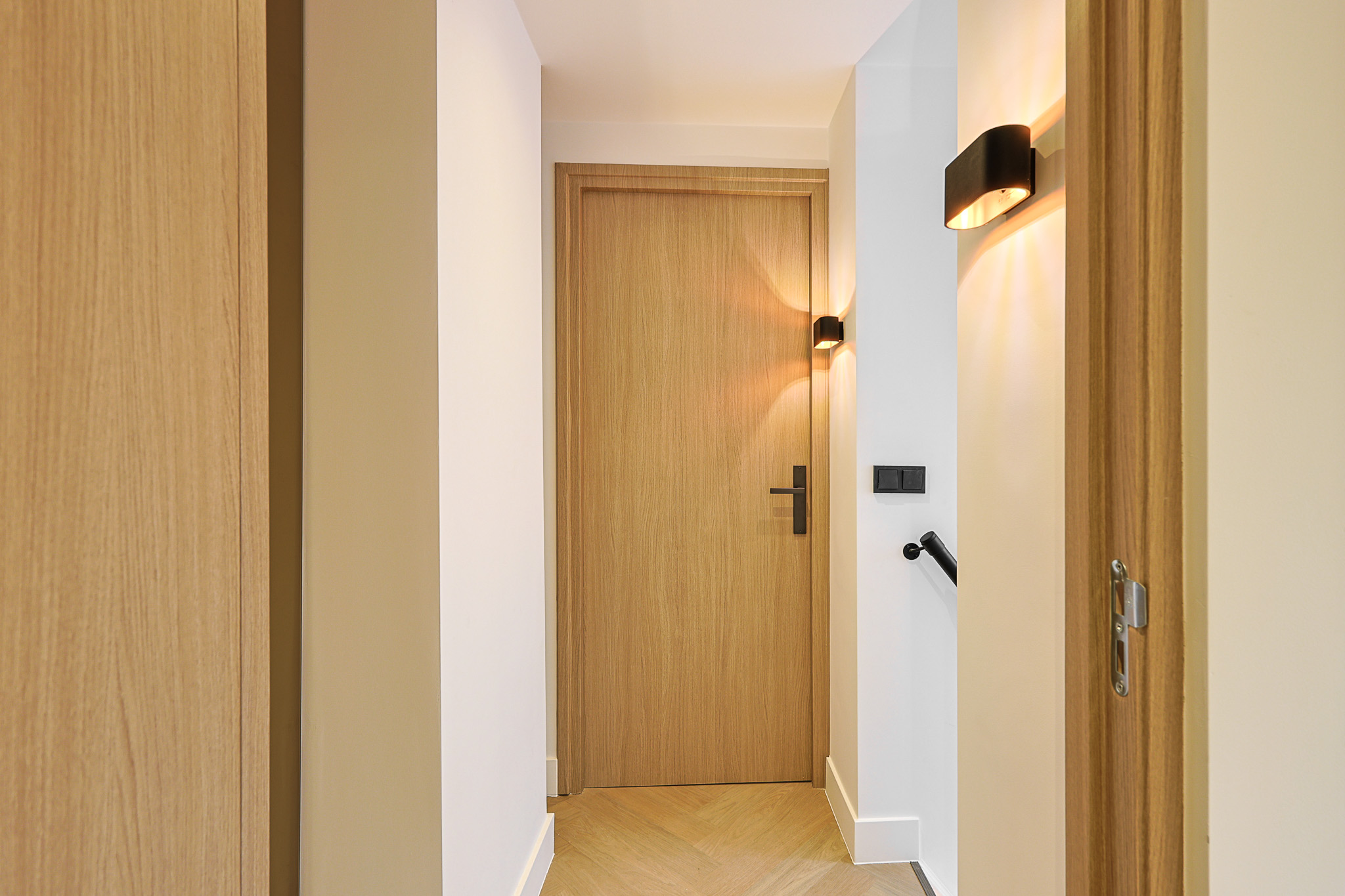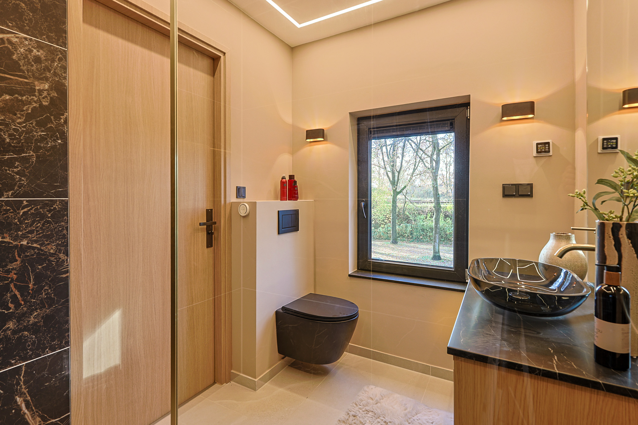 De chique overloop geeft toegang tot twee slaapkamers, twee badkamers en de trap naar de tweede verdieping. De trap is stijlvol verlicht en op deze verdieping ligt, net als elders, een hoogwaardige pvc-vloer.